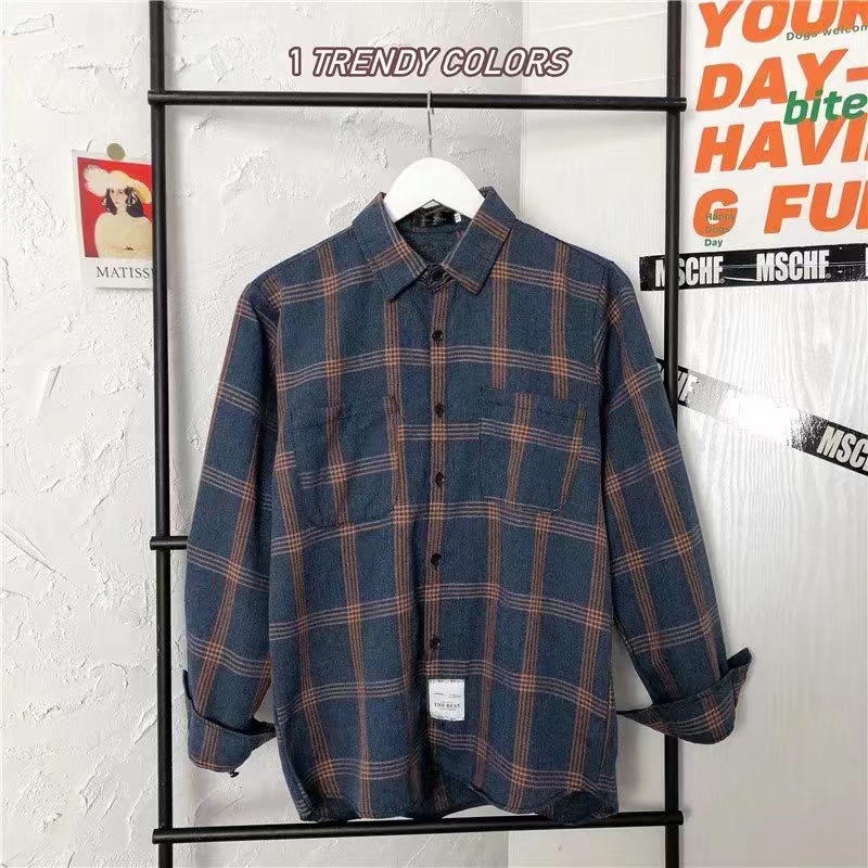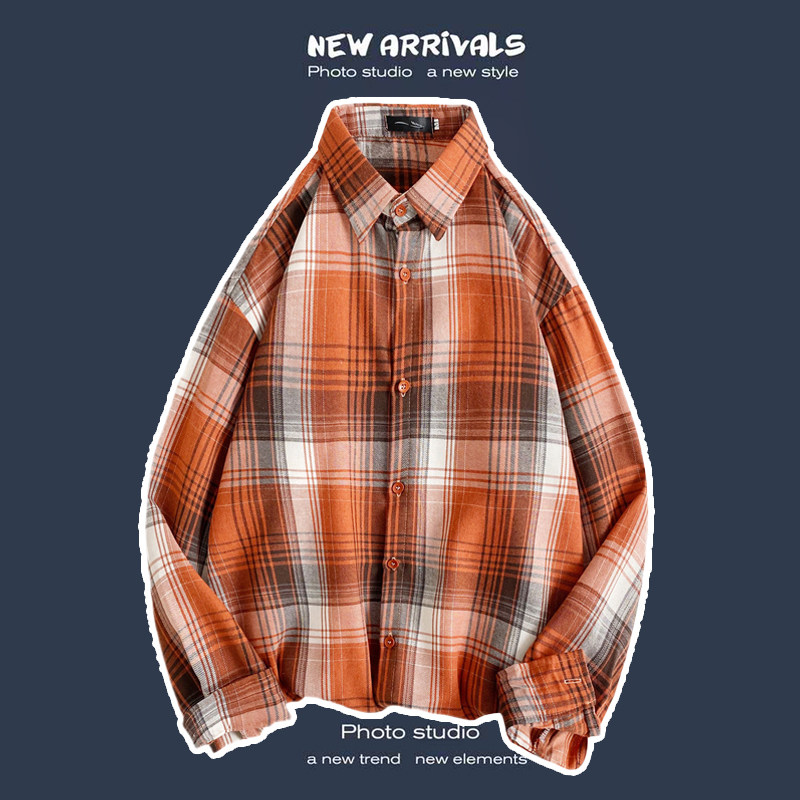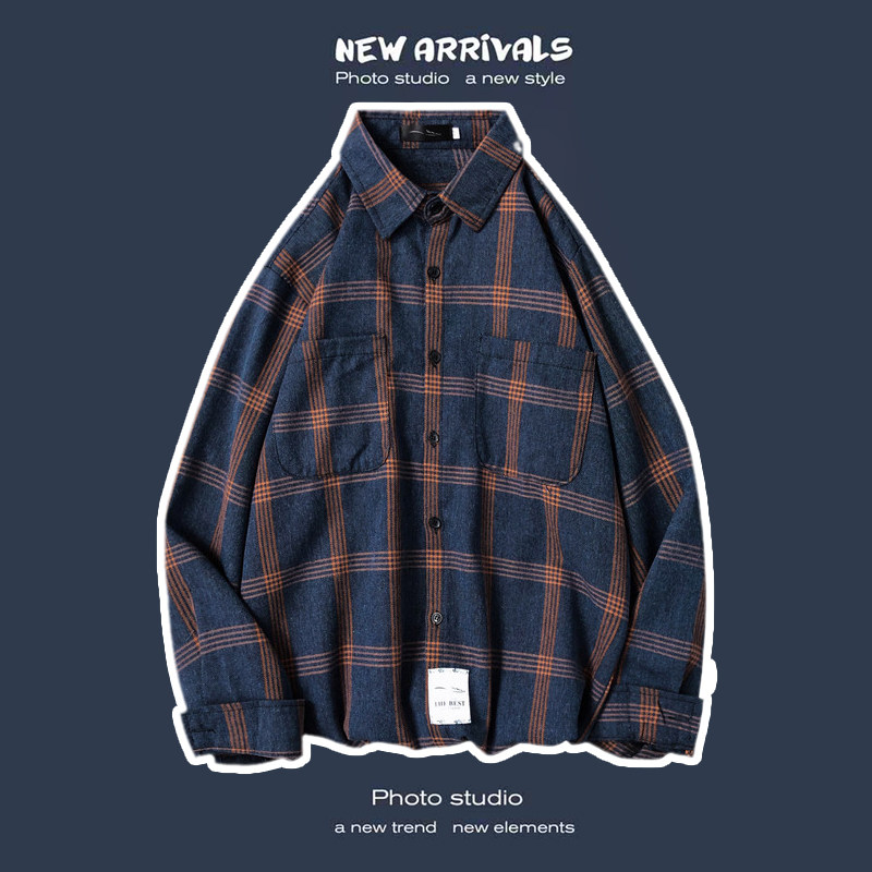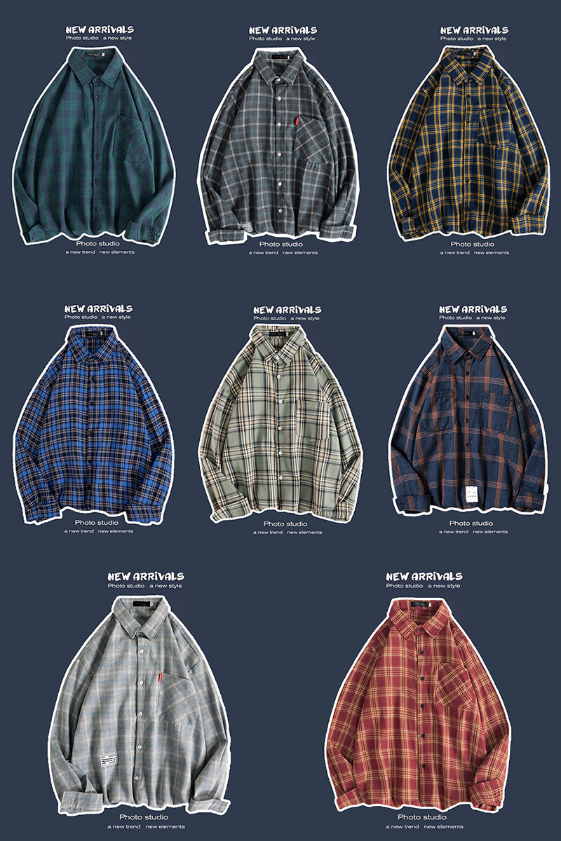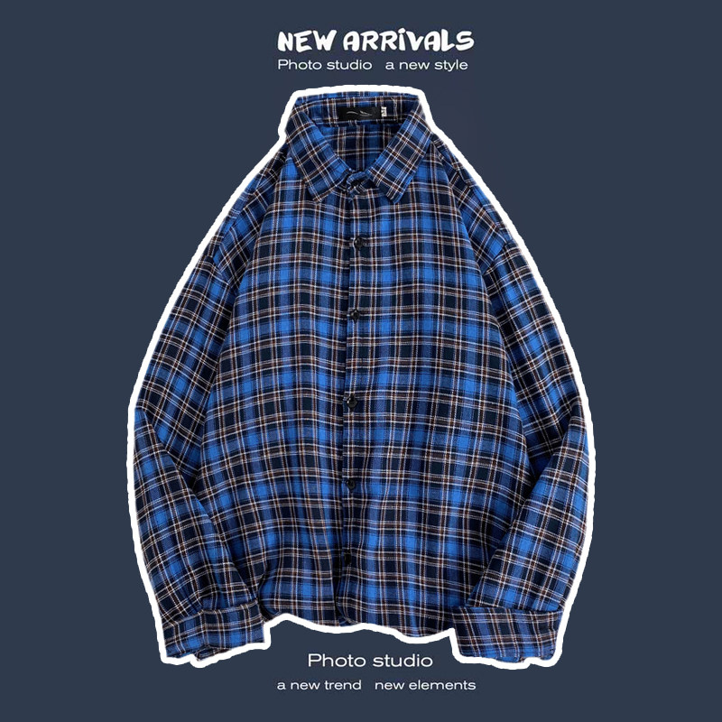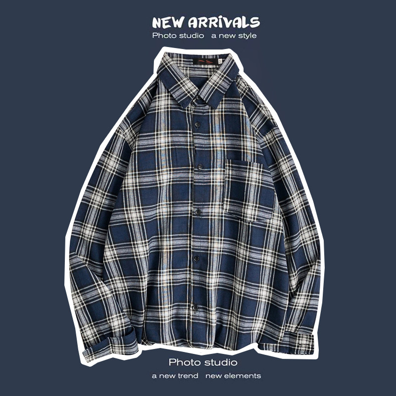 봄과 가을 셔츠 남자 유행 캐주얼 느슨한 긴팔 셔츠 홍콩 스타일 올 매치 커플의 빈티지 격자 자켓