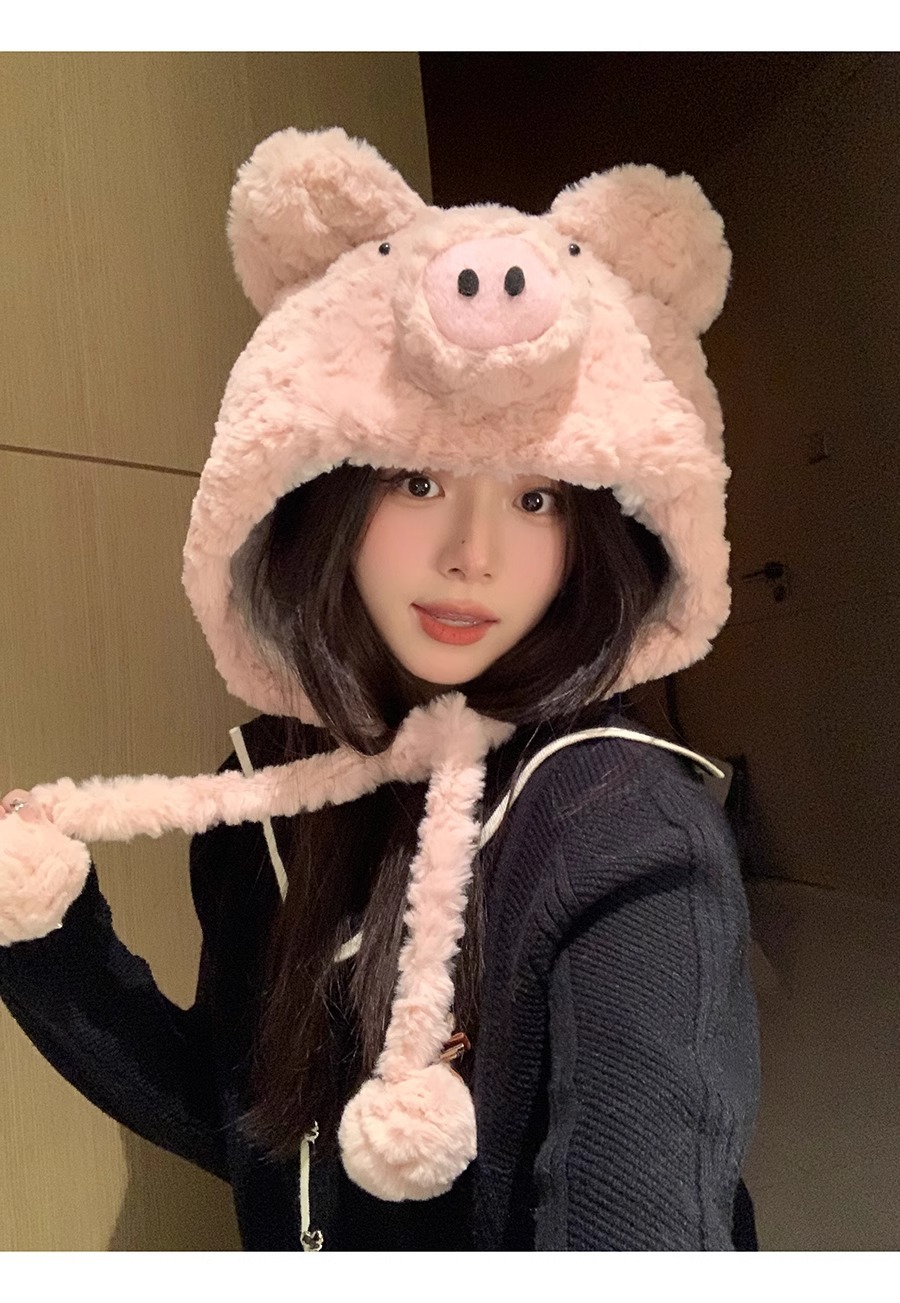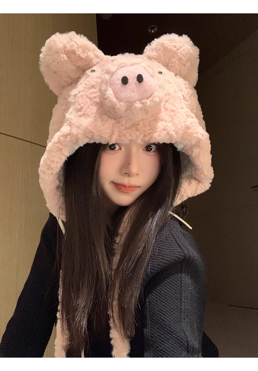 푹신한 만화 귀여운 돼지 모자 가을과 겨울 따뜻한 감기 기모 Baotou 모자 두꺼운 보호 푹신한 모자스토어 가기