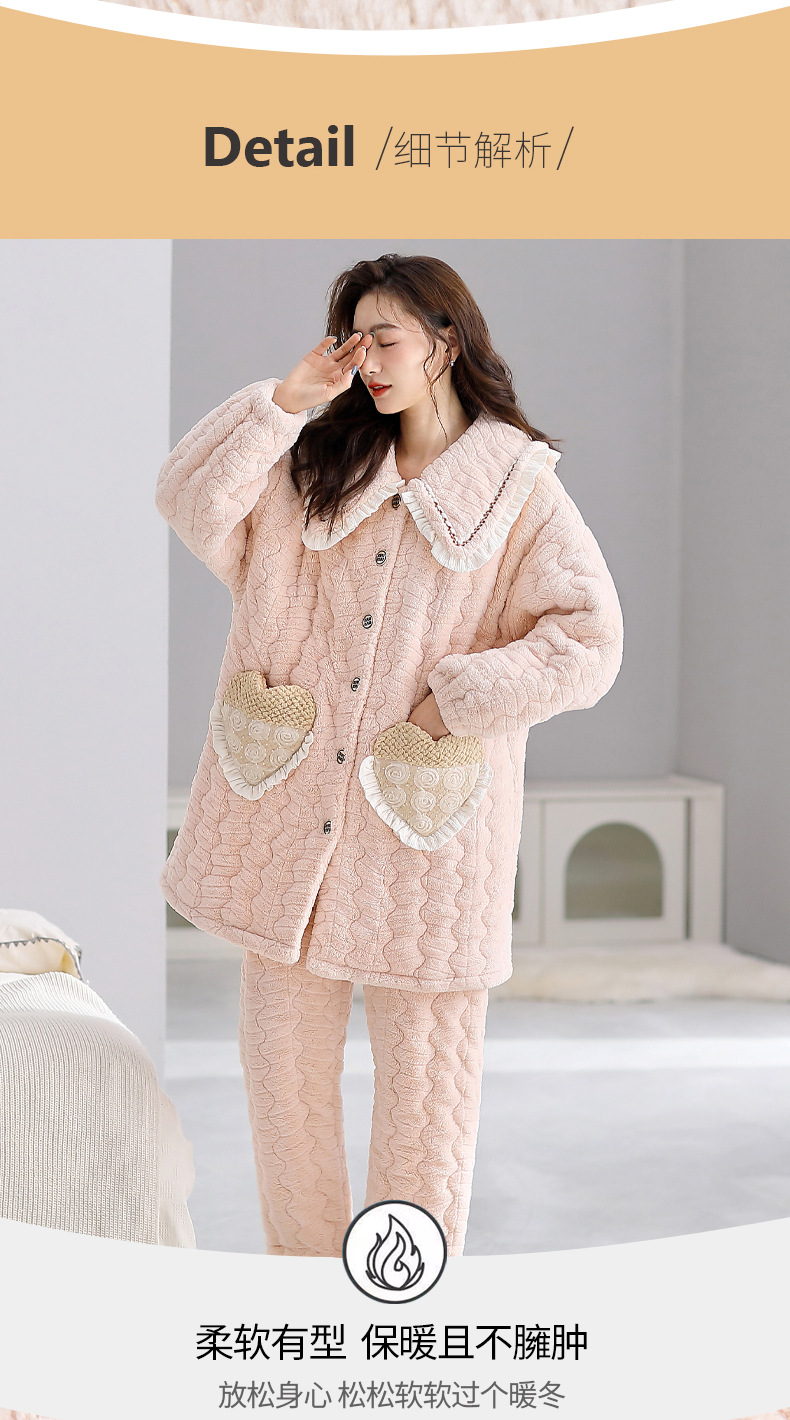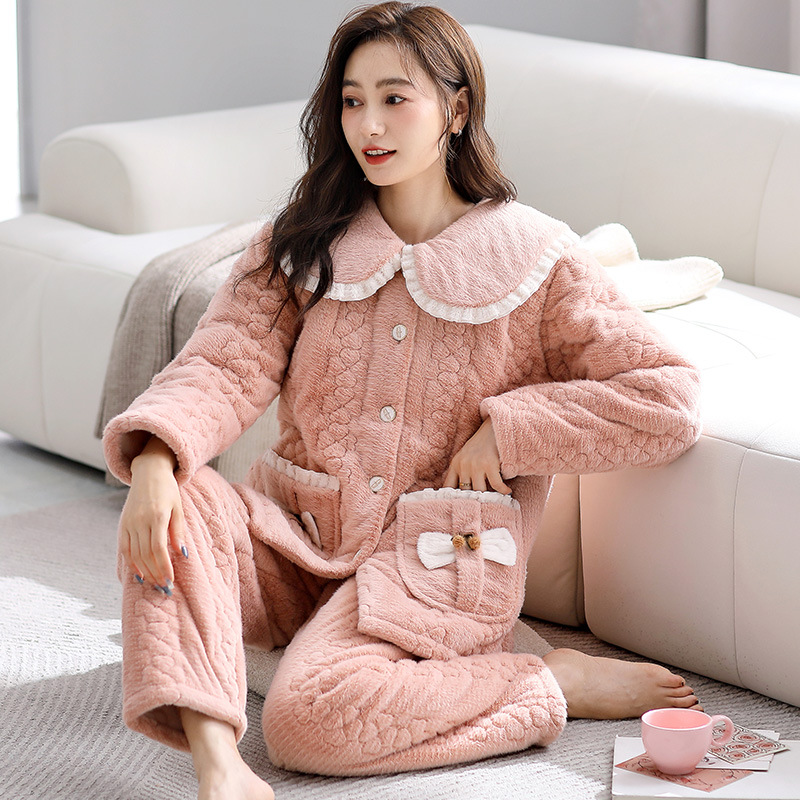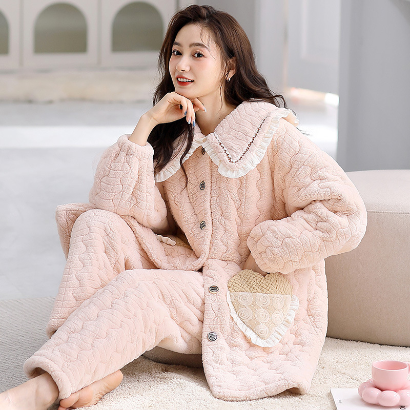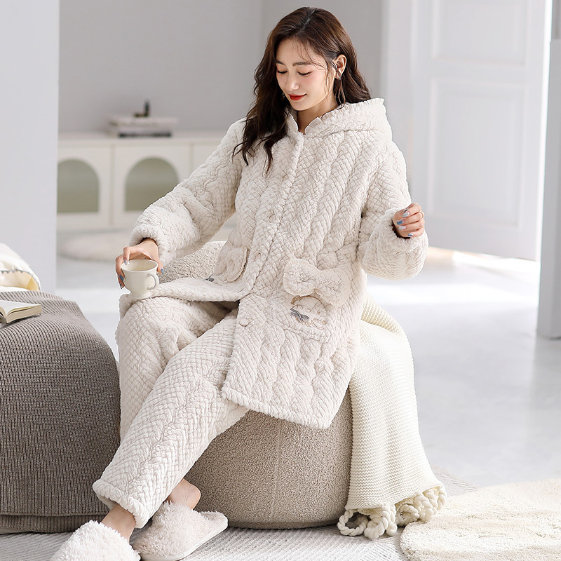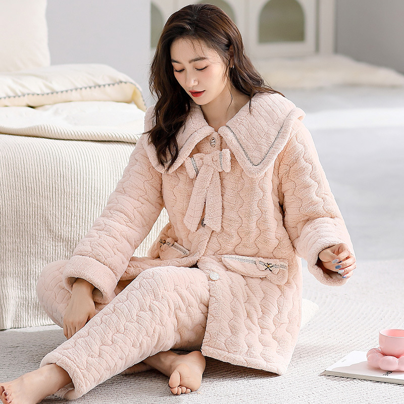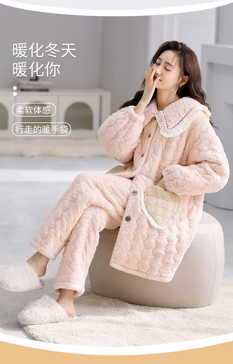 겨울 중간 길이의 산호 양털 3 층 면 패딩 재킷 파자마 여성 기모 두꺼운 긴 대형 옷깃 홈 옷 세트스토어 가기
