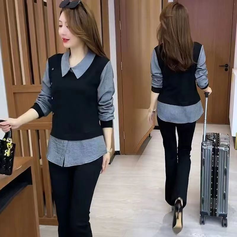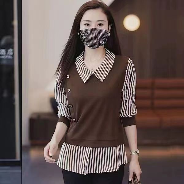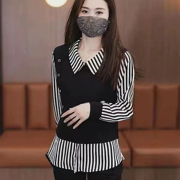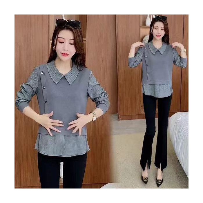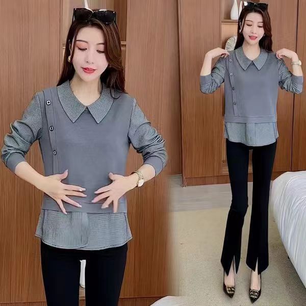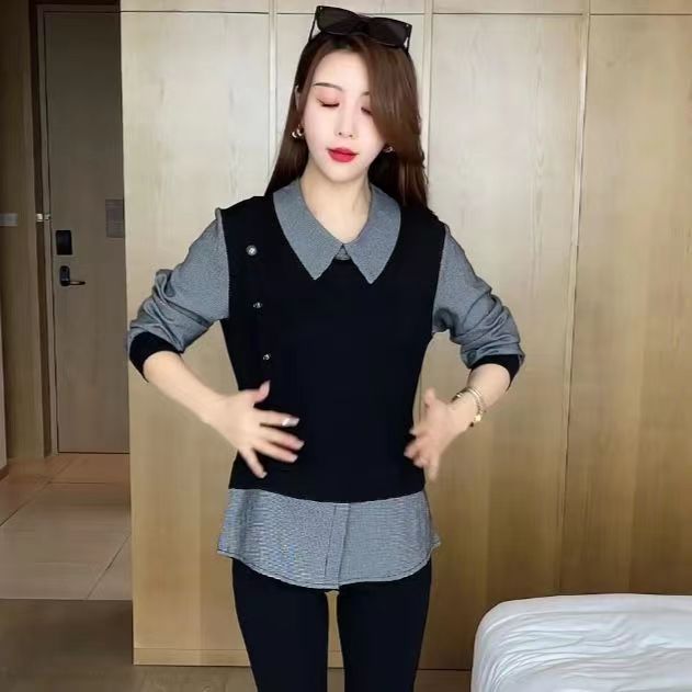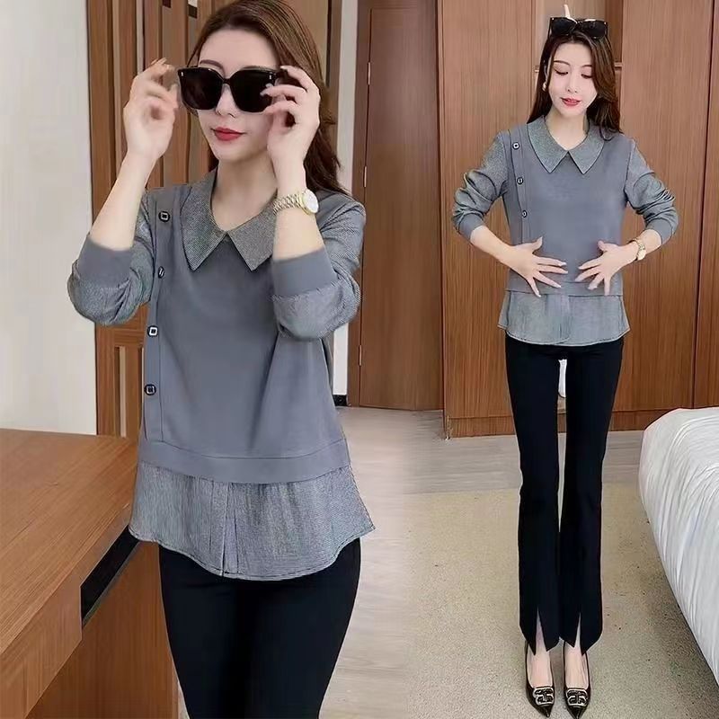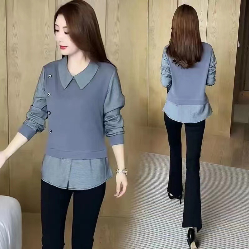 가짜 투피스 셔츠 여성 디자인 센스 탑 2024 가을 새 긴팔베이스 셔츠 느슨한 배 덮개 셔츠스토어 가기