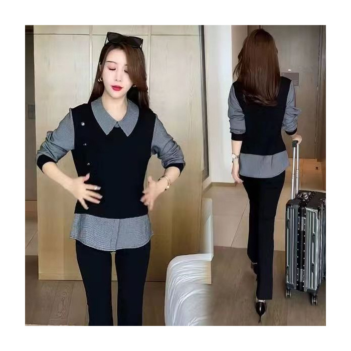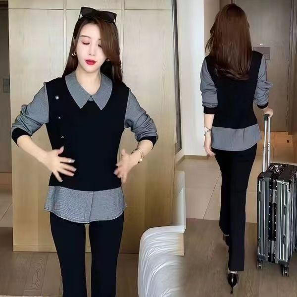 가짜 투피스 셔츠 여성 디자인 센스 탑 2024 가을 새 긴팔베이스 셔츠 느슨한 배 덮개 셔츠