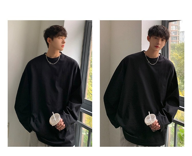솔리드 컬러 티셔츠 남자 사계절 얇은 트렌디 브랜드 청소년 느슨한 긴 소매 스웨트 셔츠 봄 가을 무거운 내부 탑스토어 가기