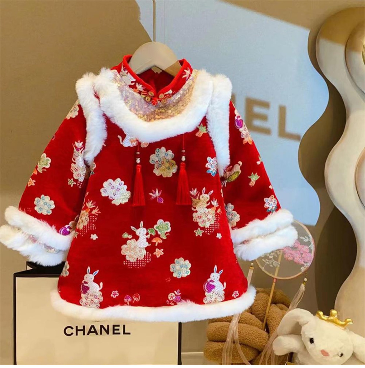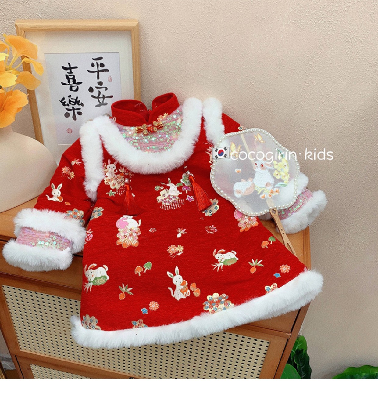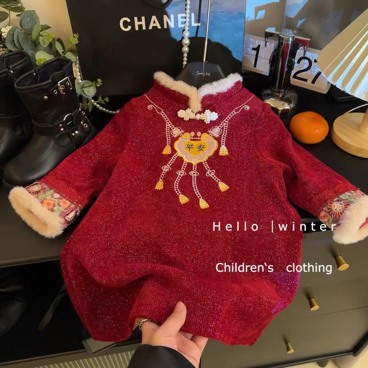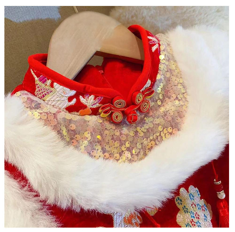 여자 탕 세트 원피스 새 겨울 중국 스타일 세련된 아기 두꺼운 청삼 신년 원피스 도매스토어 가기