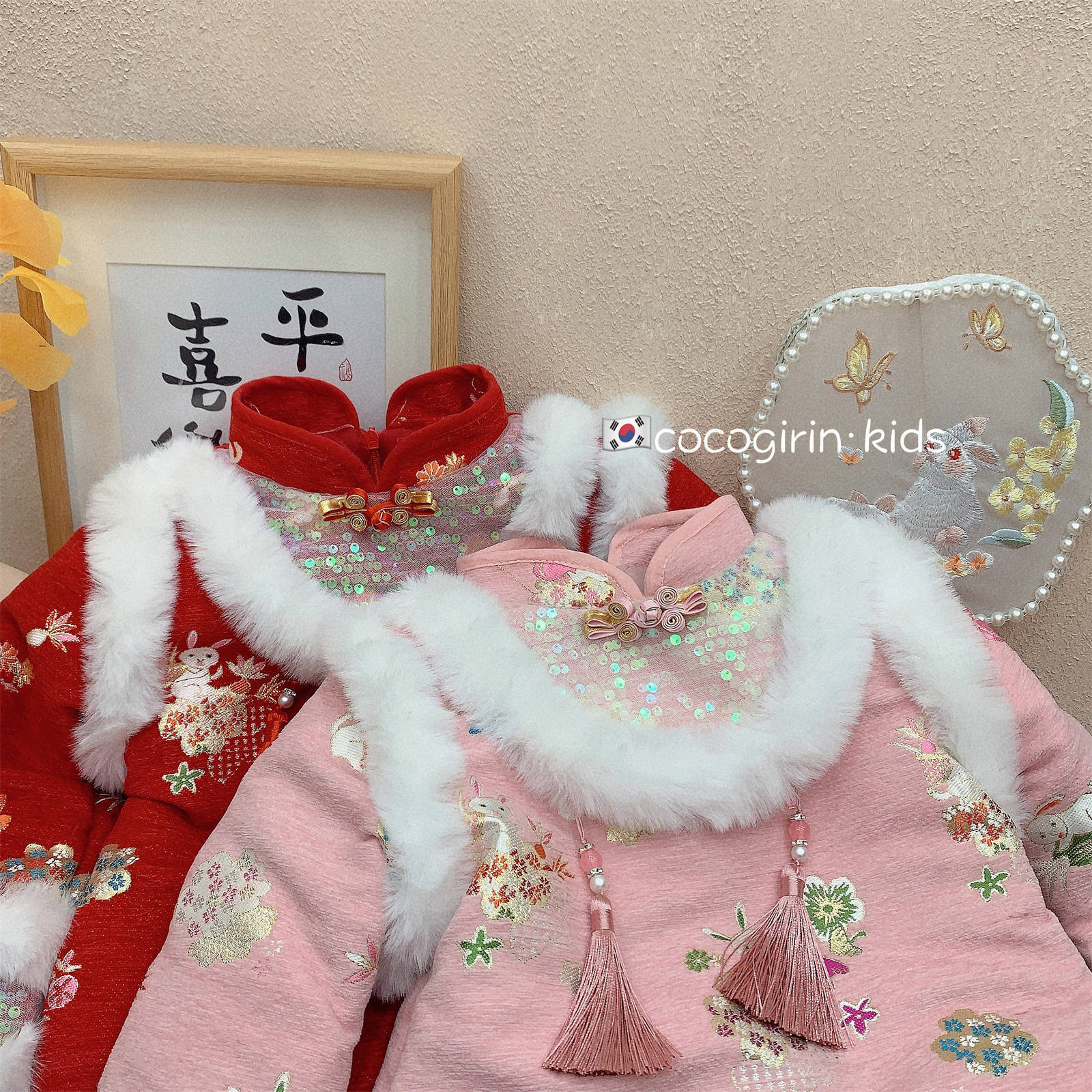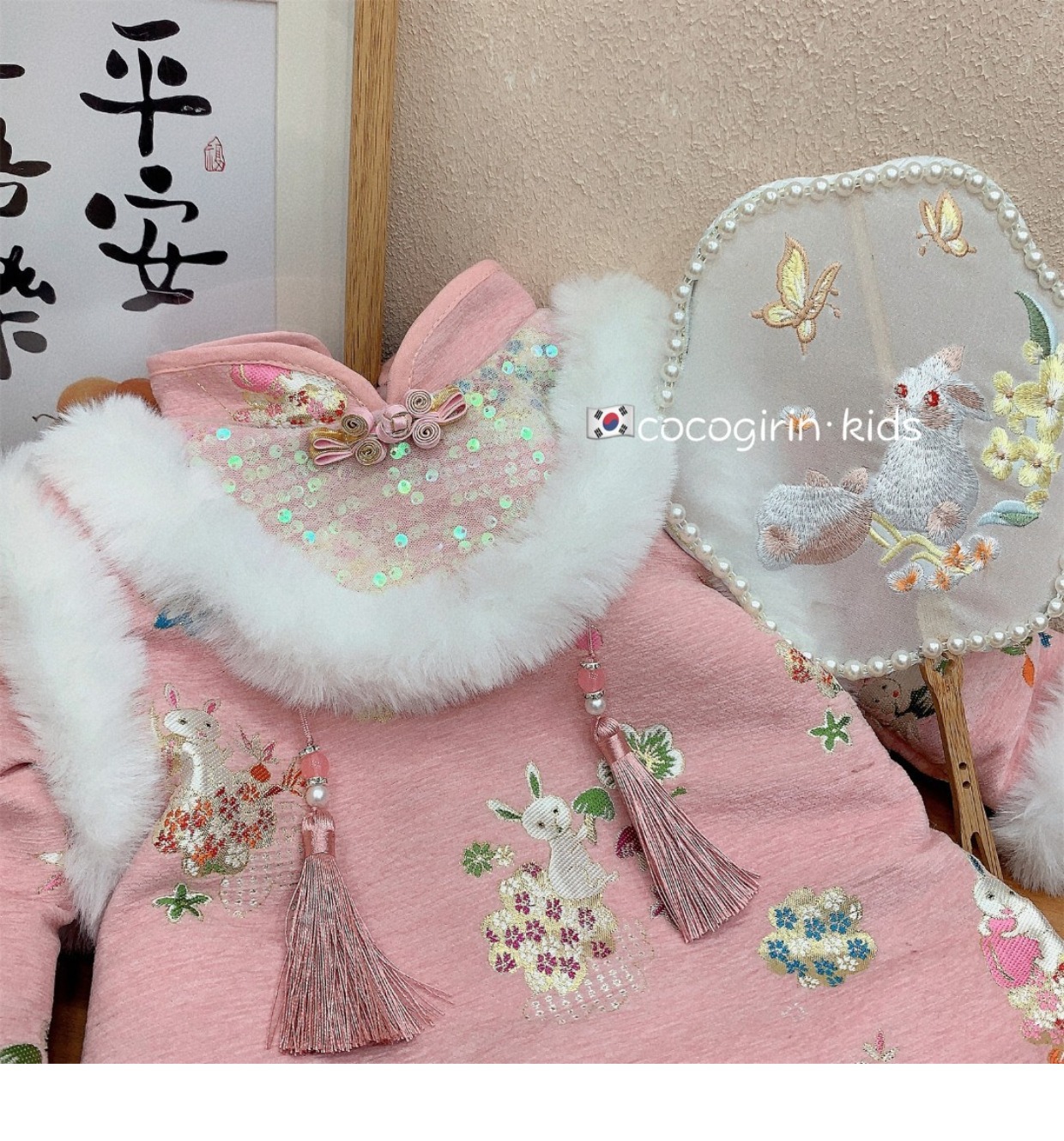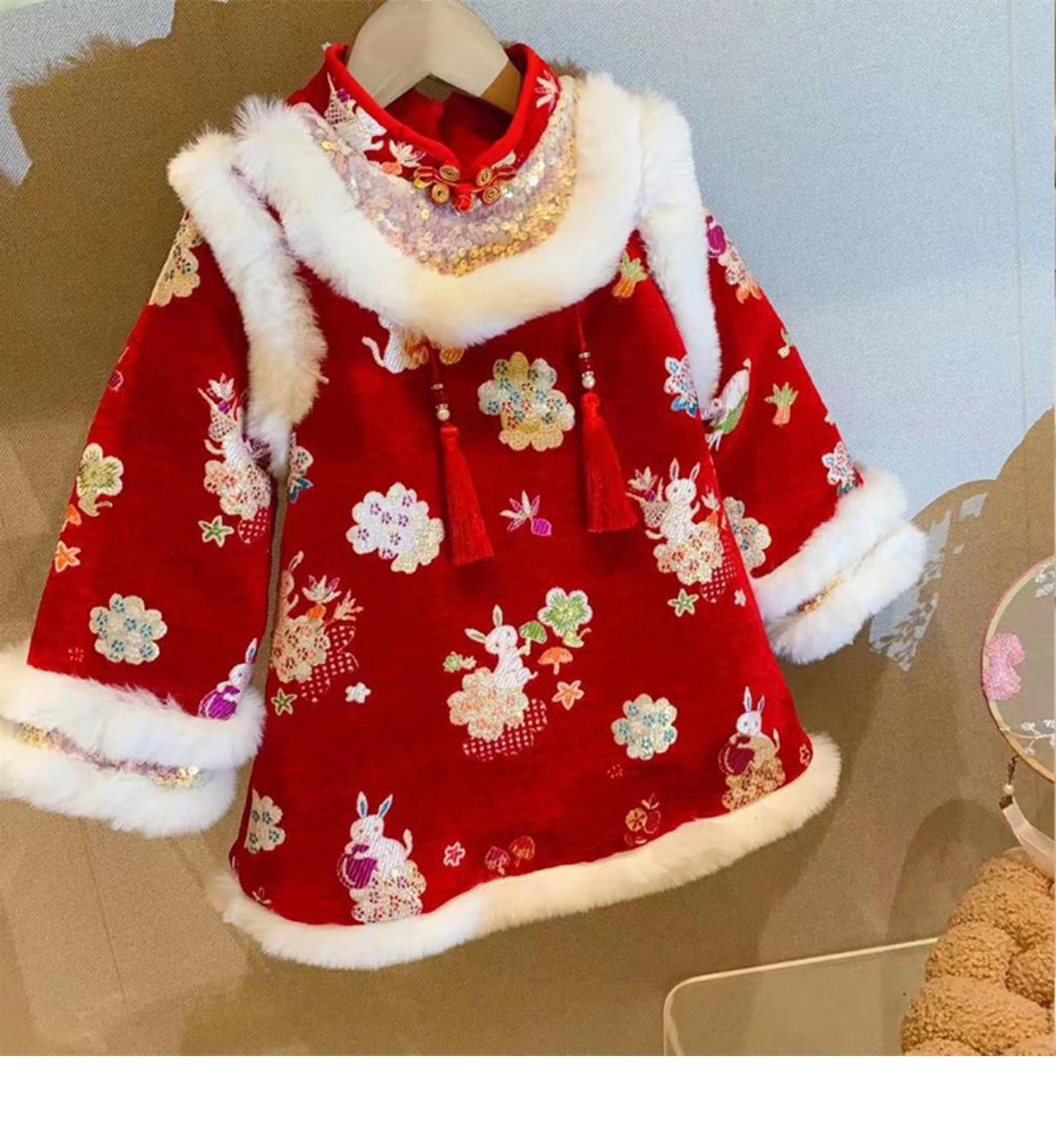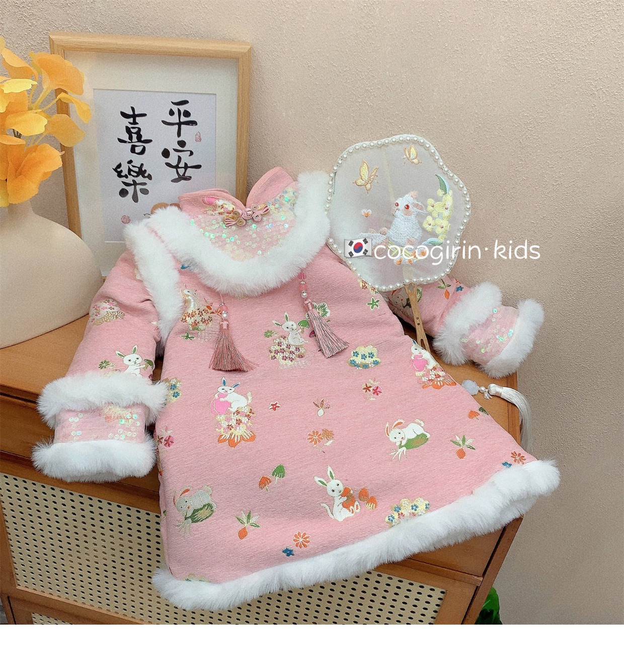 여자 탕 세트 원피스 새 겨울 중국 스타일 세련된 아기 두꺼운 청삼 신년 원피스 도매스토어 가기