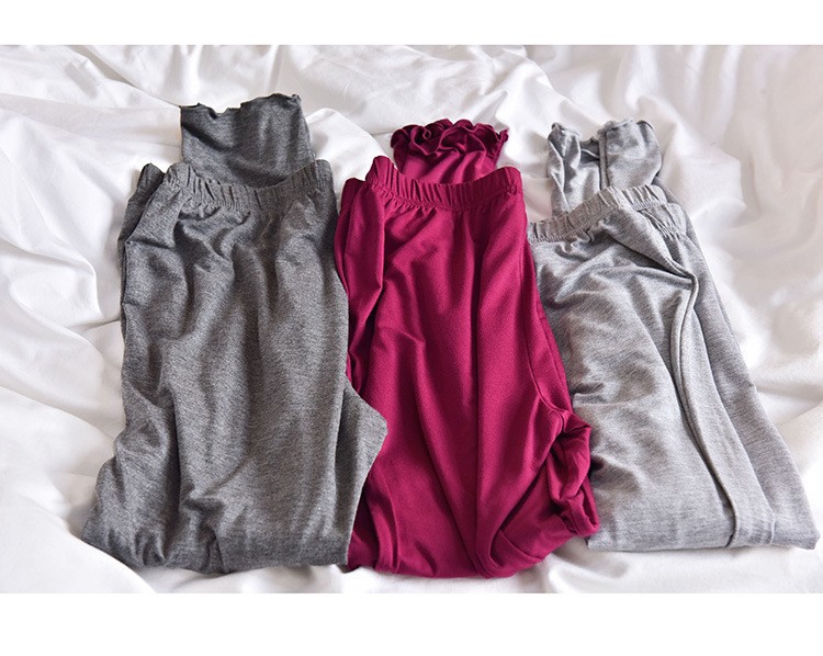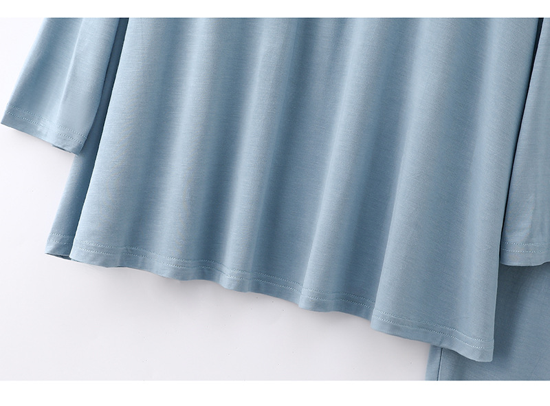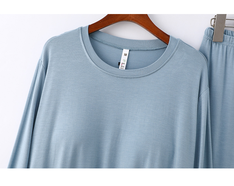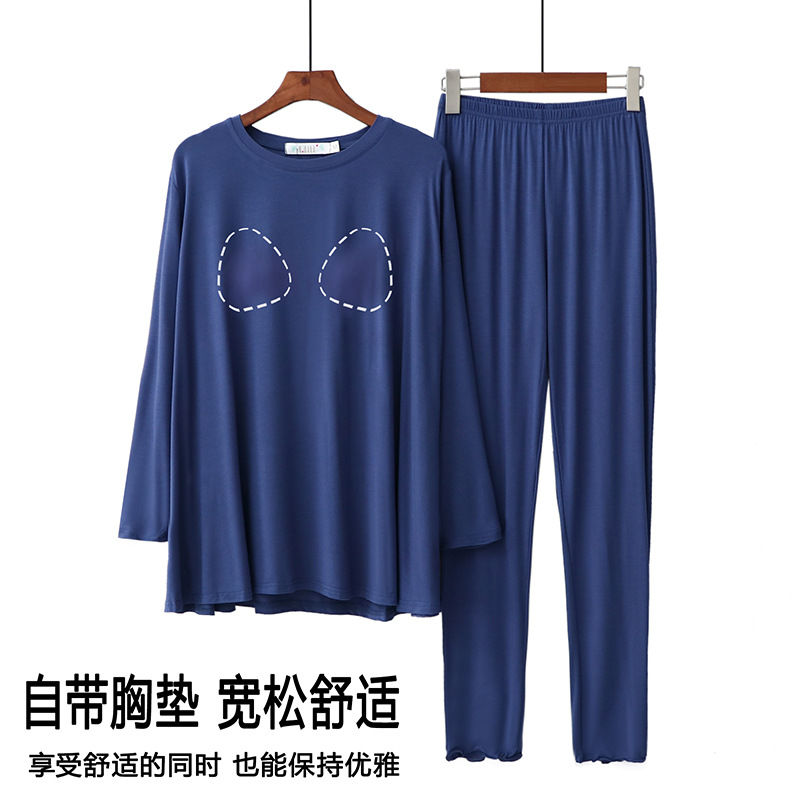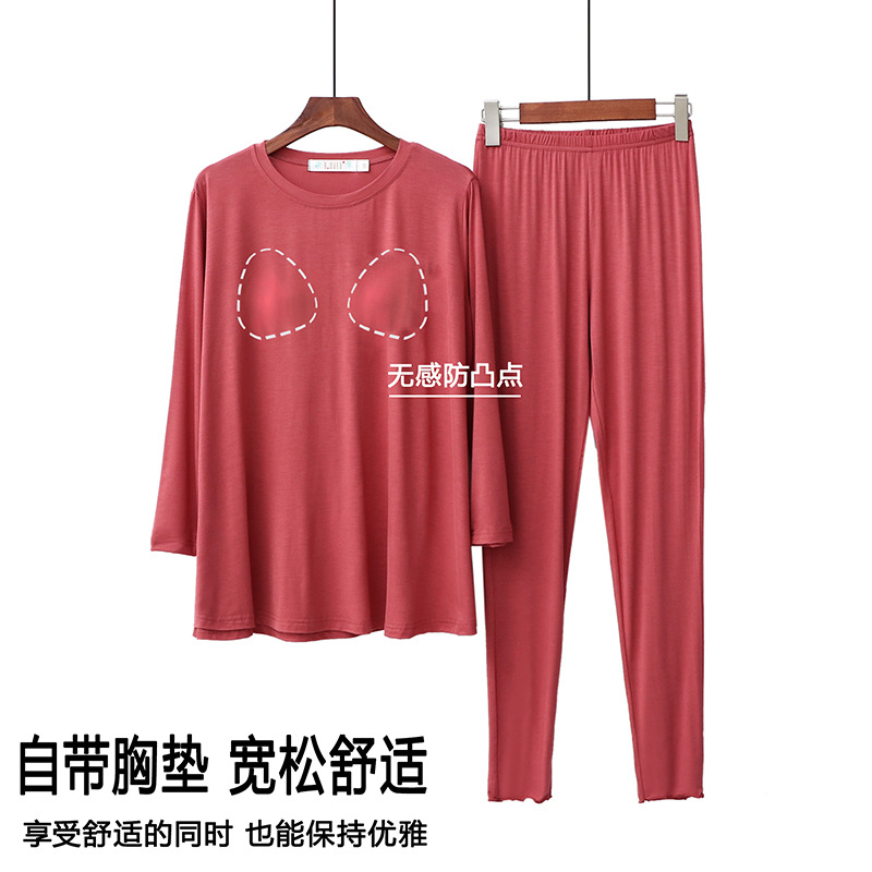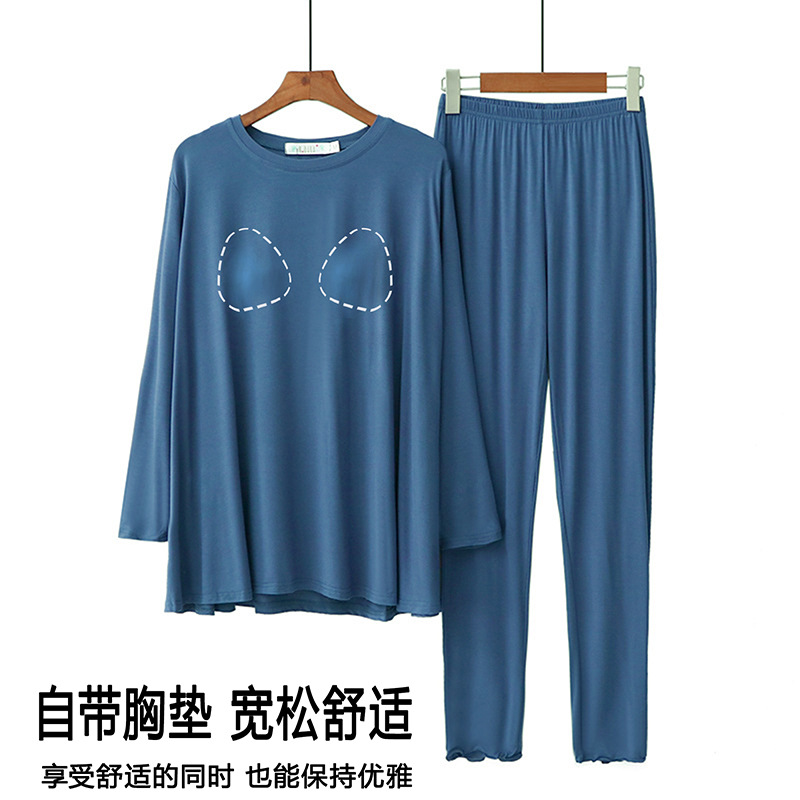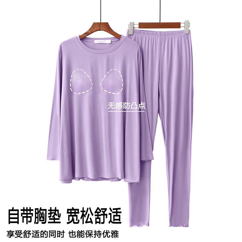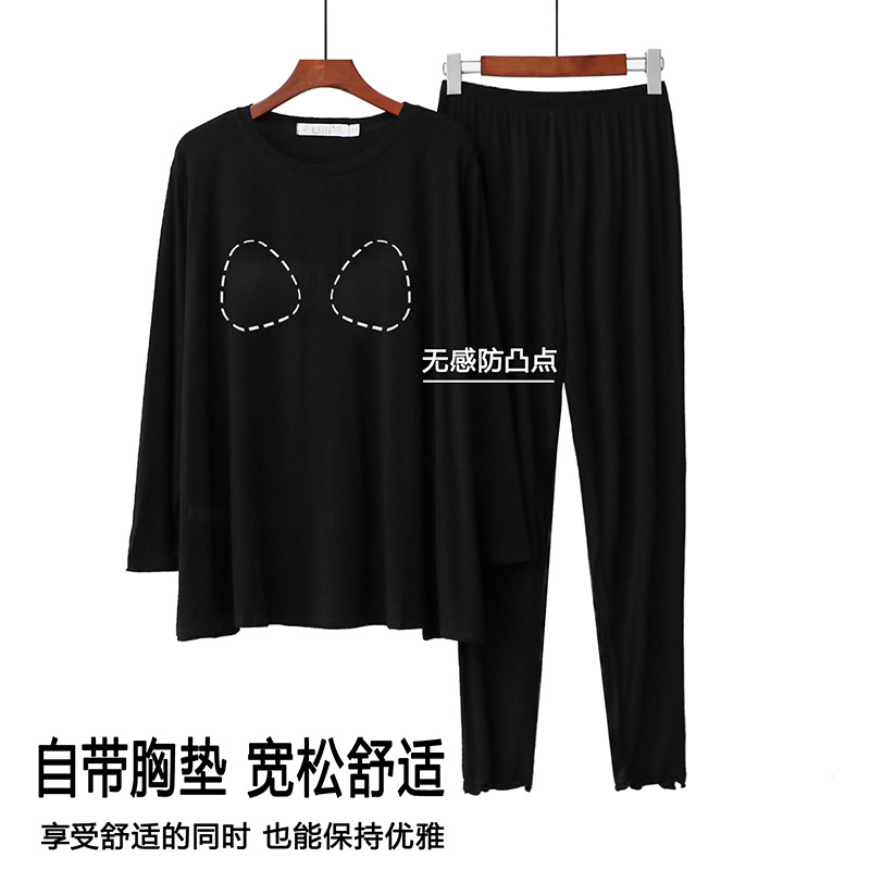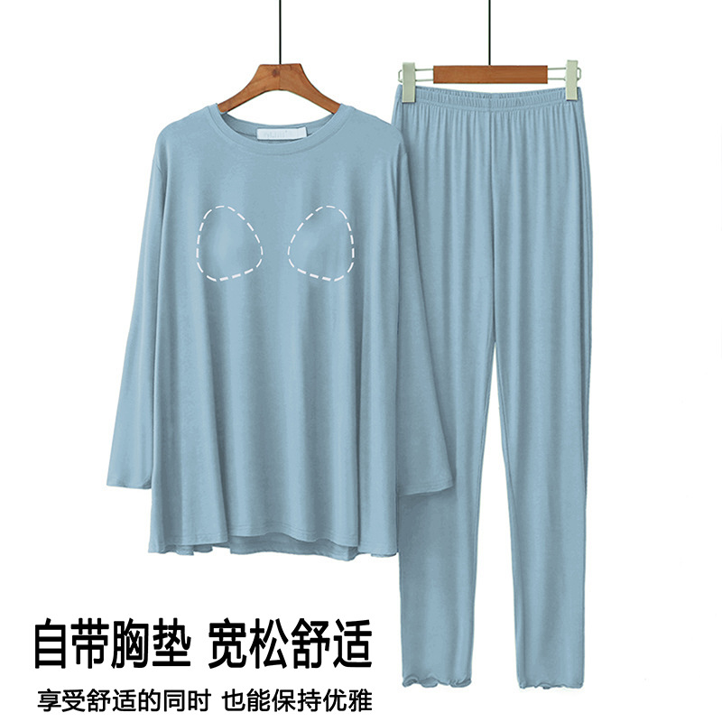 가슴 패드와 모달 간단한 순수 컬러 파자마 여성의 봄과 가을 긴 소매 바지 세트 느슨한 캐주얼 풀오버를 착용 할 수 있습니다