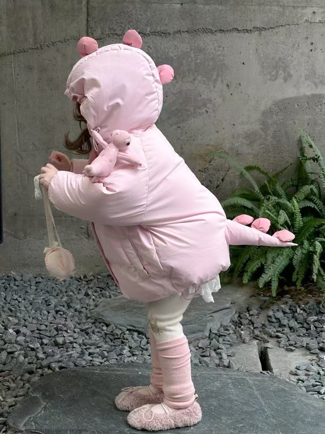 2024韩版新款男童女童款羽绒服小童宝宝肩膀卡通恐龙造型棉衣外套