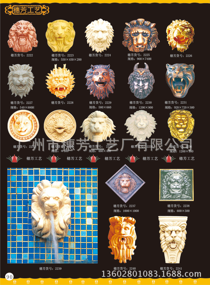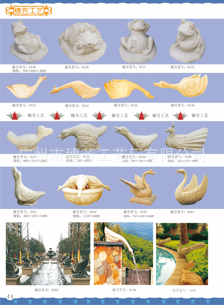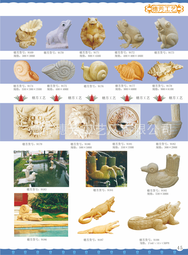 广州市穗芳工艺厂有限公司专业生产玻璃钢和人造砂岩喷泉,欧式喷泉,水景雕塑,欧式人物喷泉,花园喷泉,酒店喷泉,广场大喷泉,砂岩喷泉雕塑,海豚喷泉,怪鱼出水,箭鱼喷泉,钓鱼喷泉,大象喷泉,海马喷水,怪鱼出水,青蛙喷水,鲤鱼喷泉,天鹅喷泉,孔雀喷泉,海螺出水,狮头出水,鱼尾狮喷泉雕塑,室内挂式喷泉,靠墙流水喷泉,流水喷泉,水池喷泉等,