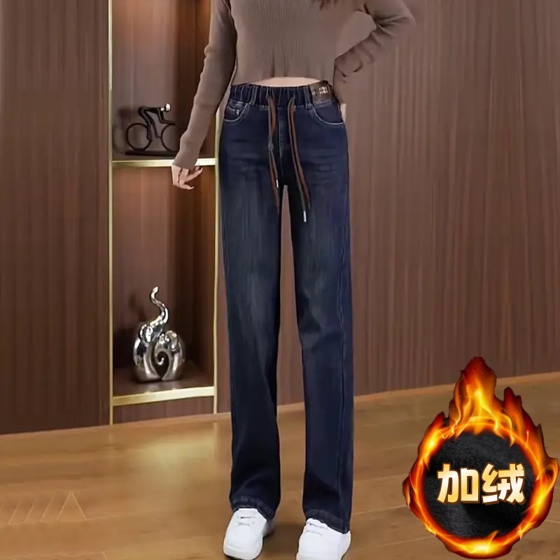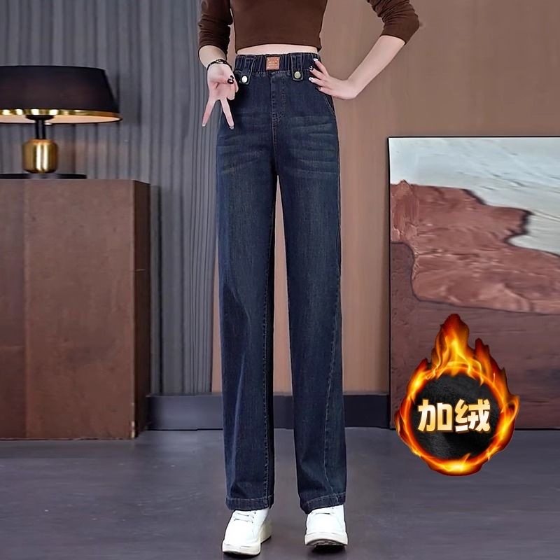 탄성 허리 넓은 다리 청바지 여성의 가을과 겨울 새로운 높은 허리 바지 빈티지 기모 좁은 스트레이트 바지