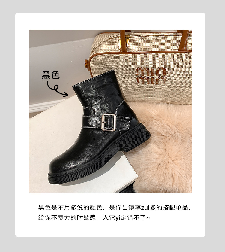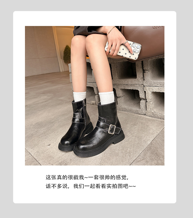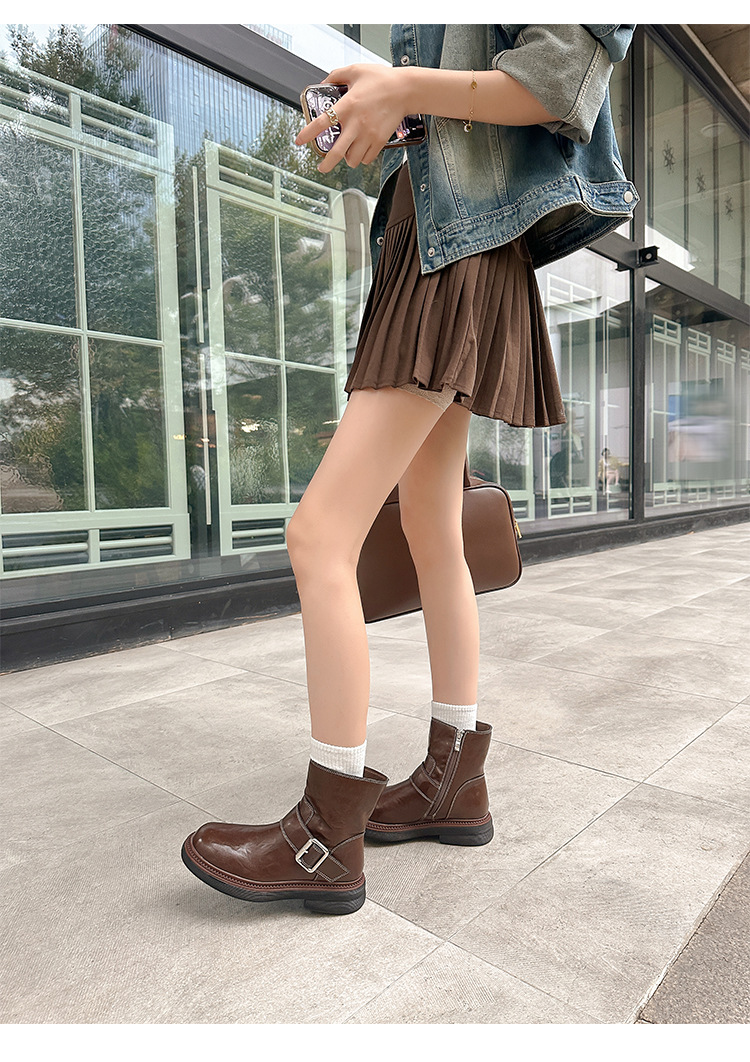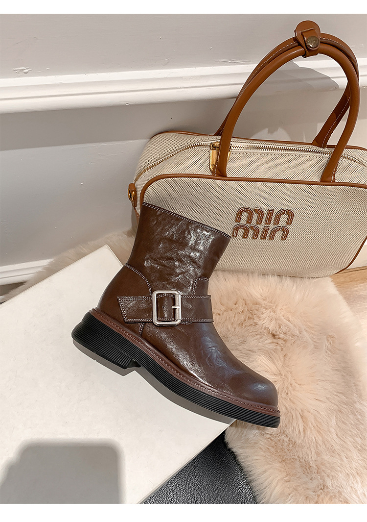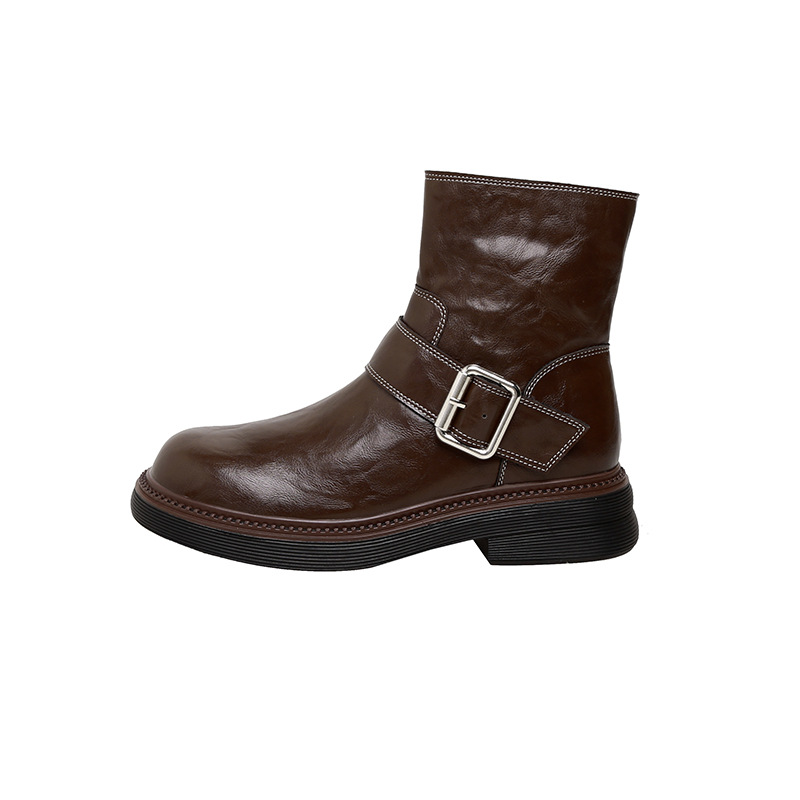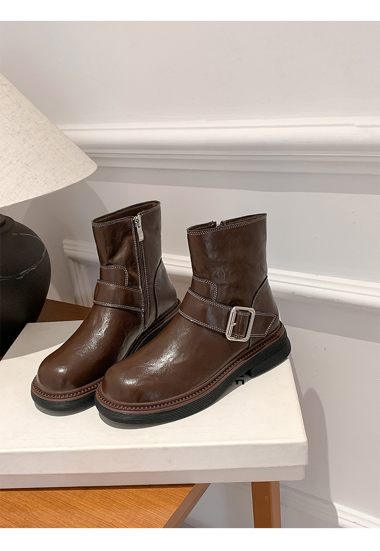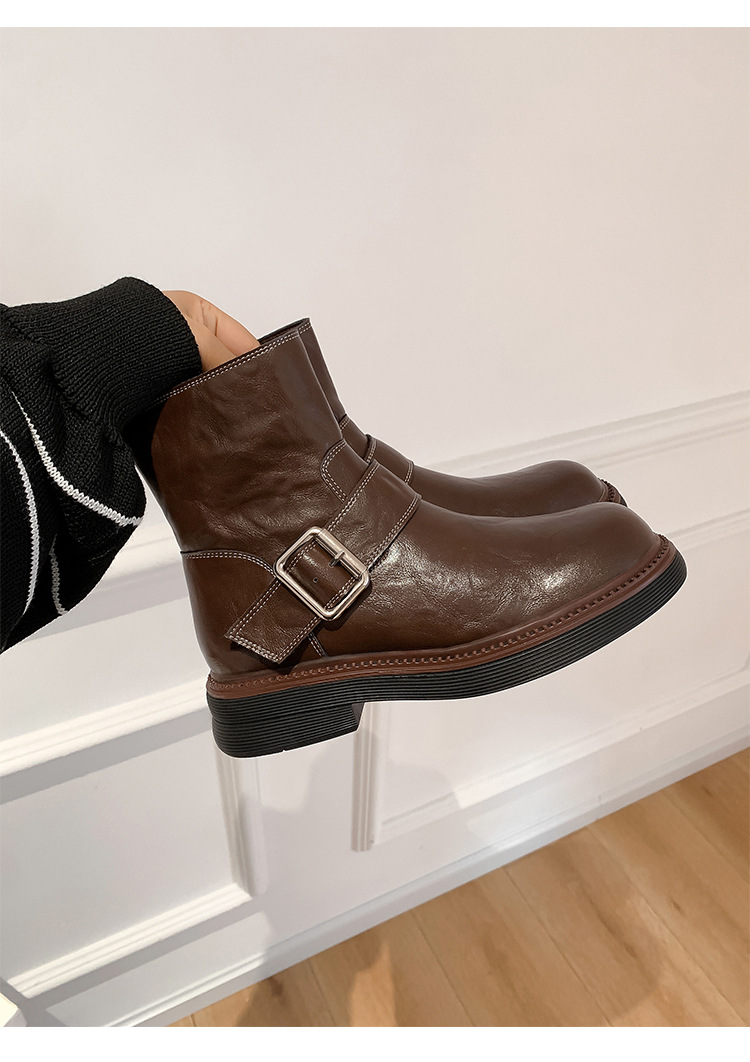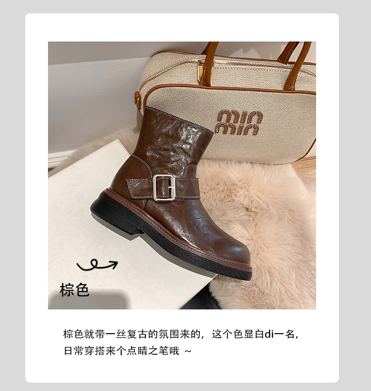 부드러운 소가죽! 다크 브라운 라운드 발가락 두꺼운 힐 오토바이 부츠 여성 가을 및 겨울 벨트 버클 Maillard 빈티지 플랫폼 마틴 부츠스토어 가기