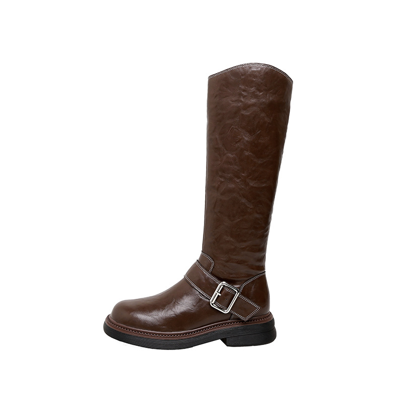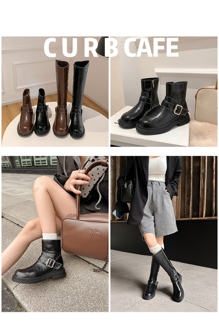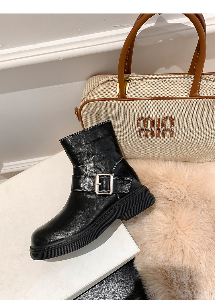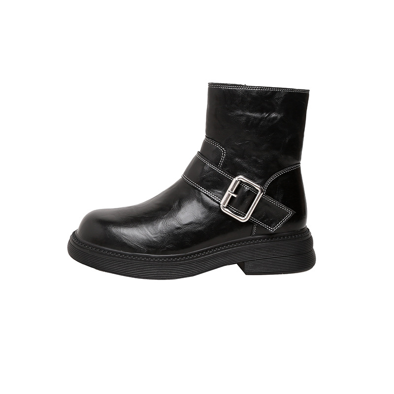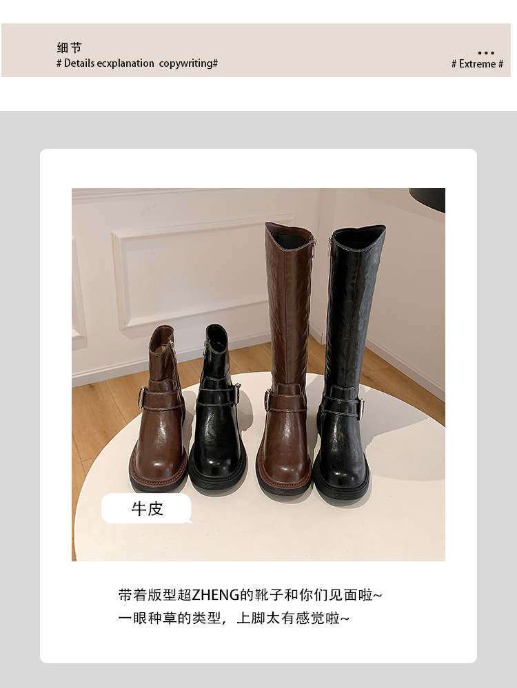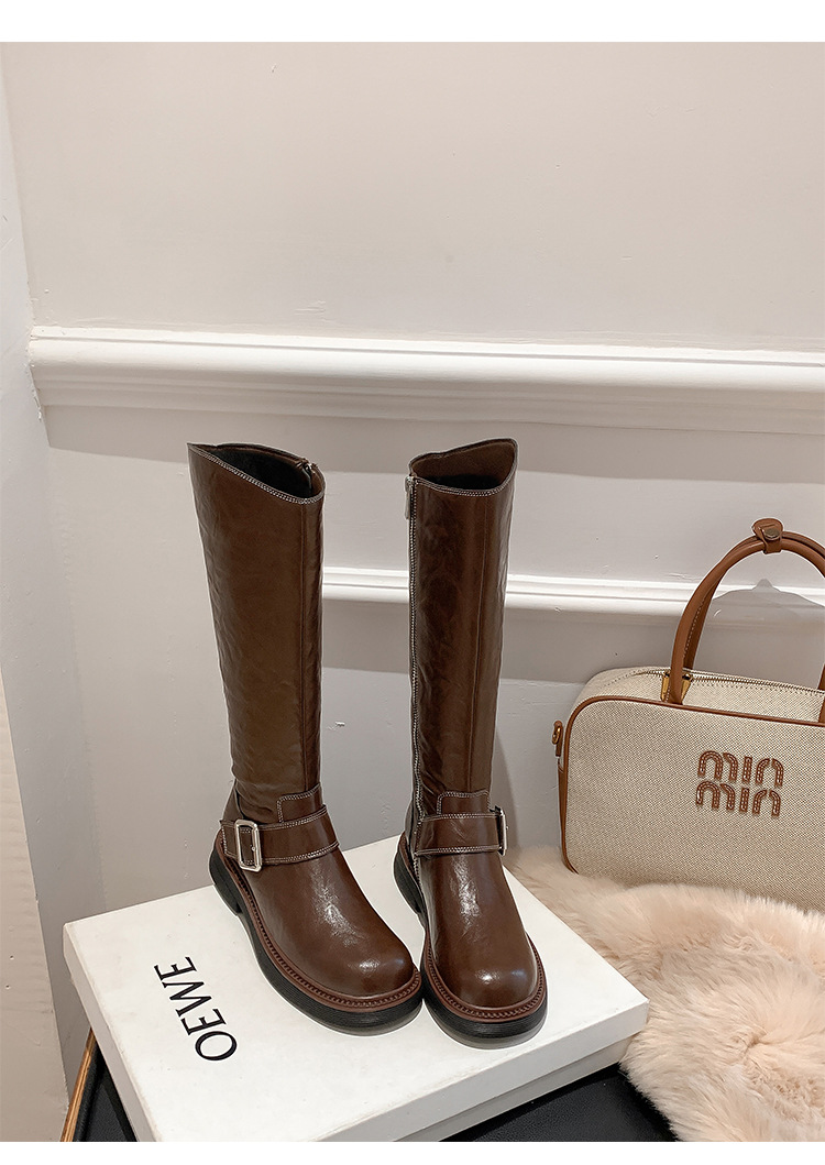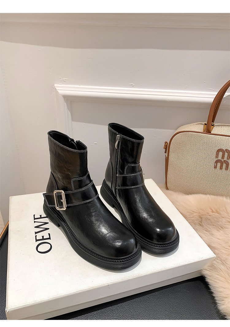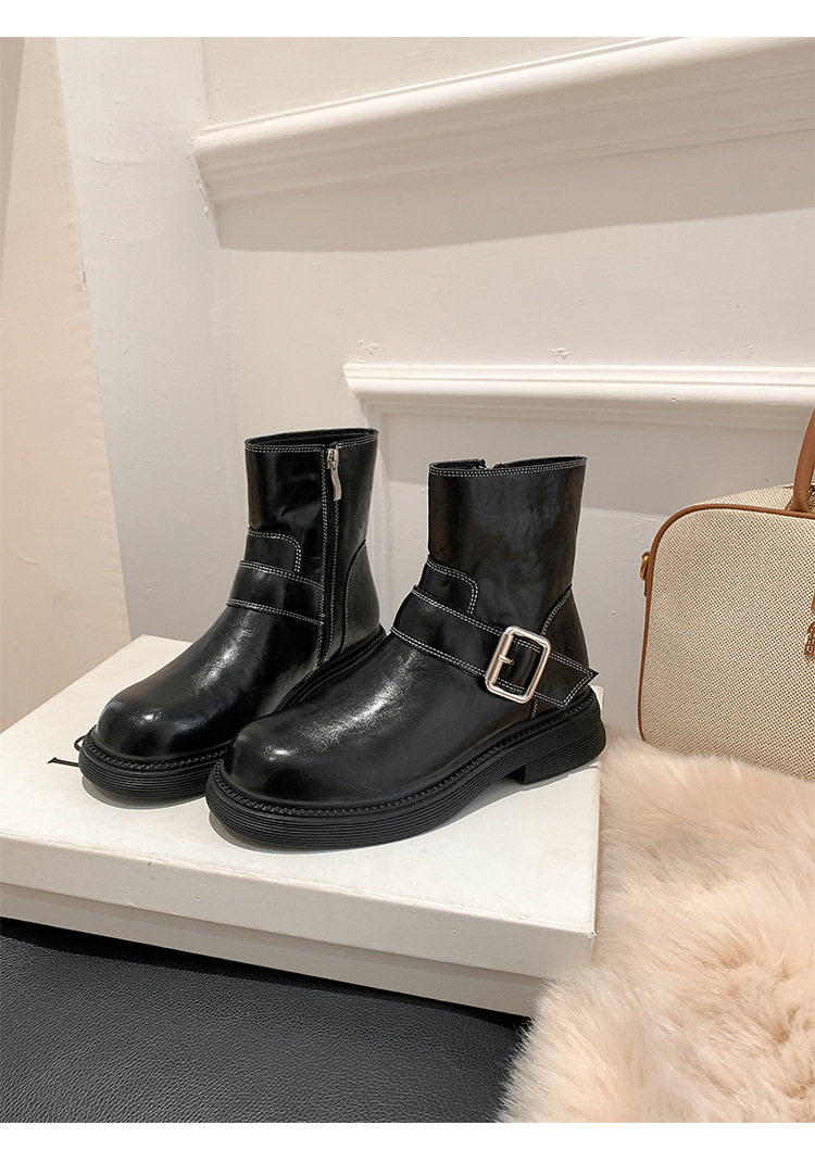 부드러운 소가죽! 다크 브라운 라운드 발가락 두꺼운 힐 오토바이 부츠 여성 가을 및 겨울 벨트 버클 Maillard 빈티지 플랫폼 마틴 부츠스토어 가기