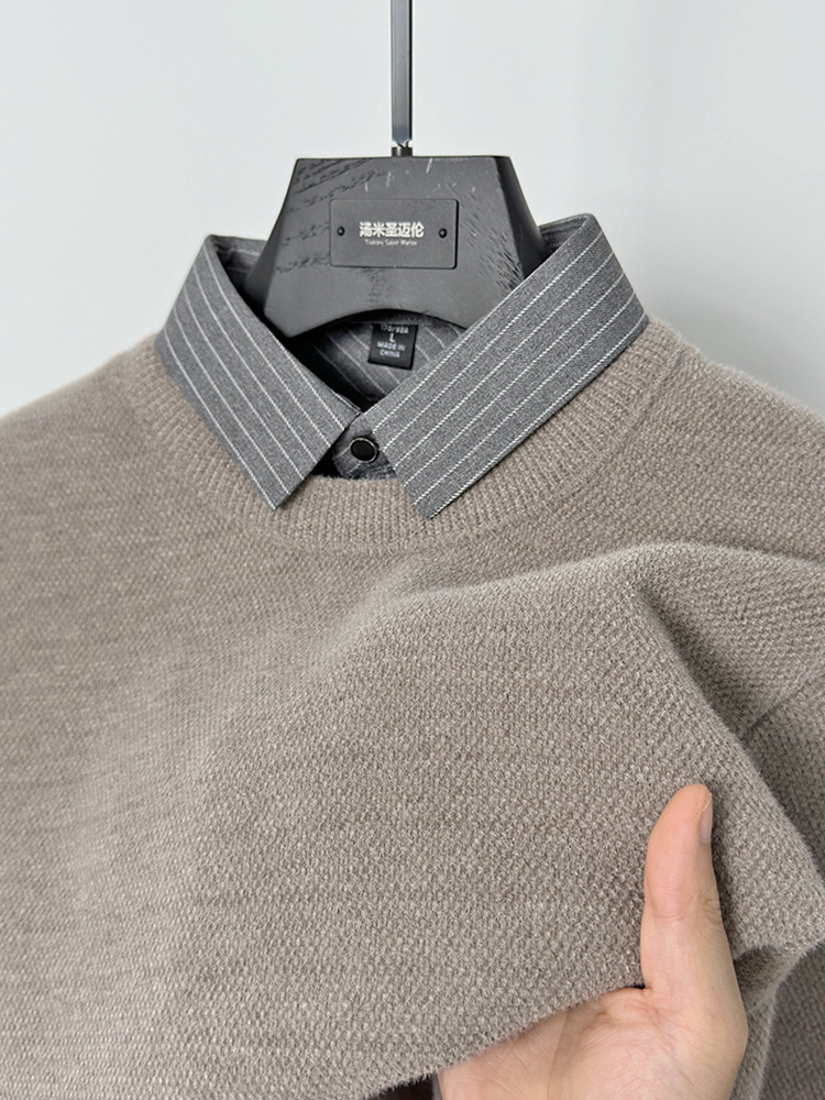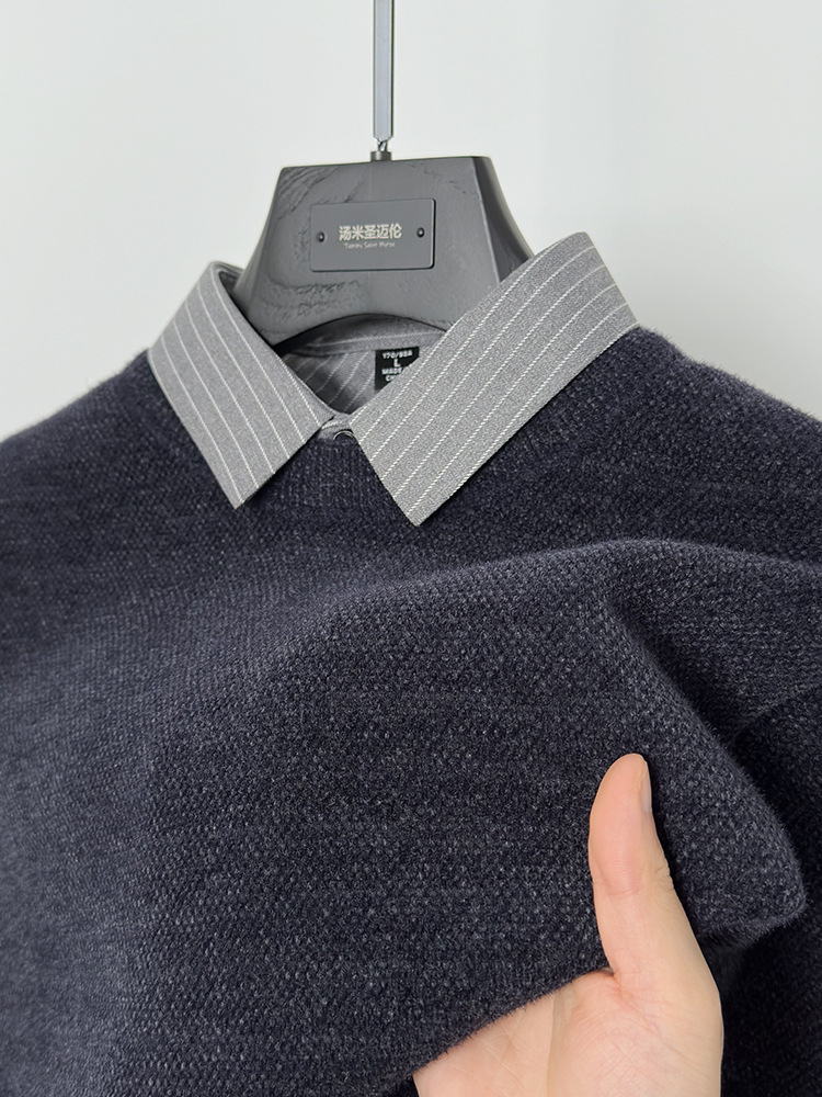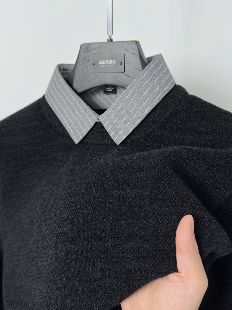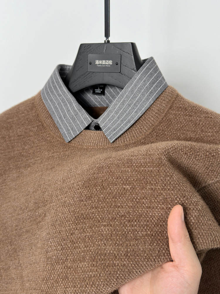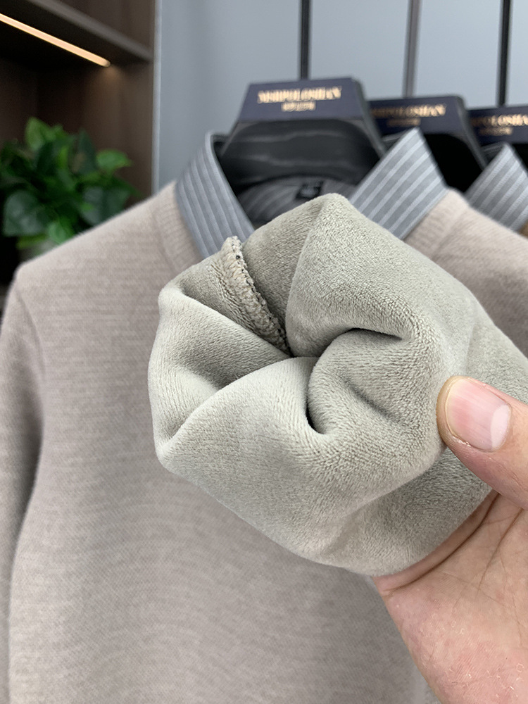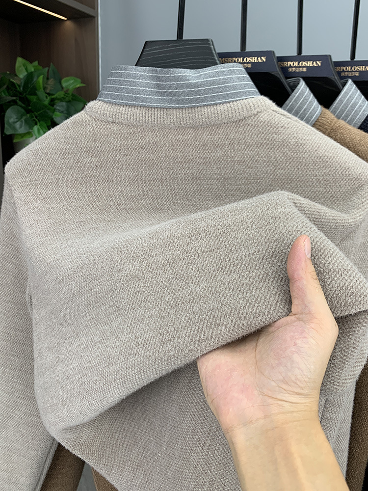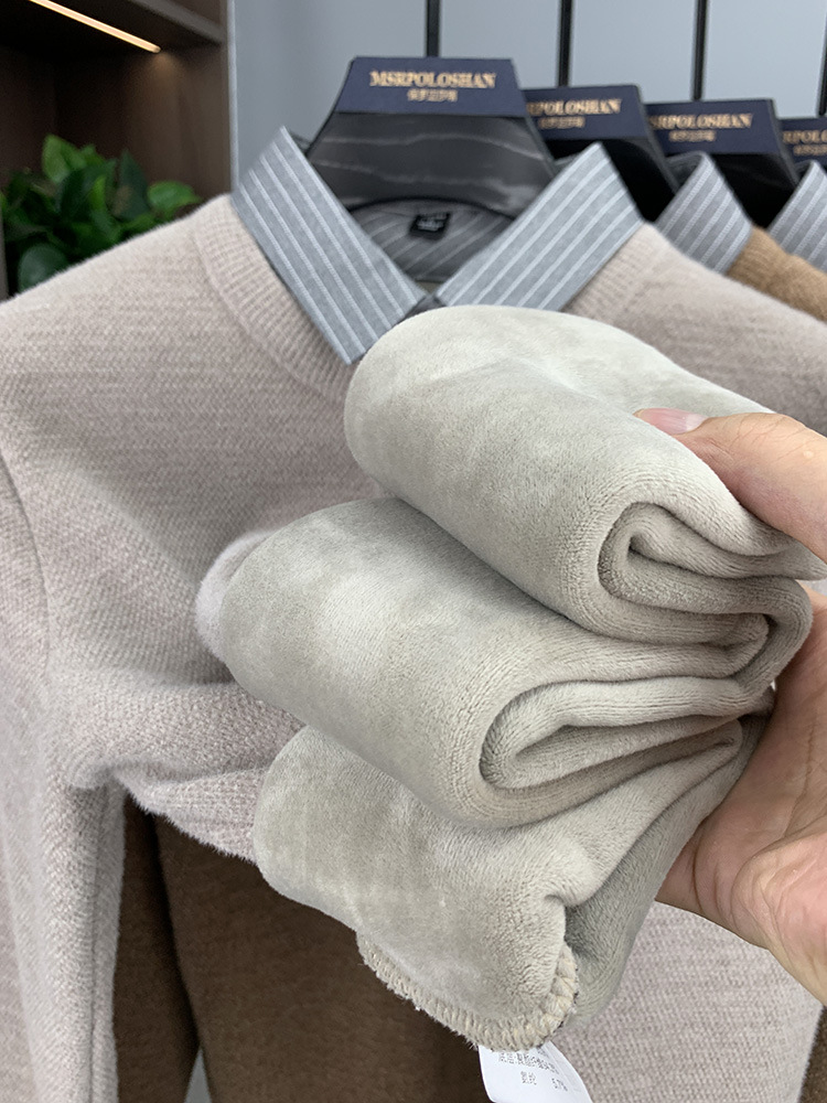 [원피스 벨벳] 기모 두꺼운 남성용 스웨터 새 셔츠 칼라 가짜 투피스 겨울 따뜻한 니트 베이스 셔츠
