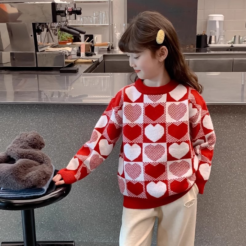 소녀 2024 새로운 스웨터 가을과 겨울 소녀 붉은 스웨터 어린이 풀오버 격자 무늬 러빙 백 스웨터스토어 가기