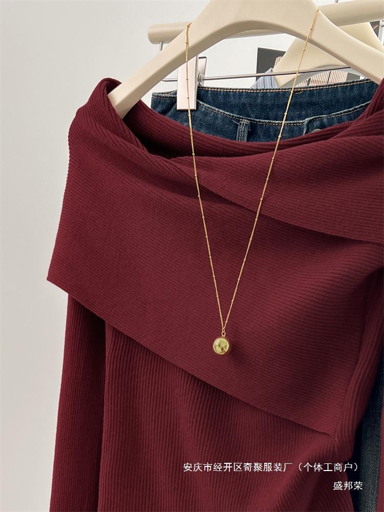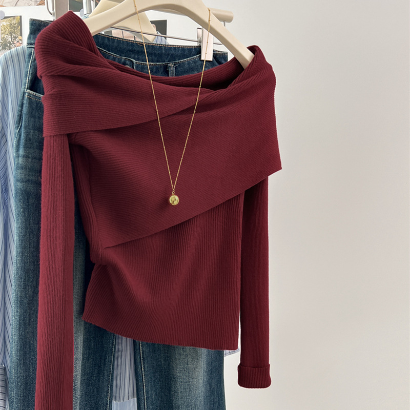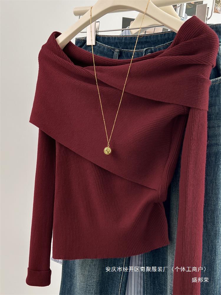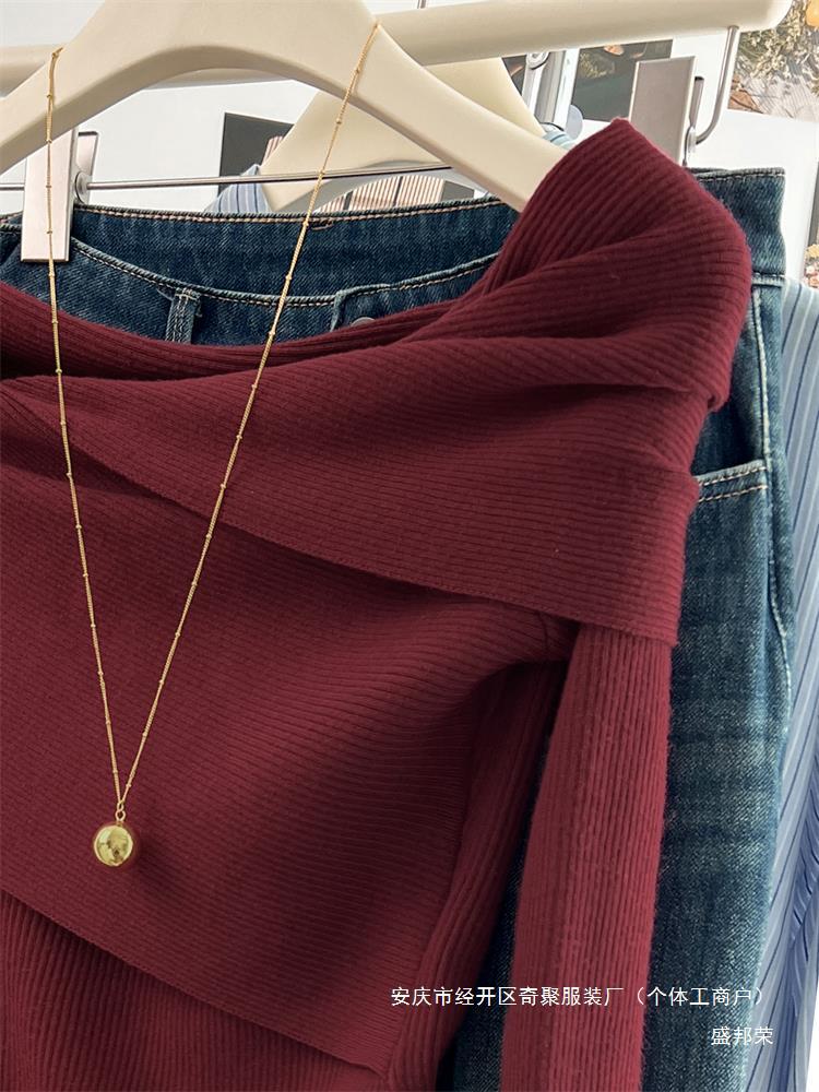 공장 한국베이스 버건디 아름다운 스웨터 여성의 가을 쇄골 기울어 진 어깨 니트 탑 순수한 욕망스토어 가기
