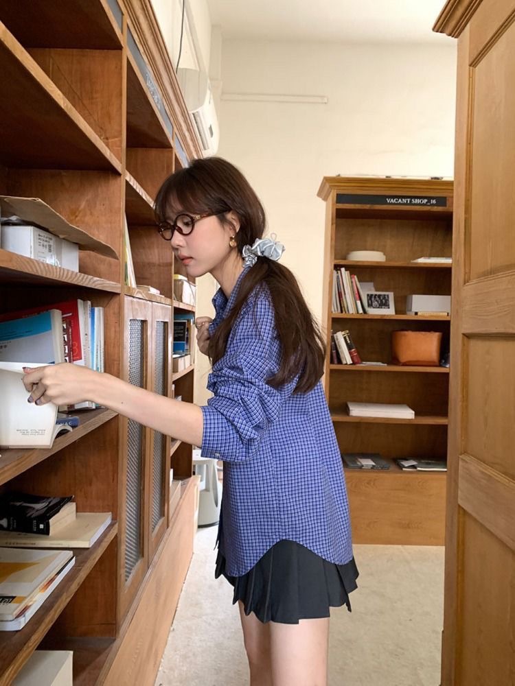 여성용 레트로 블루 체크 무늬 셔츠 탑, 봄, 가을 새로운 스타일 긴팔 루즈 캐주얼 기질 작은 셔츠스토어 가기