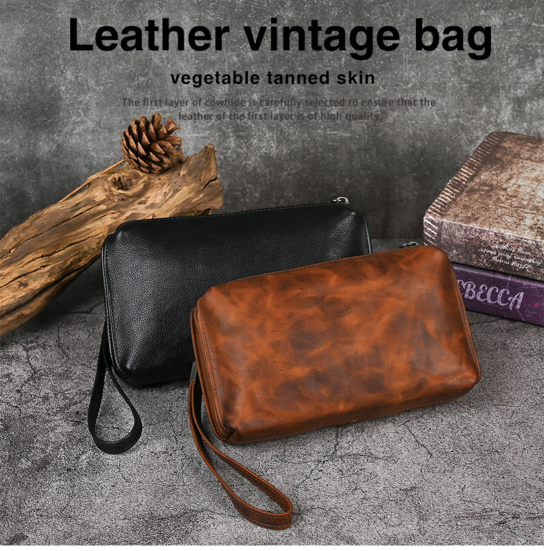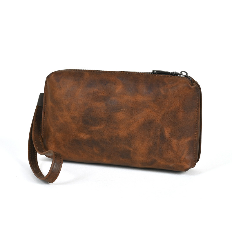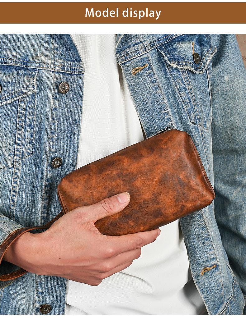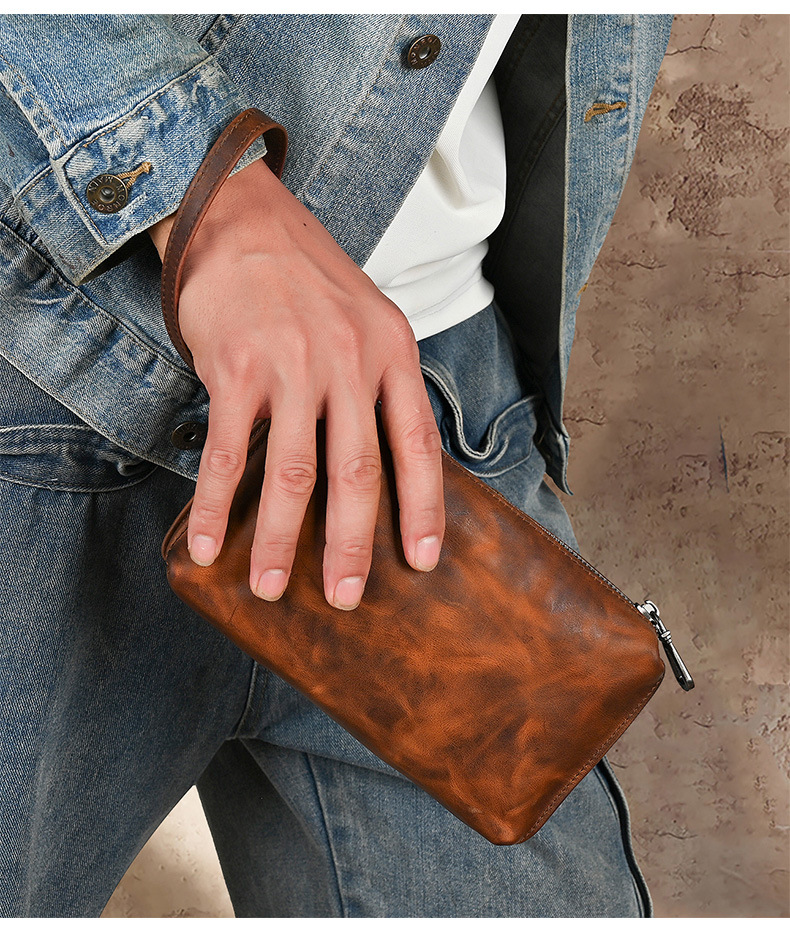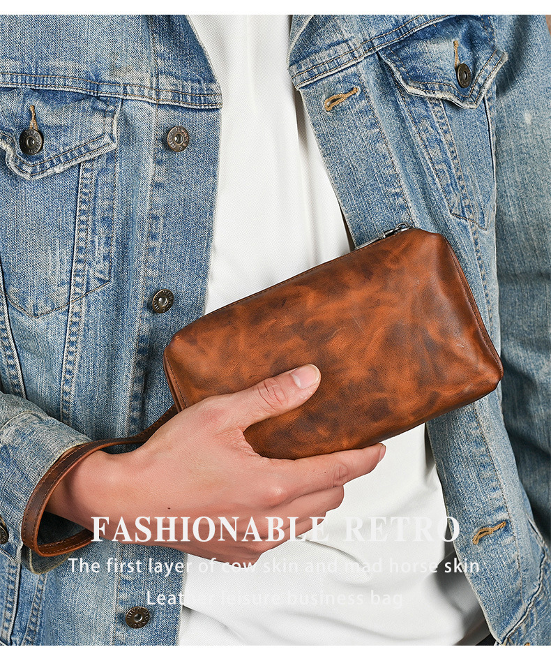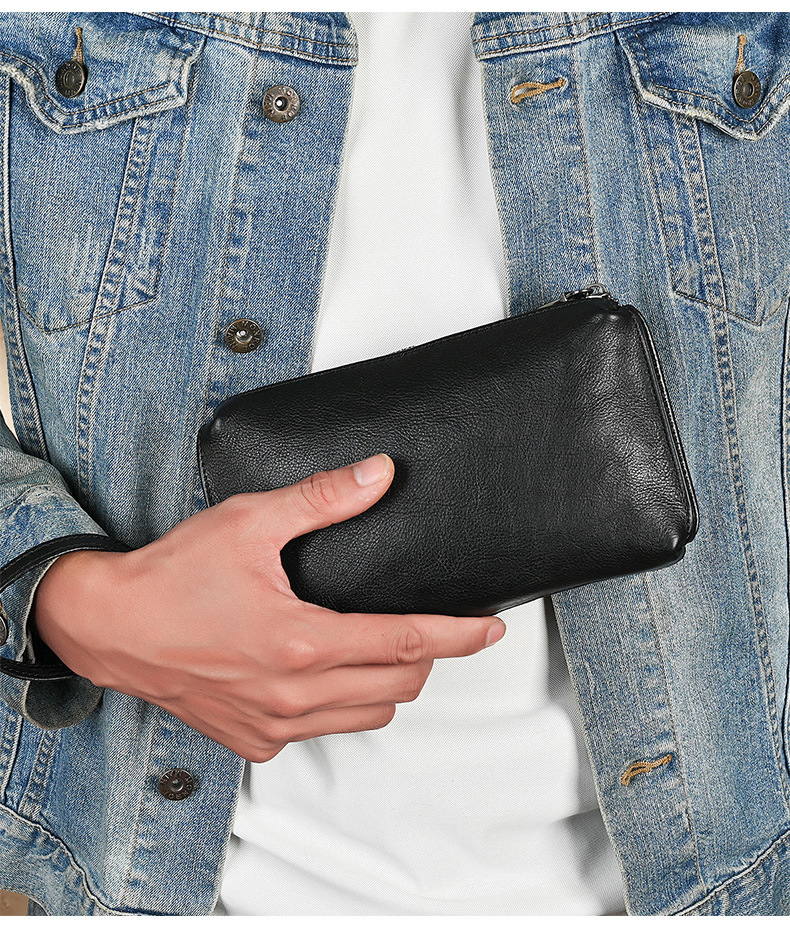 남성용 정품 가죽 핸드백 소프트 가죽 클러치 백 레트로 카우 히데 긴 지갑 캐주얼 휴대 전화 가방 간단한 트렌디 한 클러치 백스토어 가기