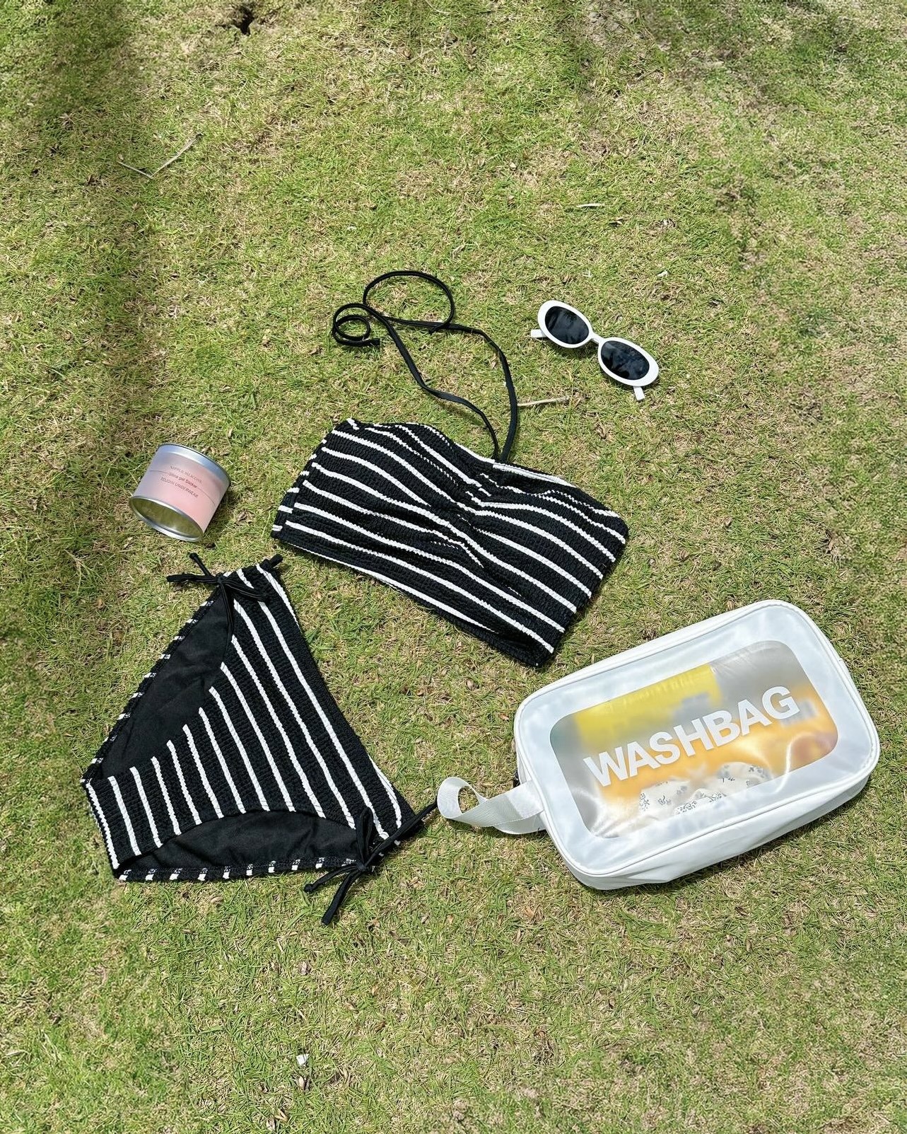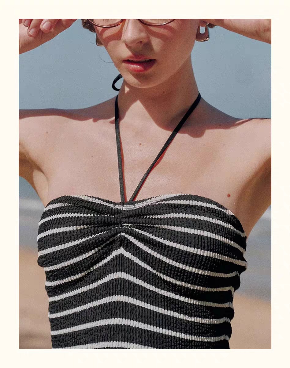 2025 년 새로운 한국, 해변 휴가를위한 신선한 줄무늬 목에 매달린 육체 덮개 슬리밍 비키니스토어 가기
