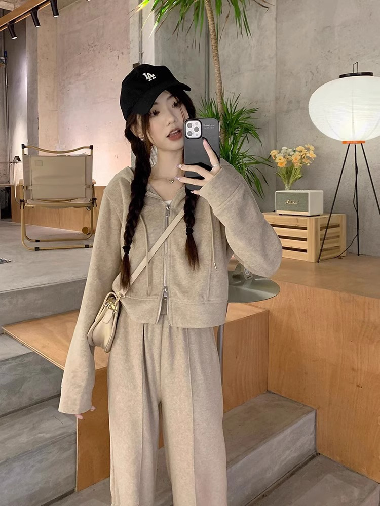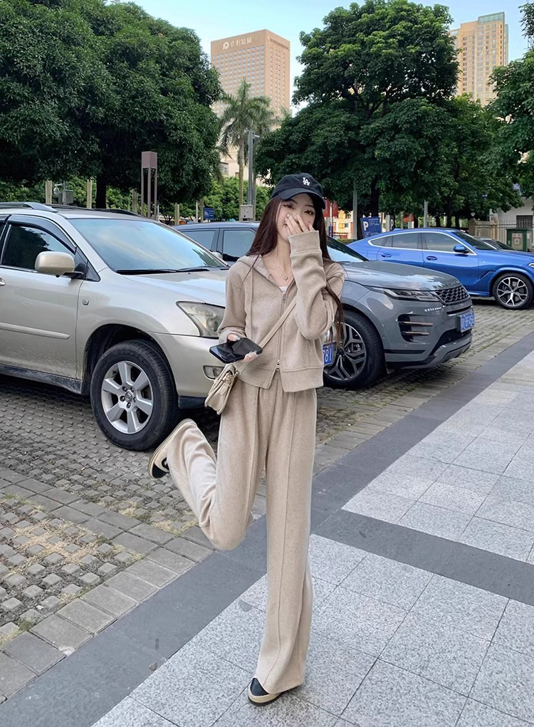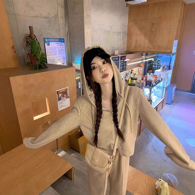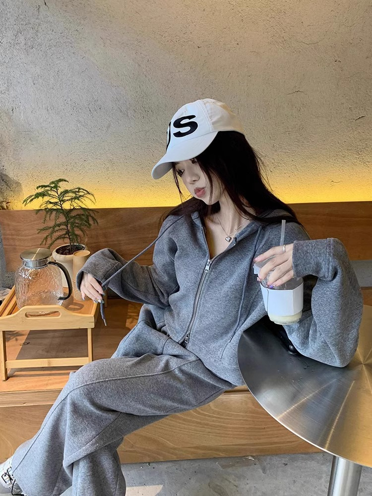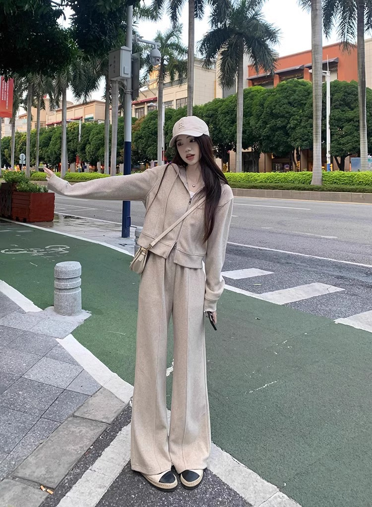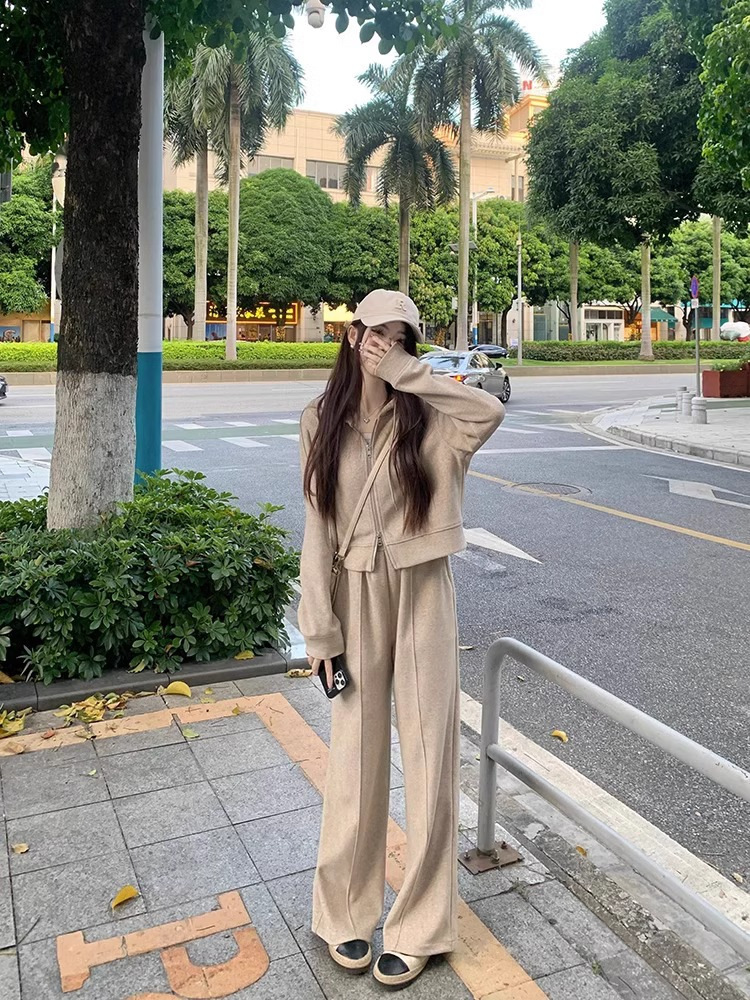 캐주얼 스포츠 세트 여성 봄과 가을 새로운 느슨한 캐주얼 한국식 후드 지퍼 운동복 투피스 트렌디 와이드 레그 바지