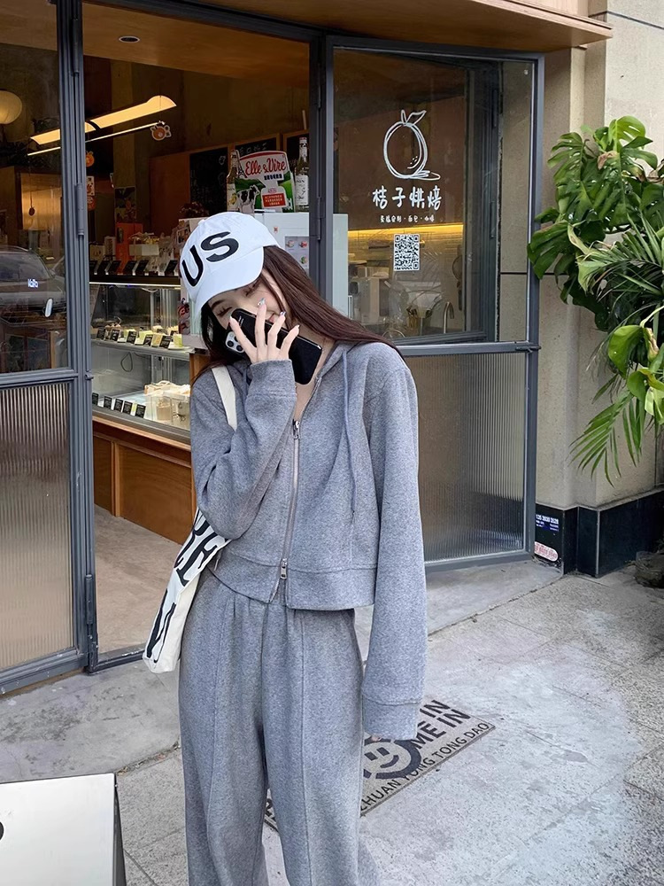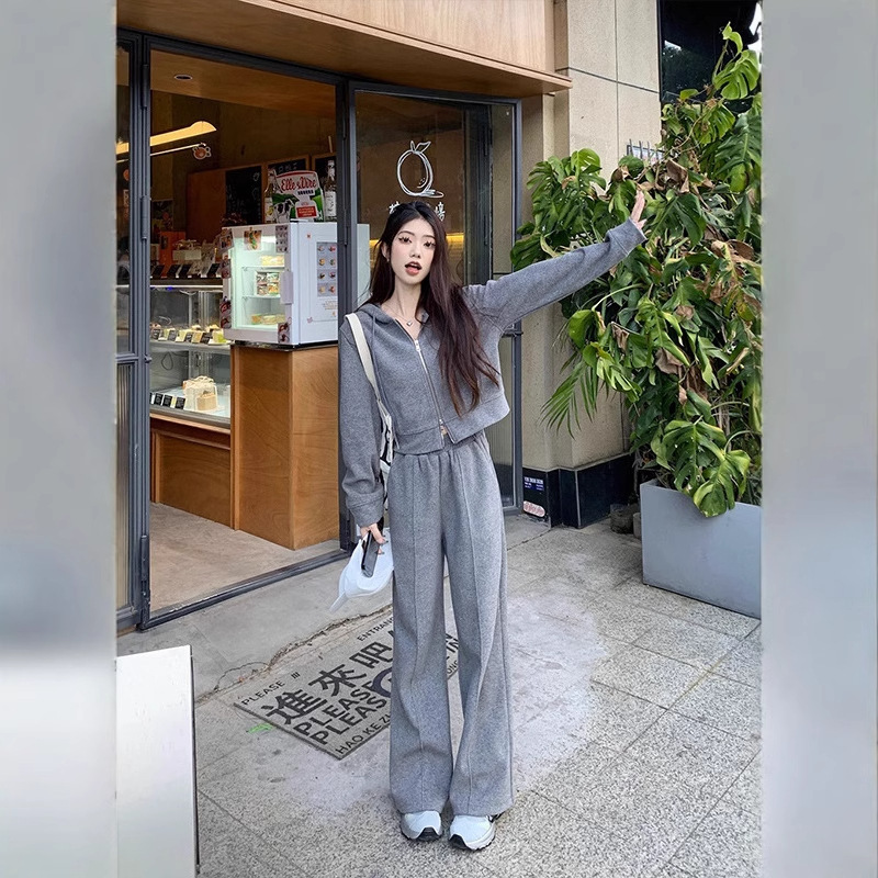 캐주얼 스포츠 세트 여성 봄과 가을 새로운 느슨한 캐주얼 한국식 후드 지퍼 운동복 투피스 트렌디 와이드 레그 바지스토어 가기