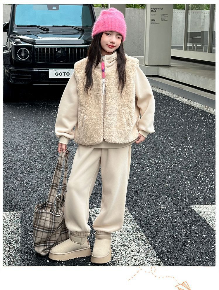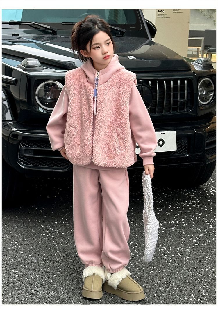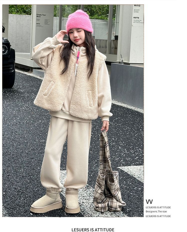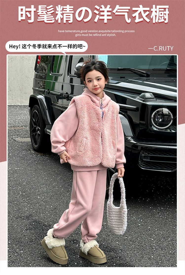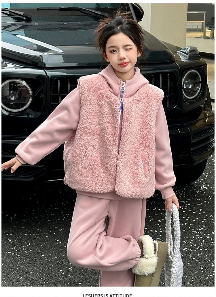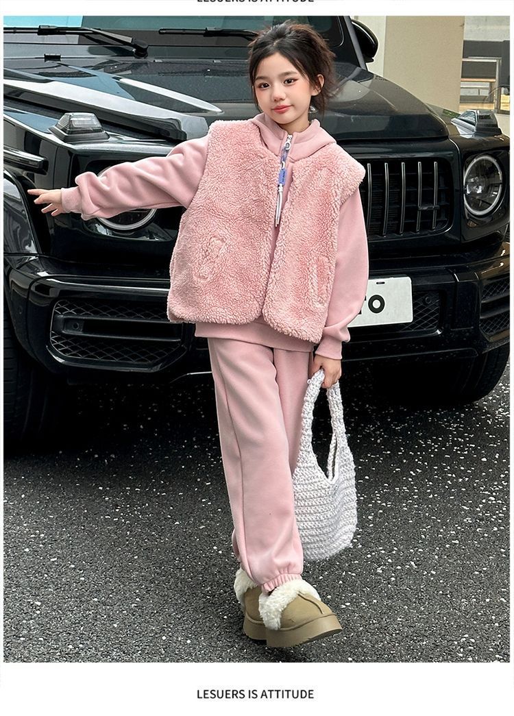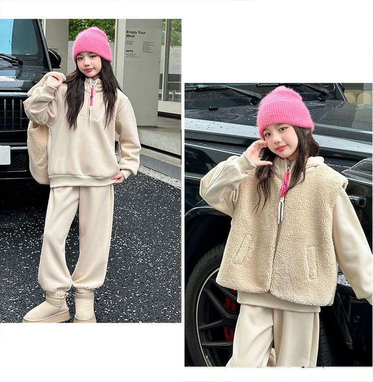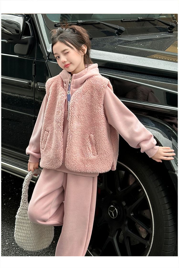 걸스 벨벳 세트 가을과 겨울 큰 어린이 후드 스웨트 운동복 두꺼운 따뜻한 양고기 울 조끼 3 피스 세트