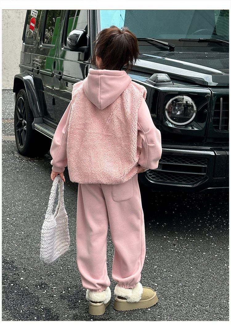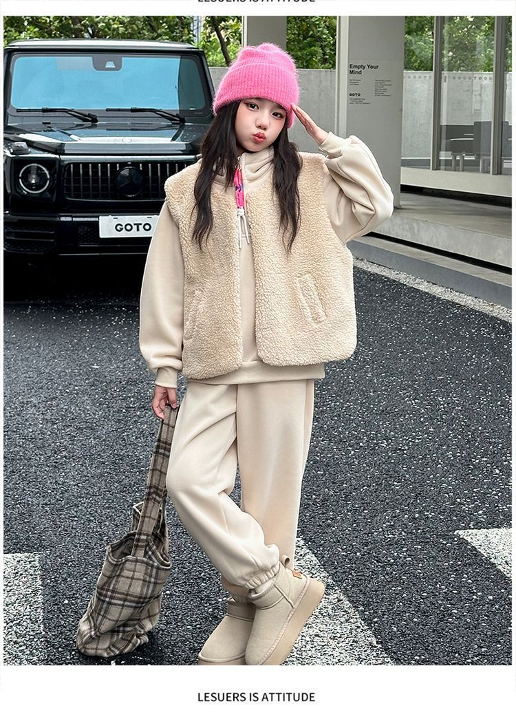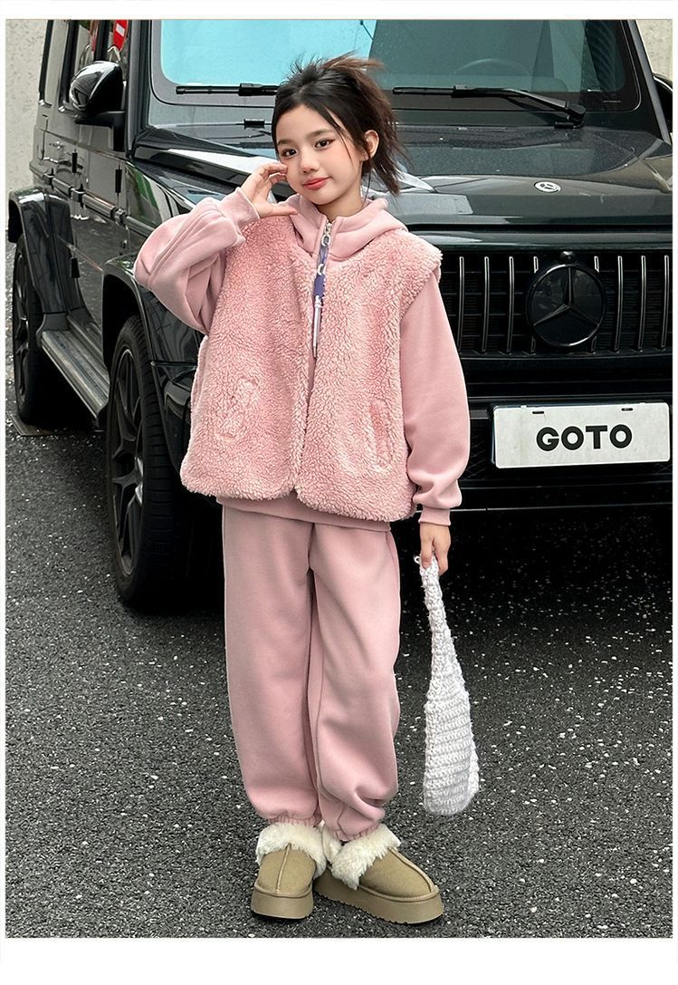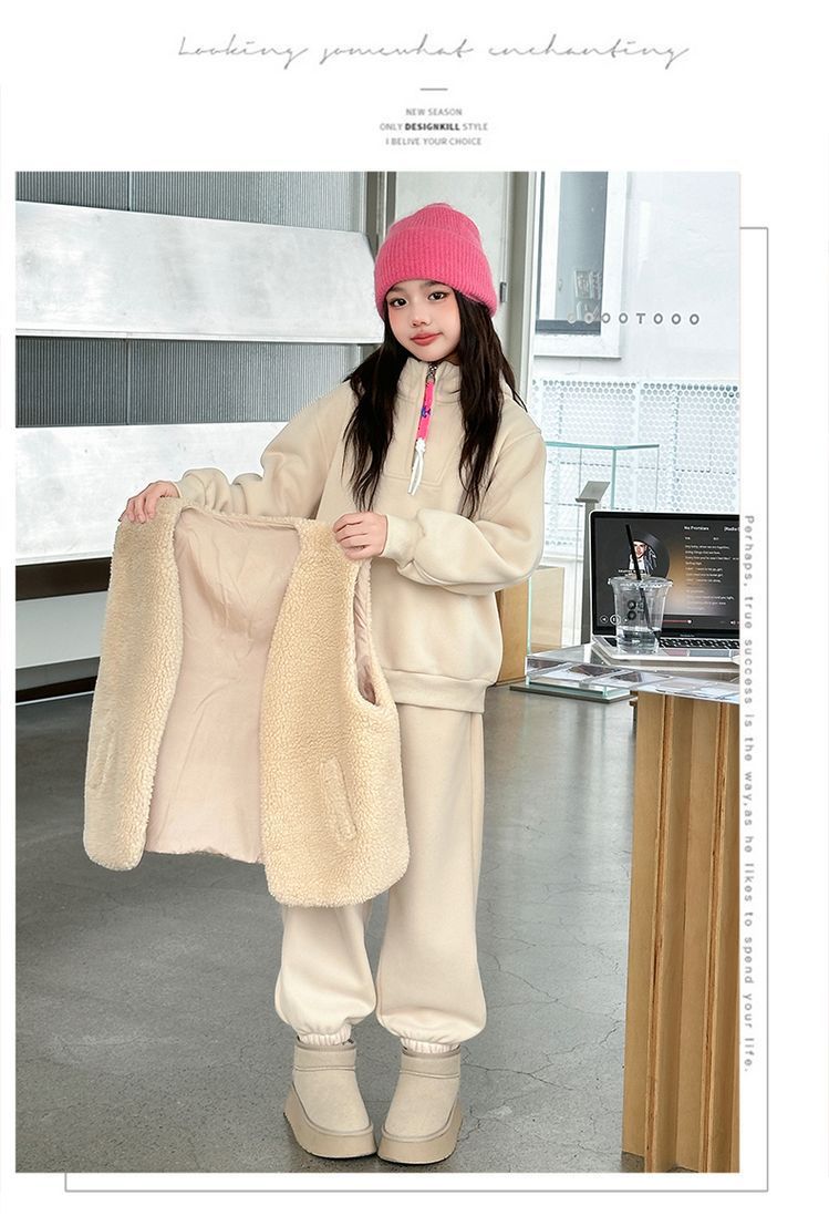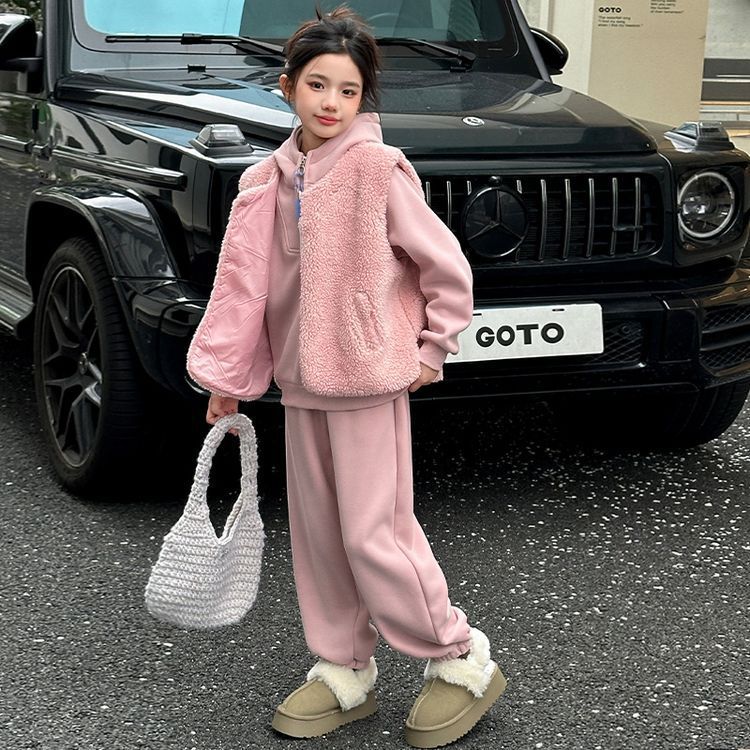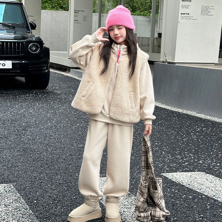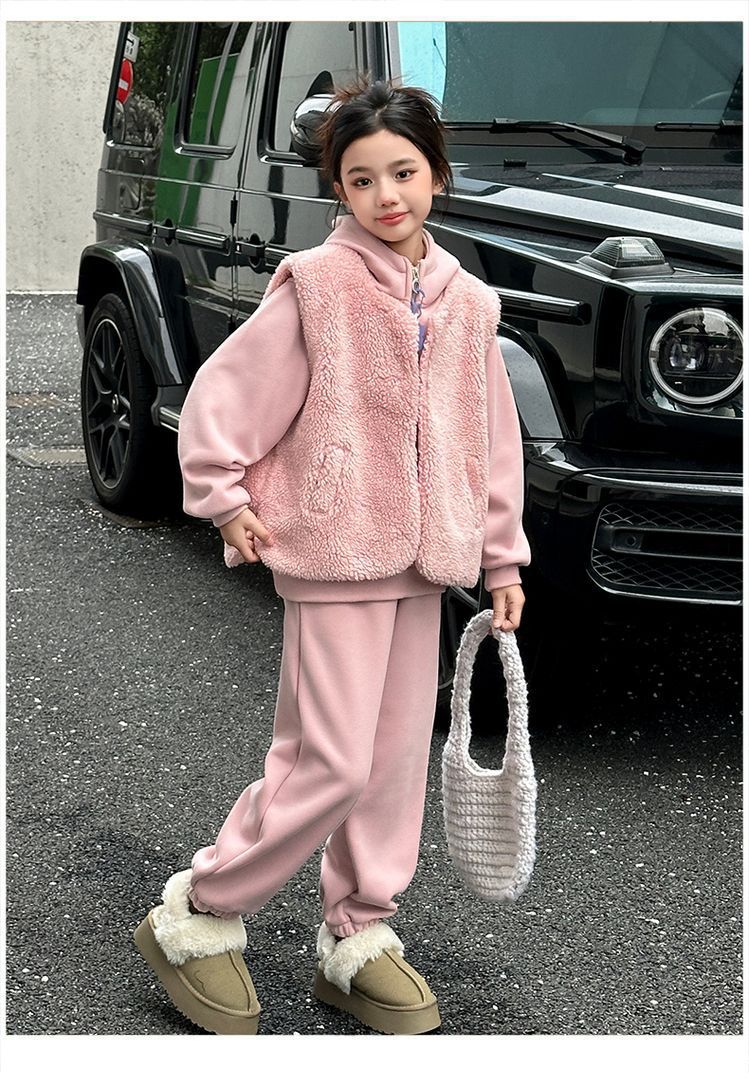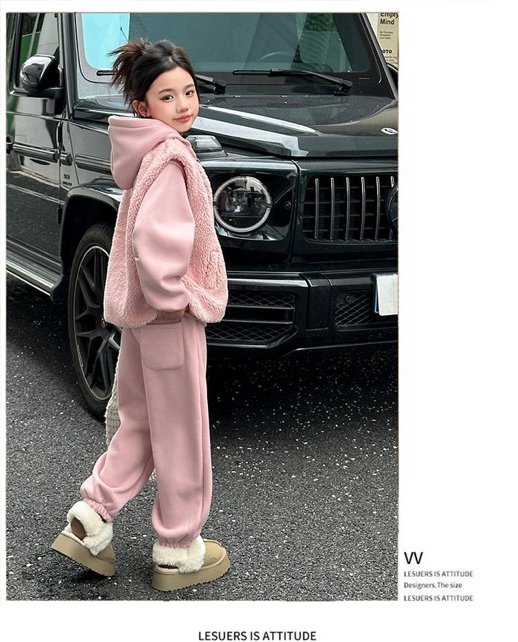 걸스 벨벳 세트 가을과 겨울 큰 어린이 후드 스웨트 운동복 두꺼운 따뜻한 양고기 울 조끼 3 피스 세트