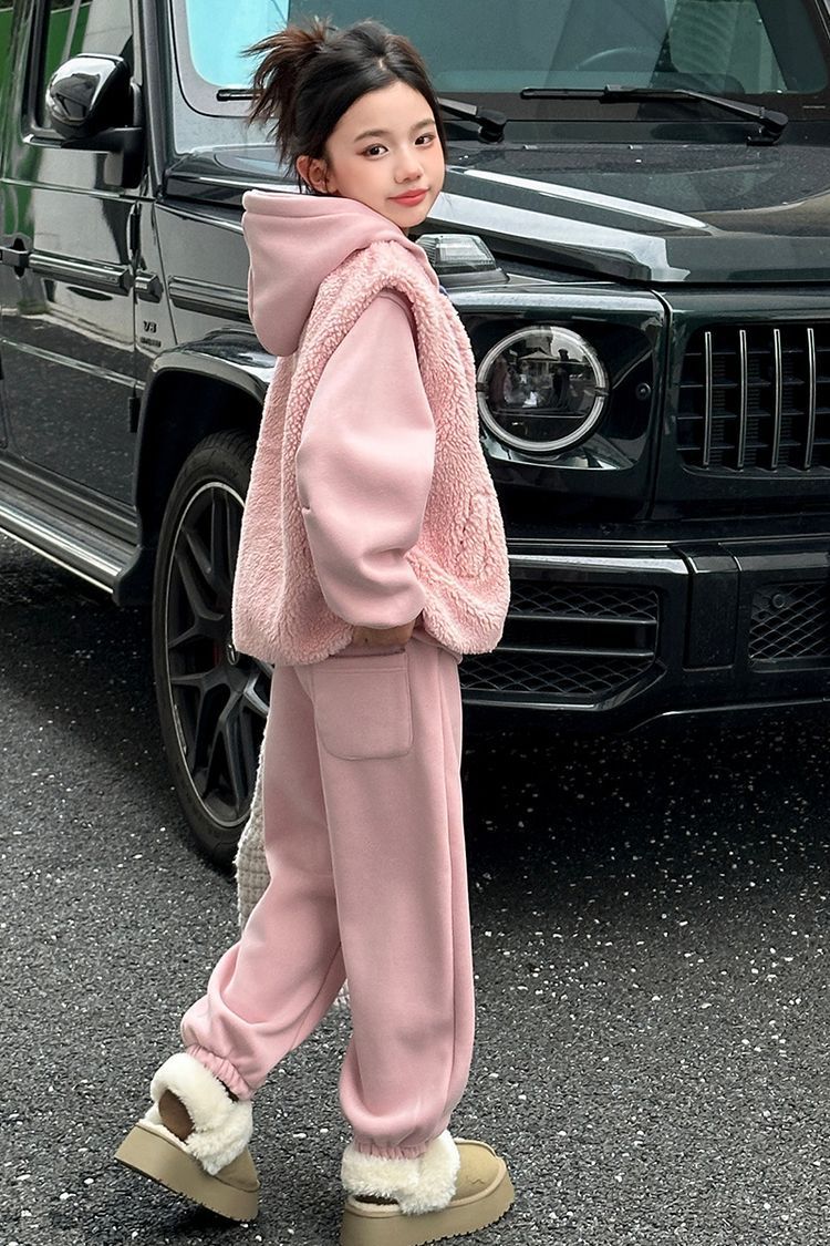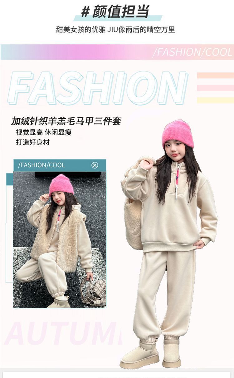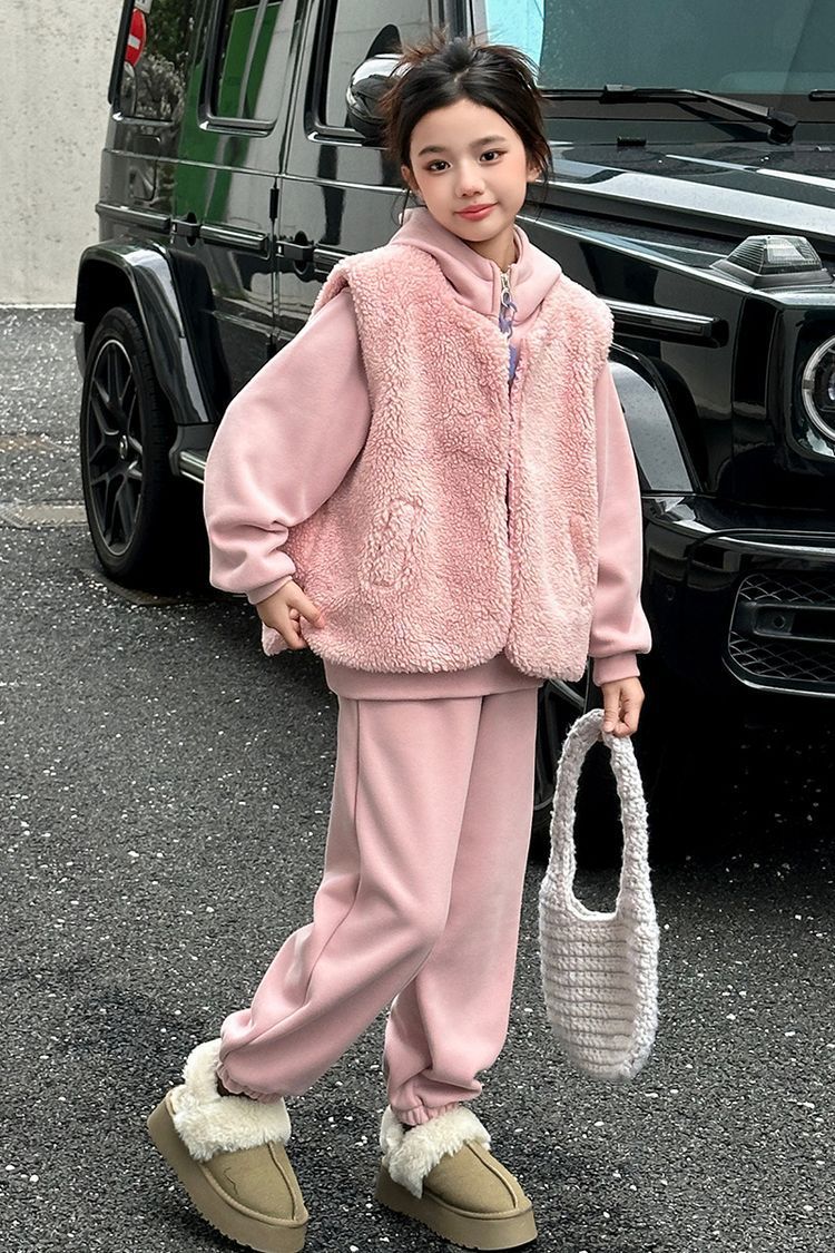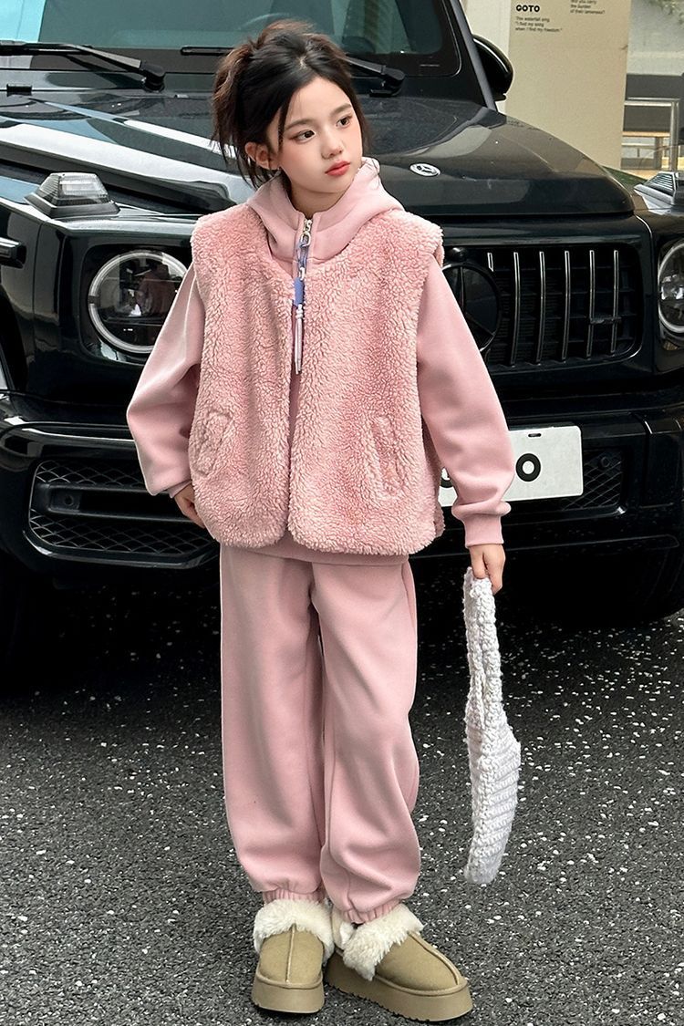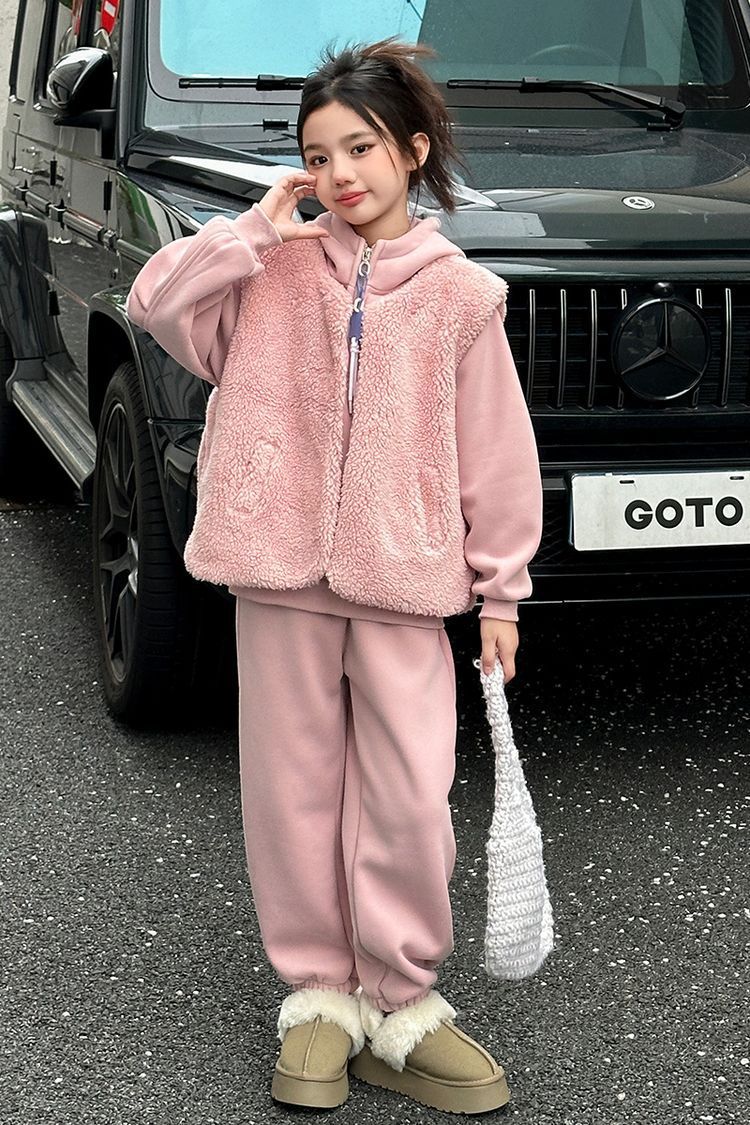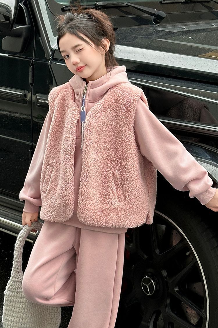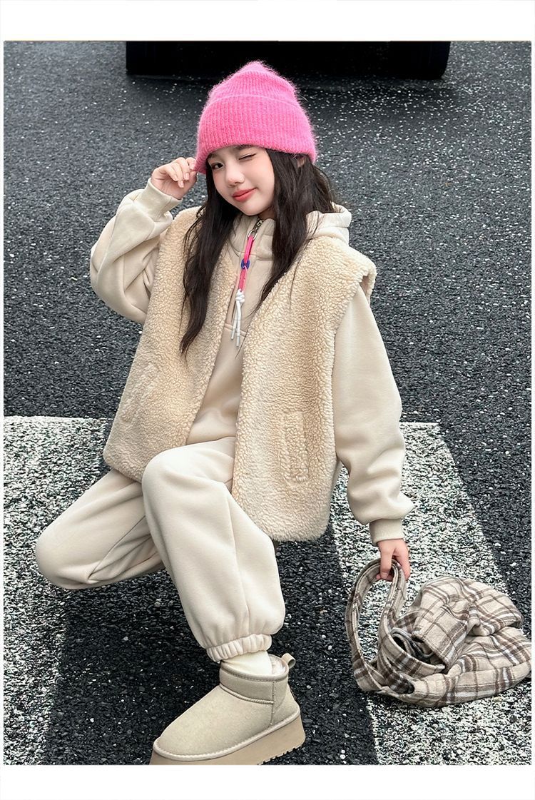 걸스 벨벳 세트 가을과 겨울 큰 어린이 후드 스웨트 운동복 두꺼운 따뜻한 양고기 울 조끼 3 피스 세트