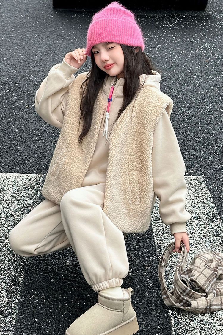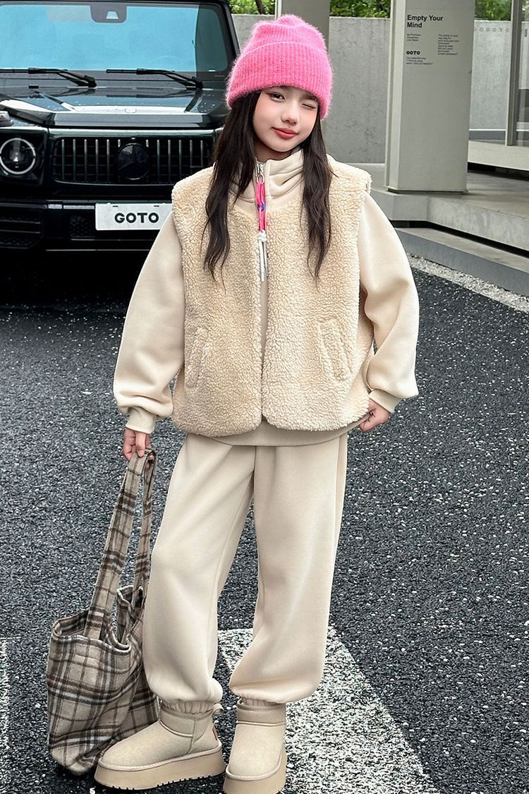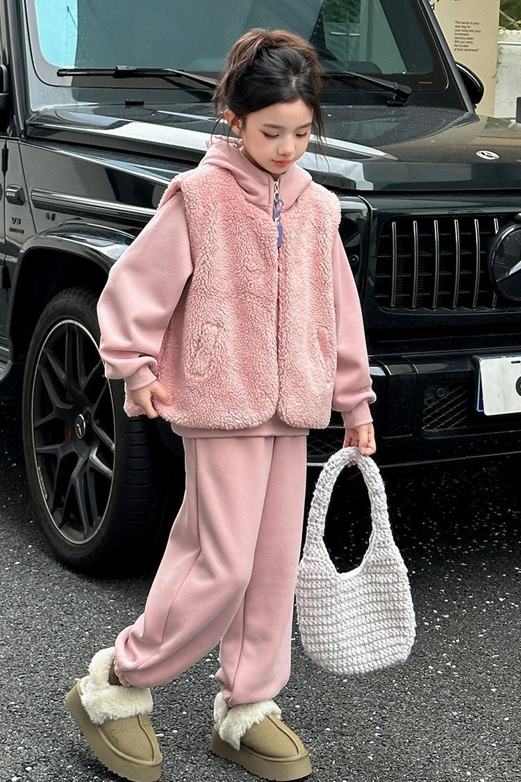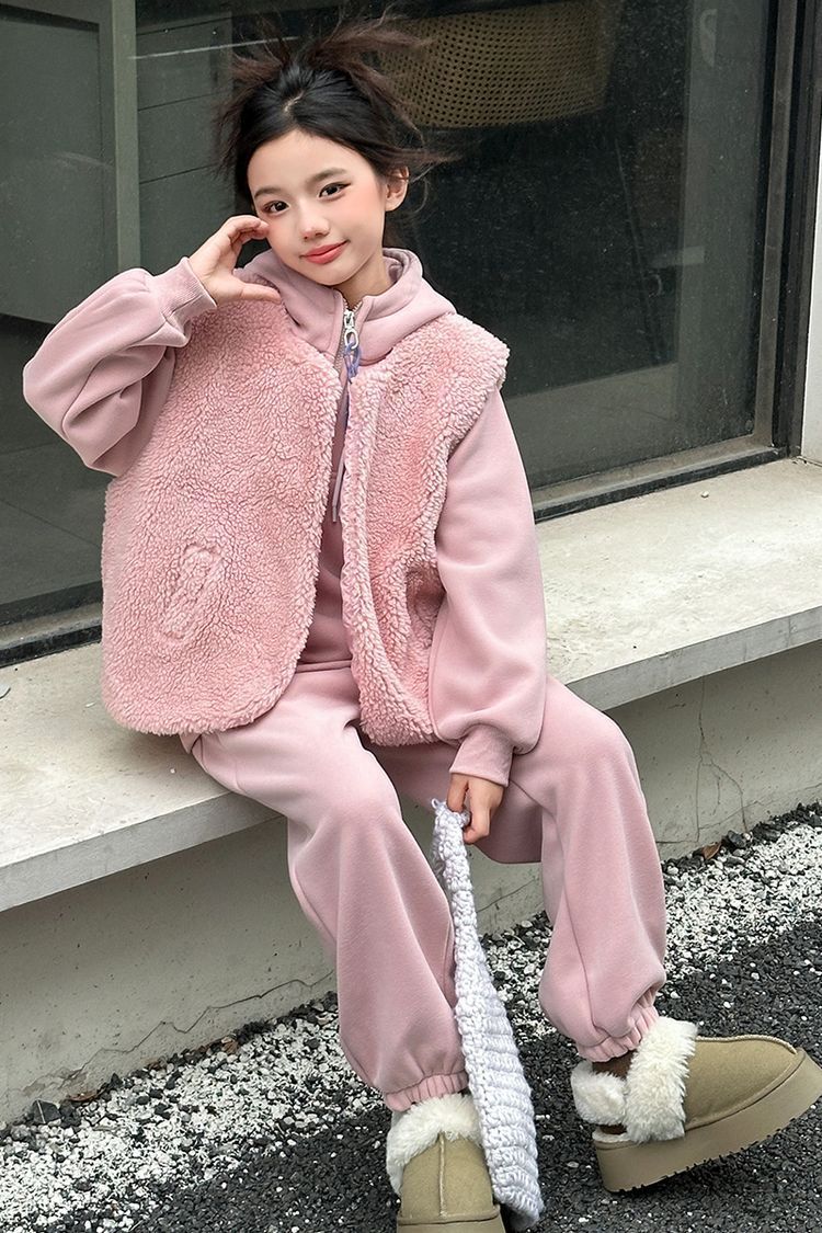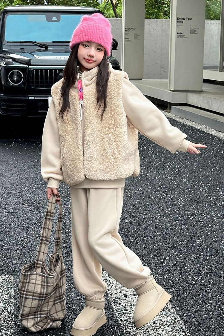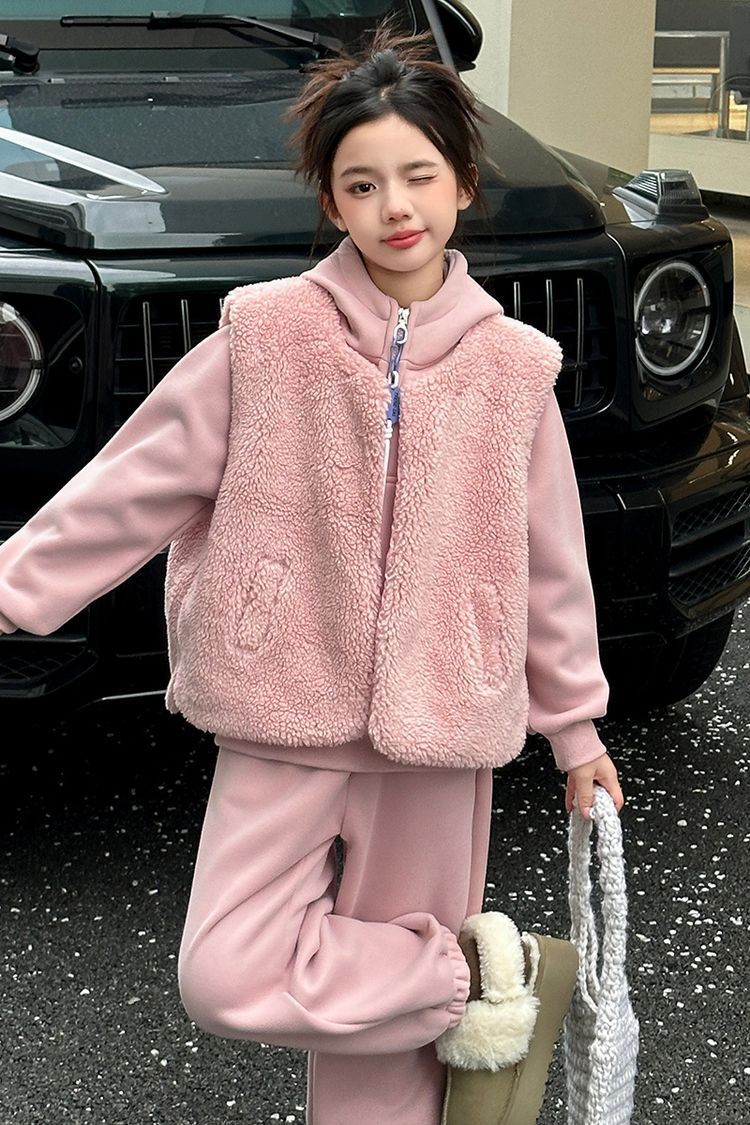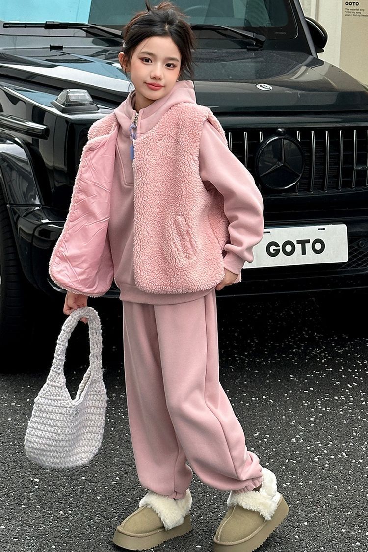 걸스 벨벳 세트 가을과 겨울 큰 어린이 후드 스웨트 운동복 두꺼운 따뜻한 양고기 울 조끼 3 피스 세트