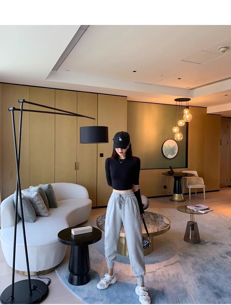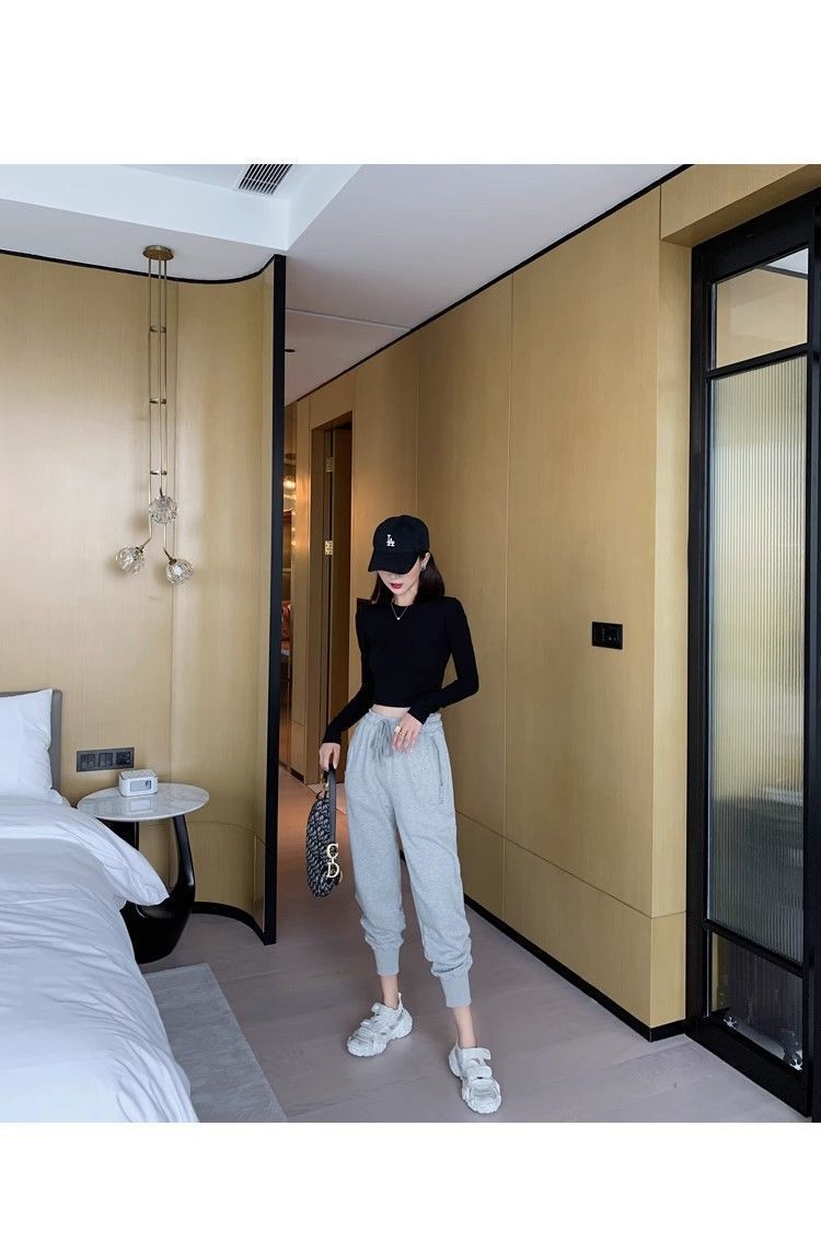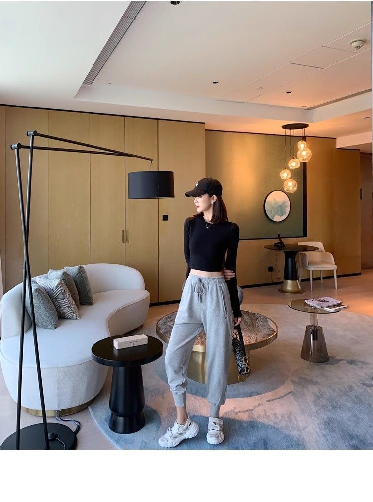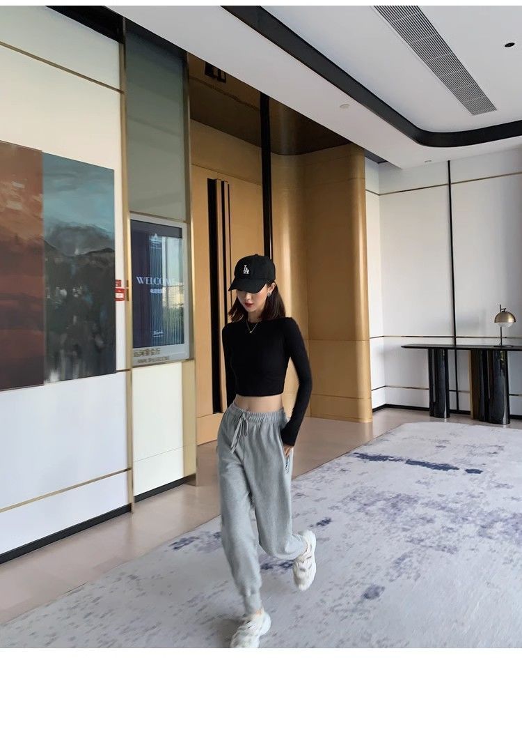 스파이스 걸스 블랙 크루 넥 긴팔 보텀 셔츠 배벨 티셔츠 여성용 세련된 슬림 핏 이너 짧은 하이 웨이스트 탑 인 트렌디스토어 가기