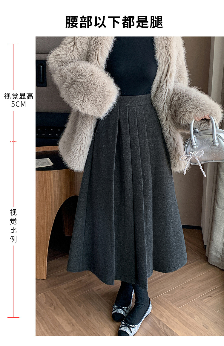 2025 가을 겨울용 플리츠 스커트, 하이웨이스트 A라인, 허리라인을 가려주는 주름 디자인, 슬림한 모직 미디 스커트