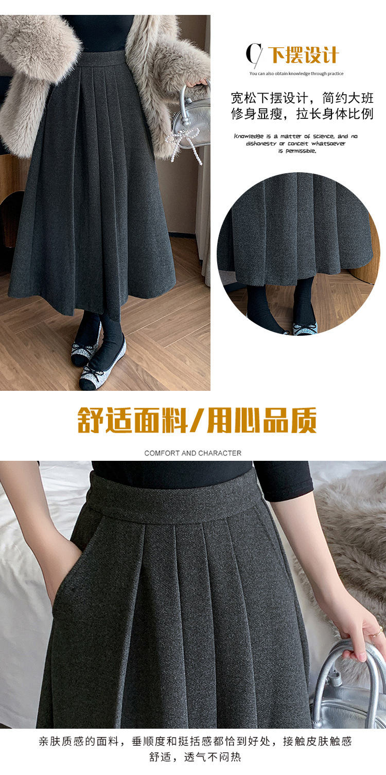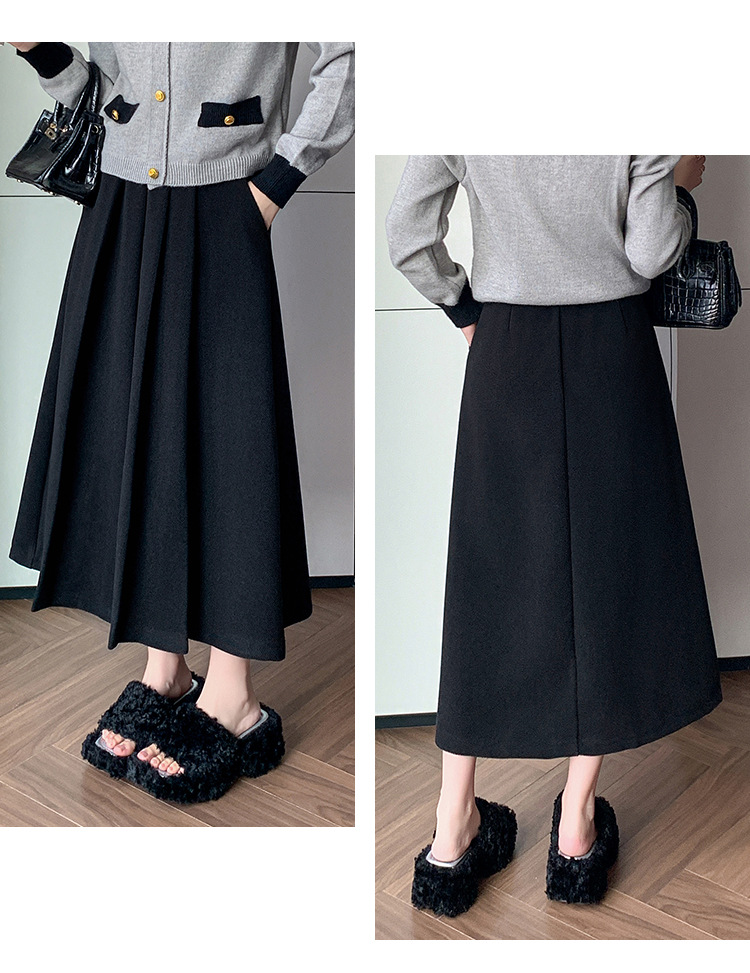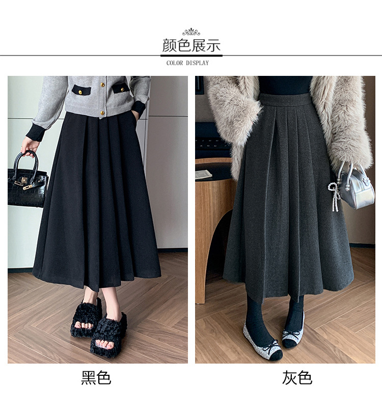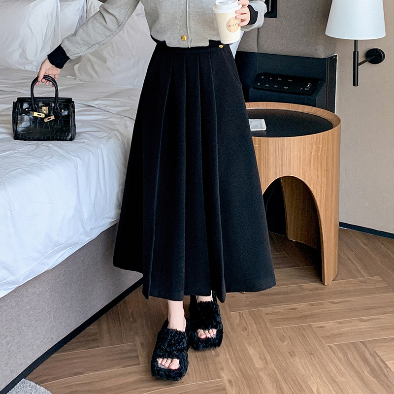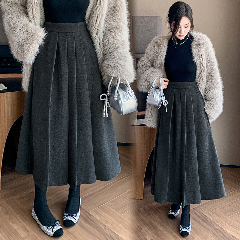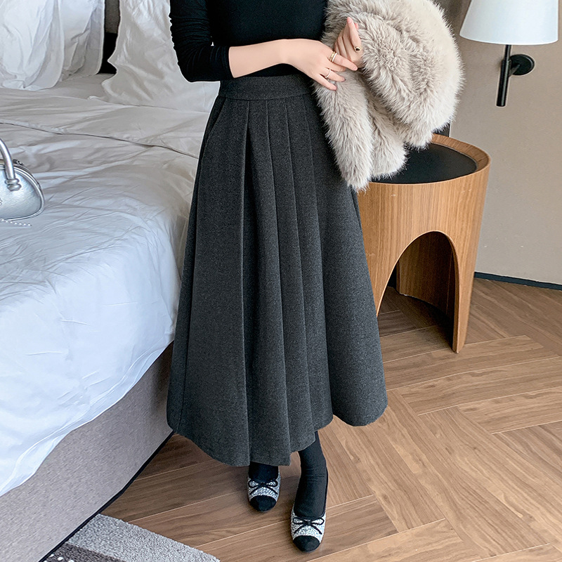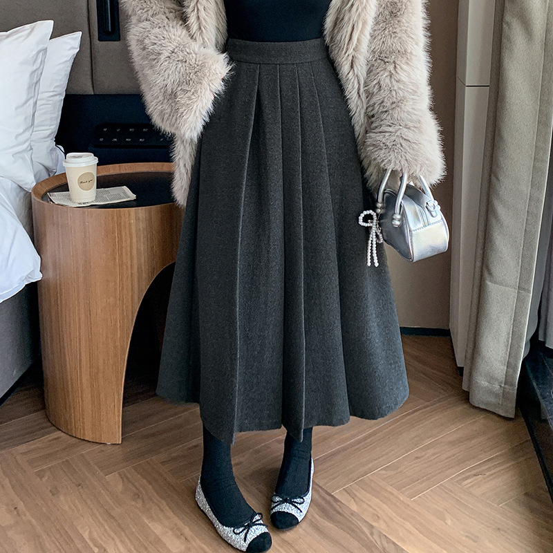 가을과 겨울을위한 재고 모직 주름 치마 2024 높은 허리 A 자형 대형 스윙 주름 엉덩이 슬리밍 울 중간 길이의 절반 길이