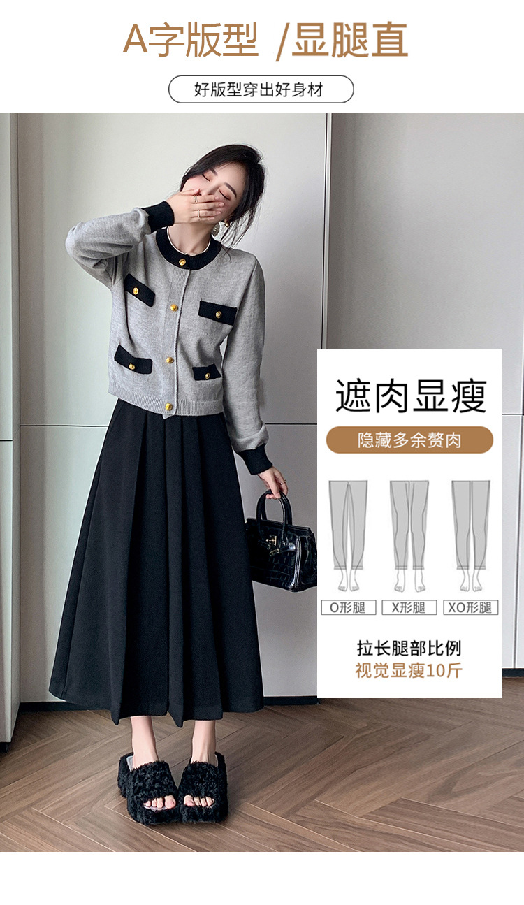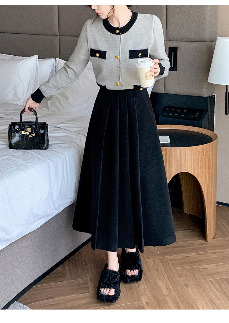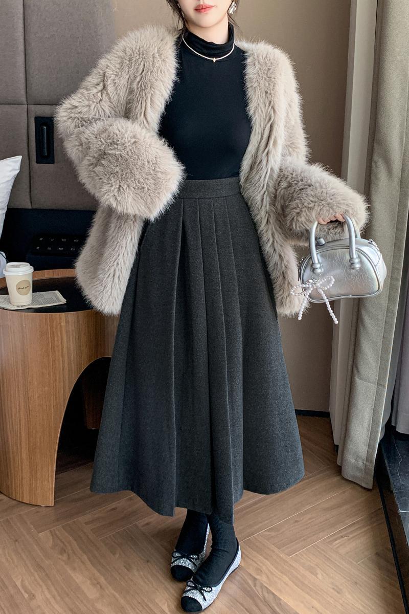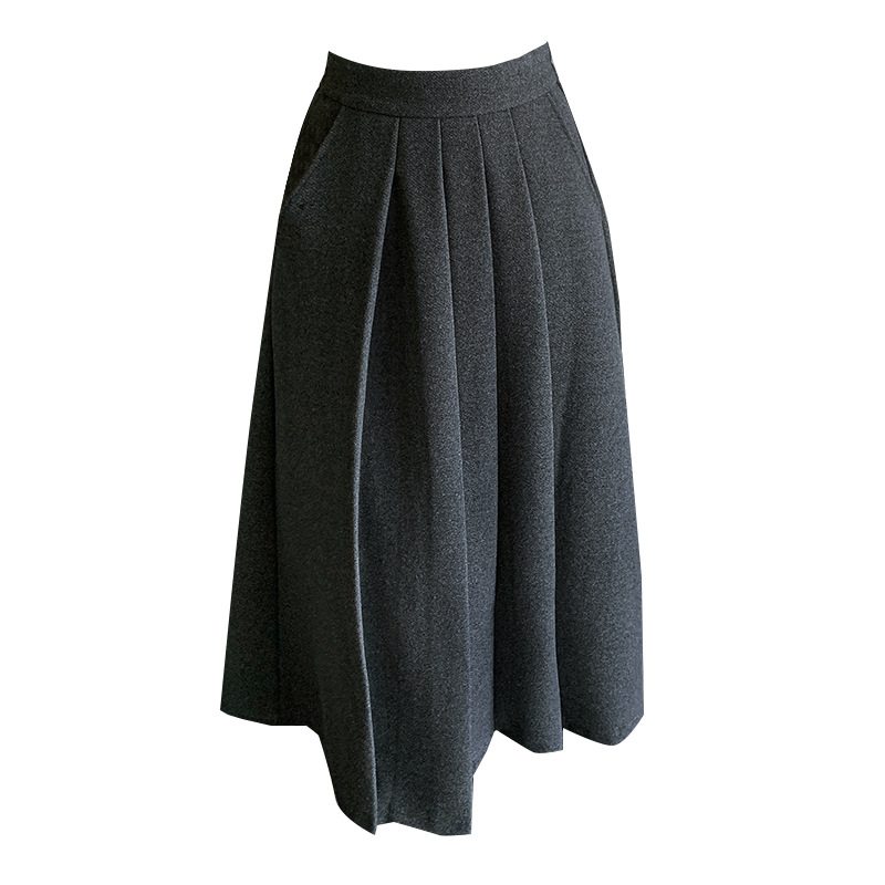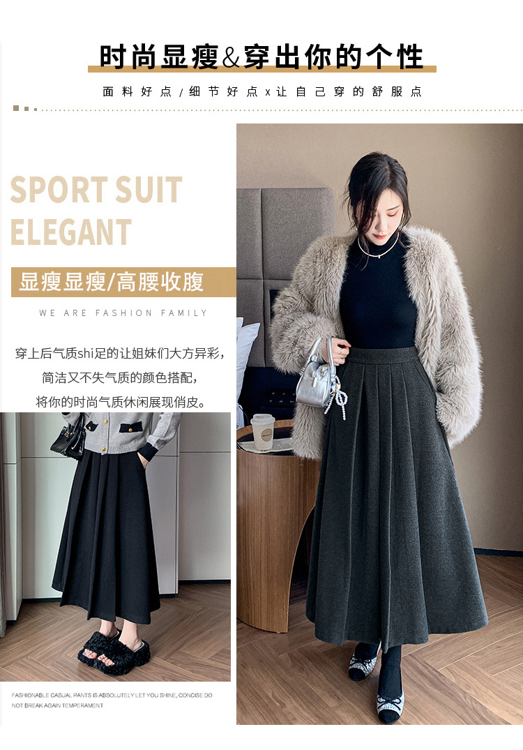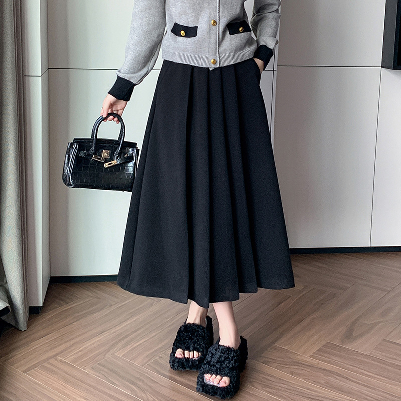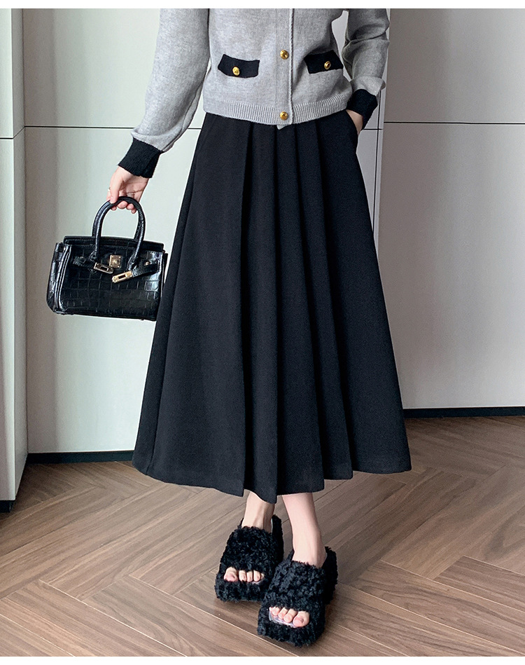 가을과 겨울을위한 재고 모직 주름 치마 2024 높은 허리 A 자형 대형 스윙 주름 엉덩이 슬리밍 울 중간 길이의 절반 길이