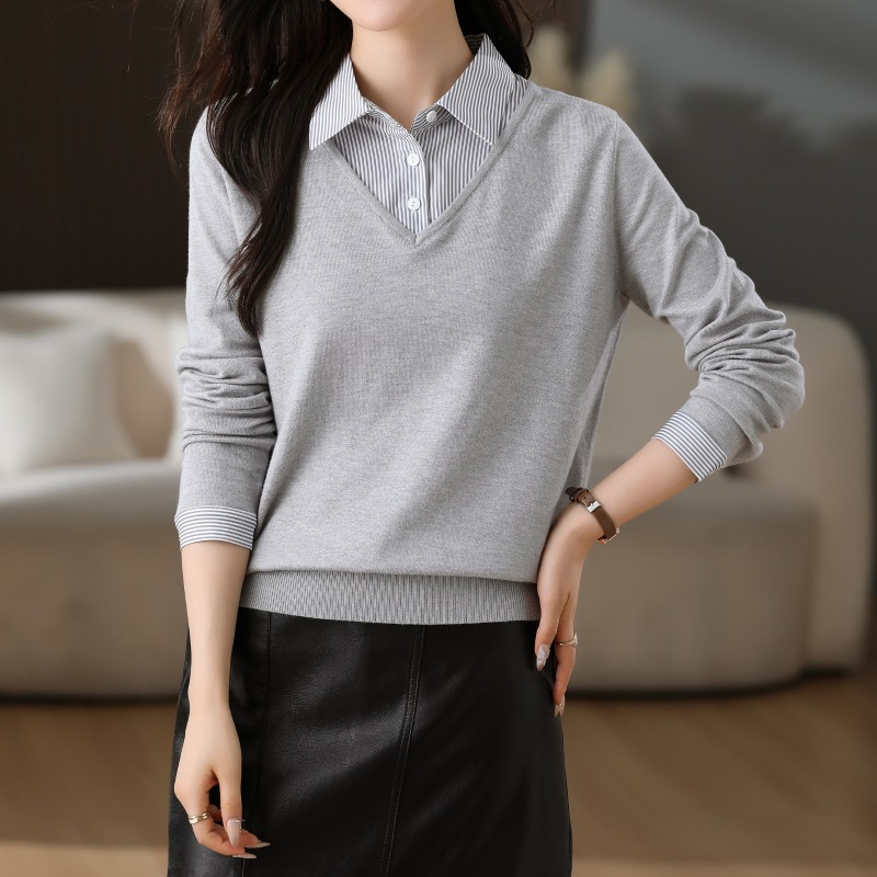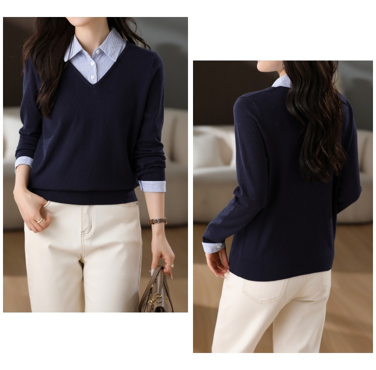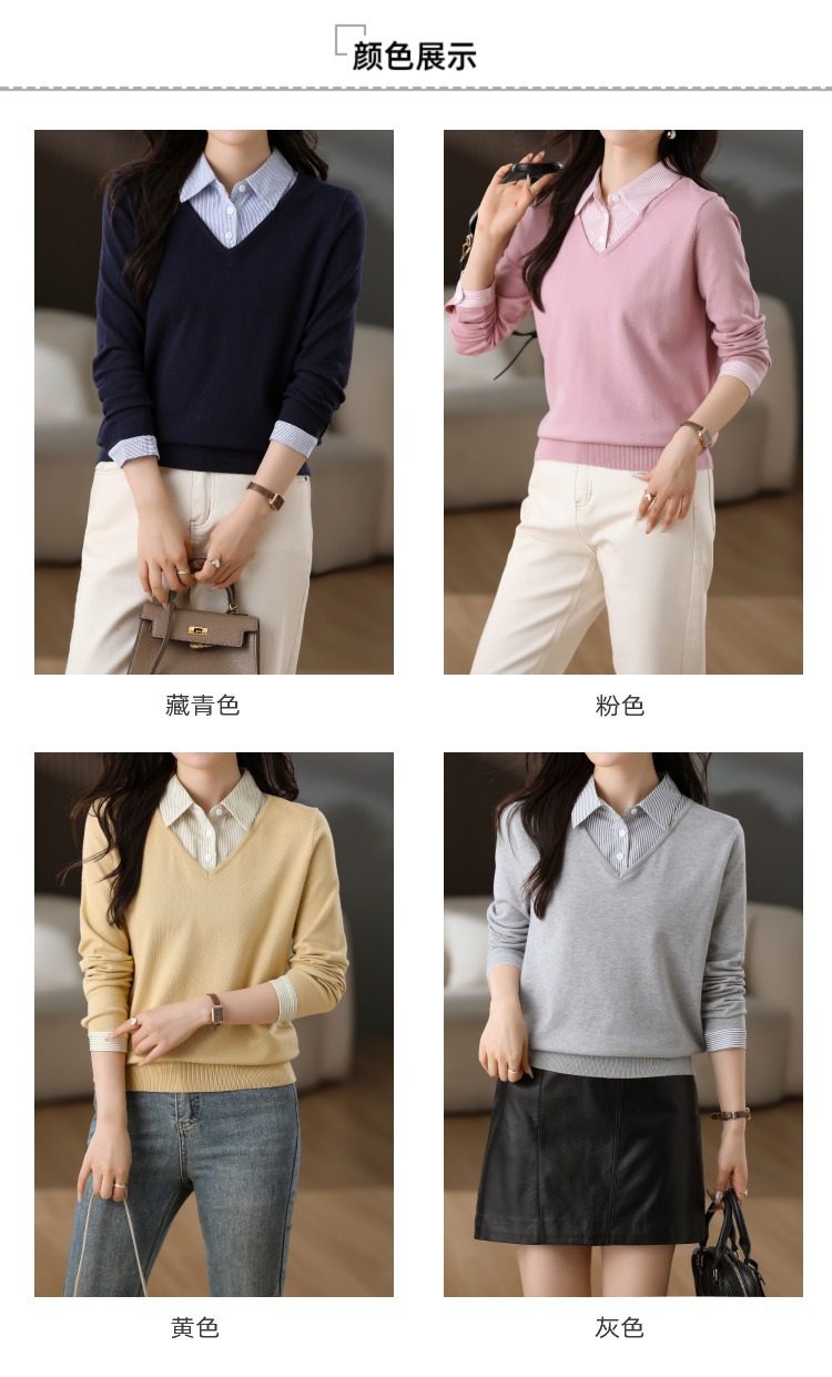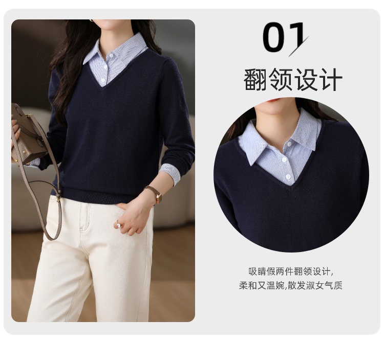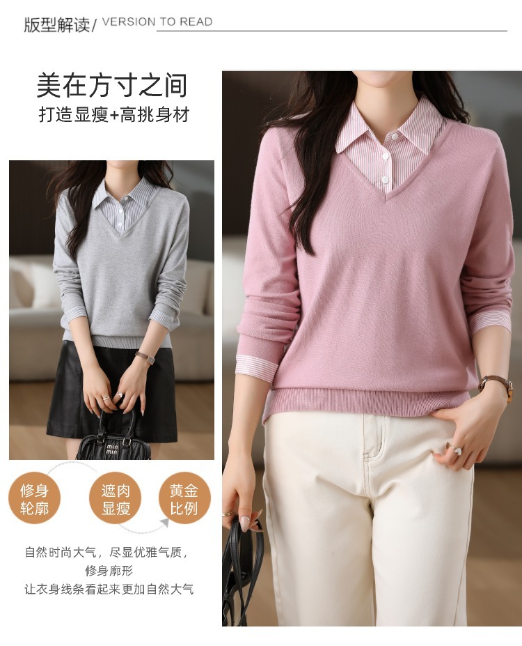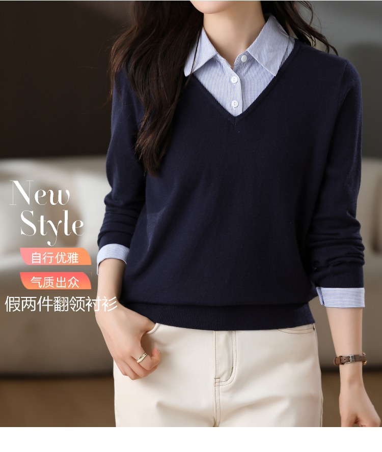 리얼 샷 가짜 2 피스 니트웨어 여성용 2024 가을과 겨울 새로운 디자인 센스 긴 소매 스웨터 셔츠 칼라 베이스 탑