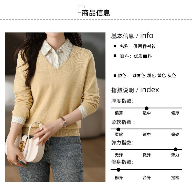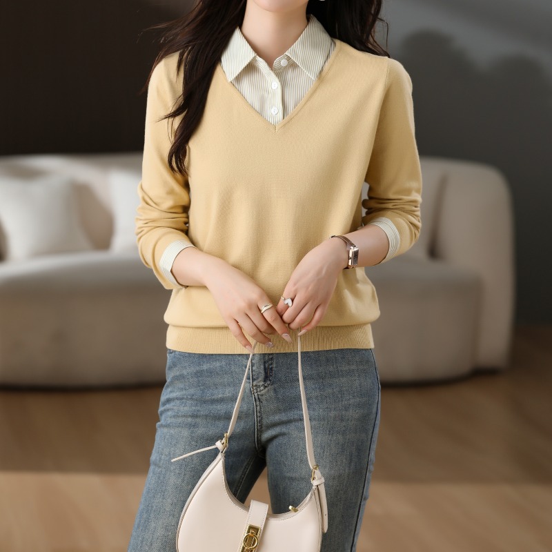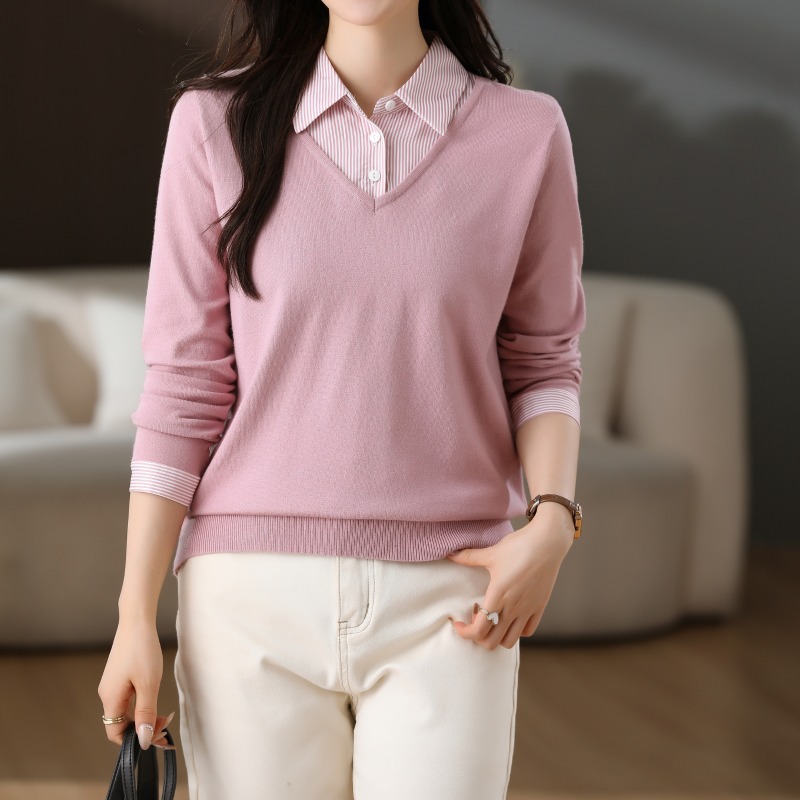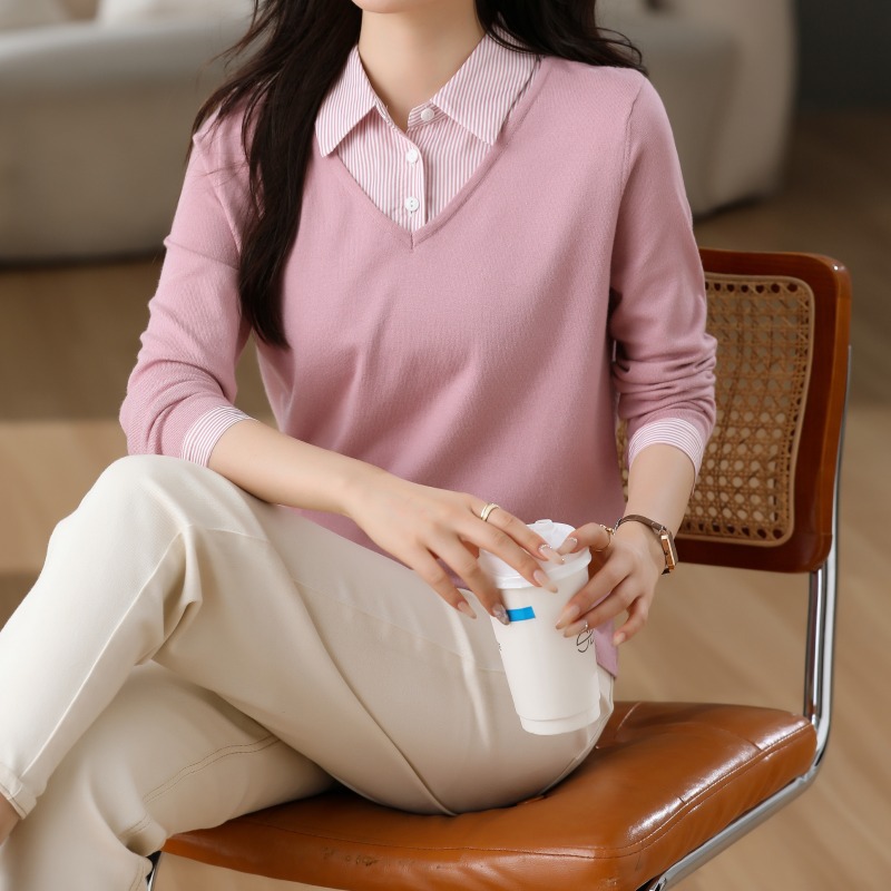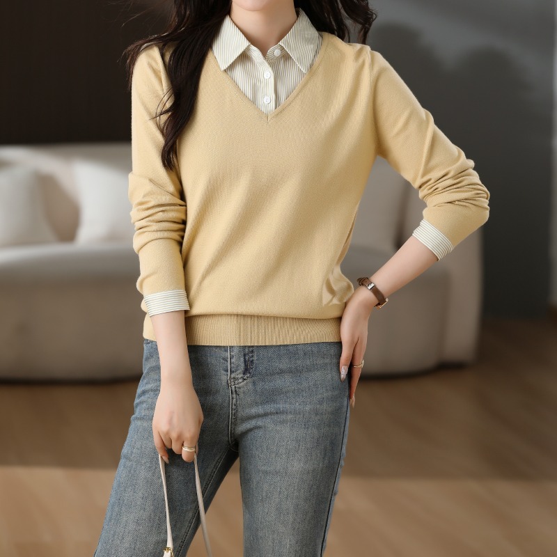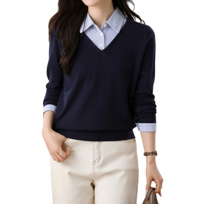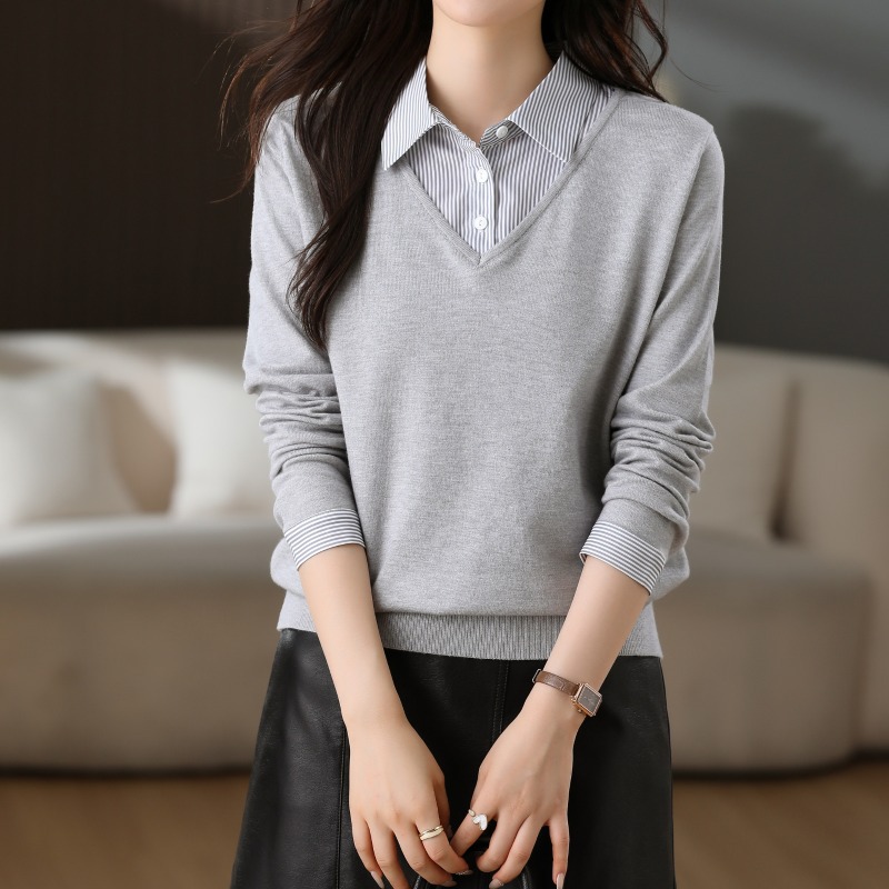 리얼 샷 가짜 2 피스 니트웨어 여성용 2024 가을과 겨울 새로운 디자인 센스 긴 소매 스웨터 셔츠 칼라 베이스 탑