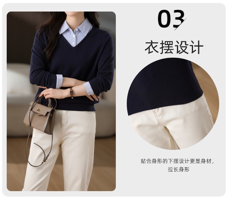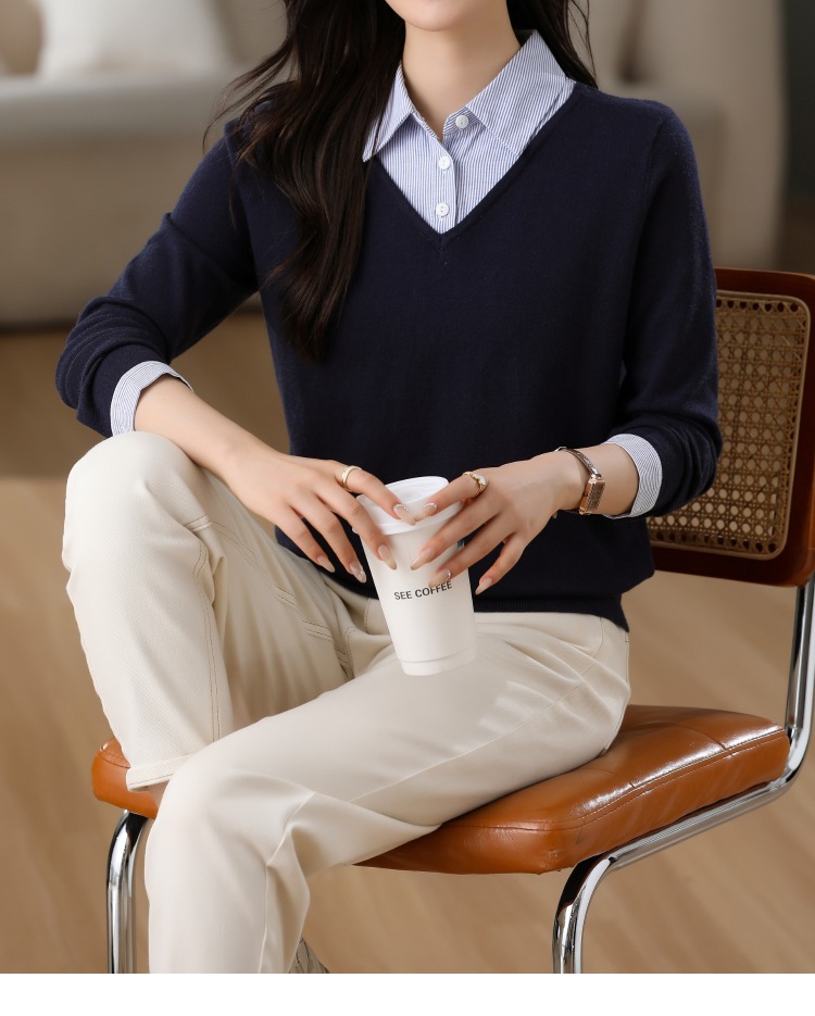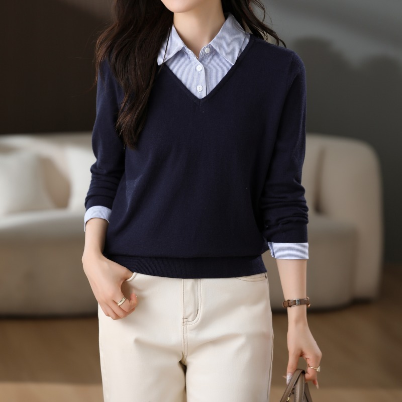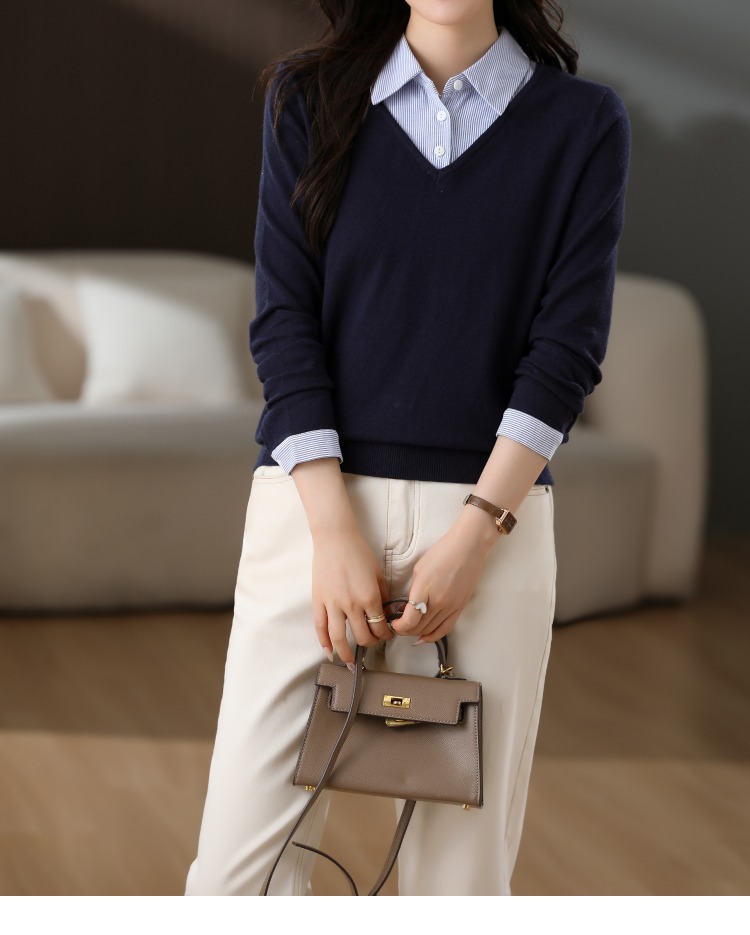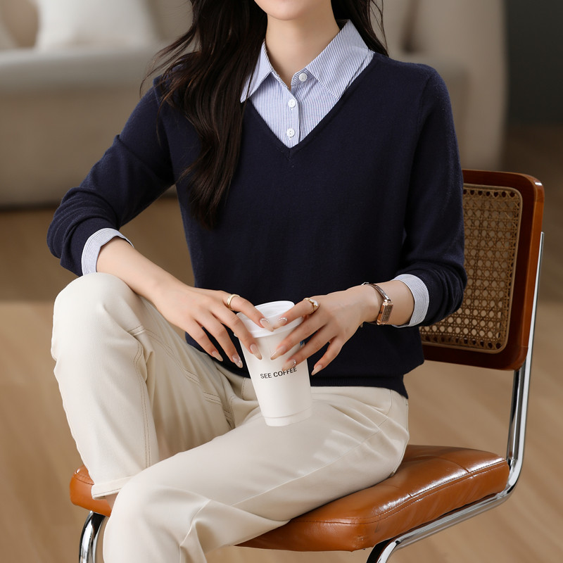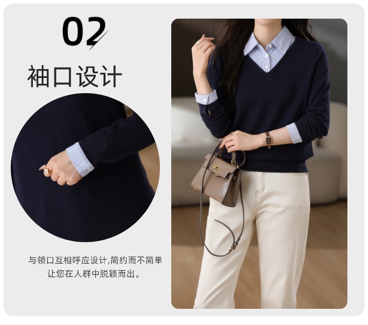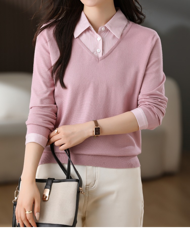 리얼 샷 가짜 2 피스 니트웨어 여성용 2024 가을과 겨울 새로운 디자인 센스 긴 소매 스웨터 셔츠 칼라 베이스 탑