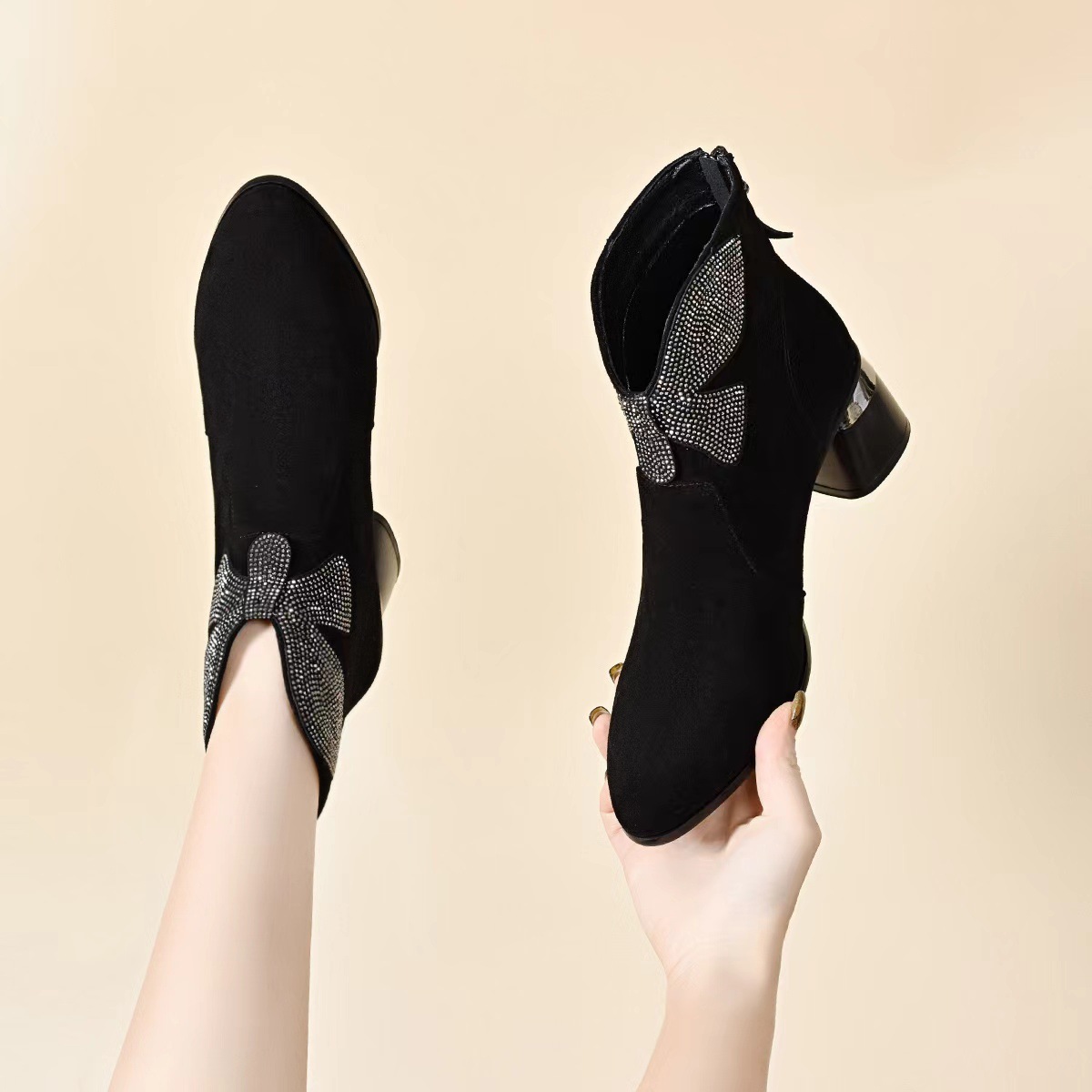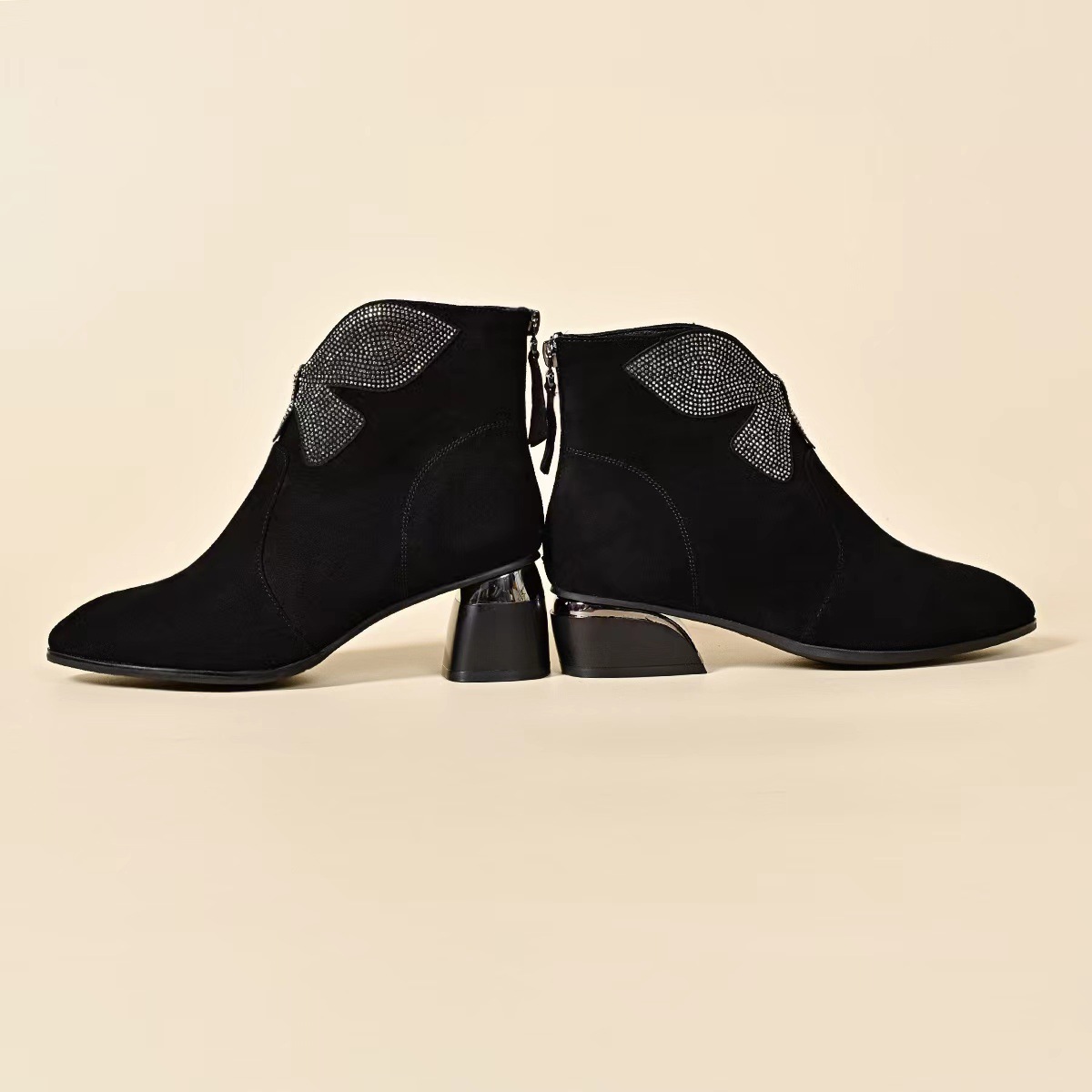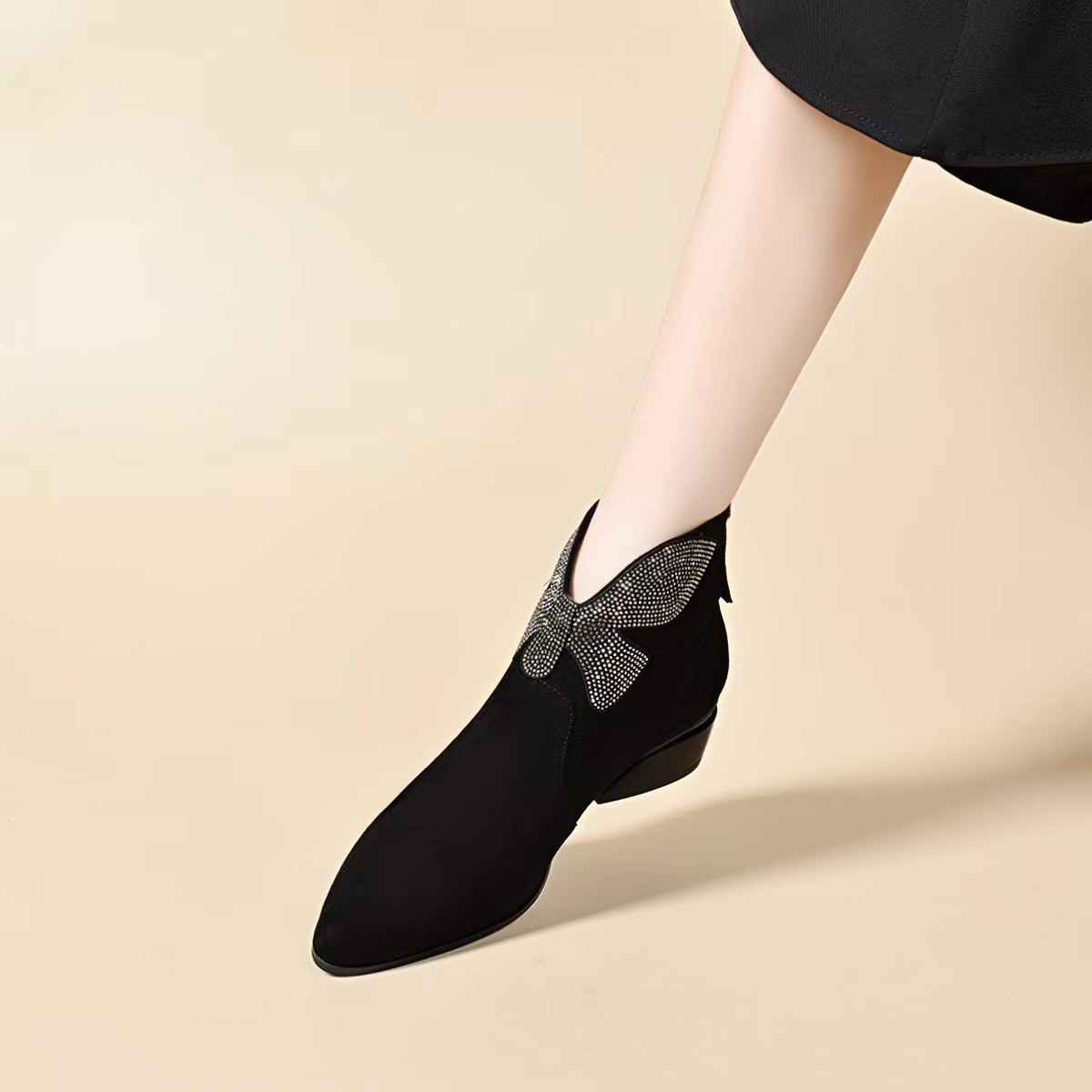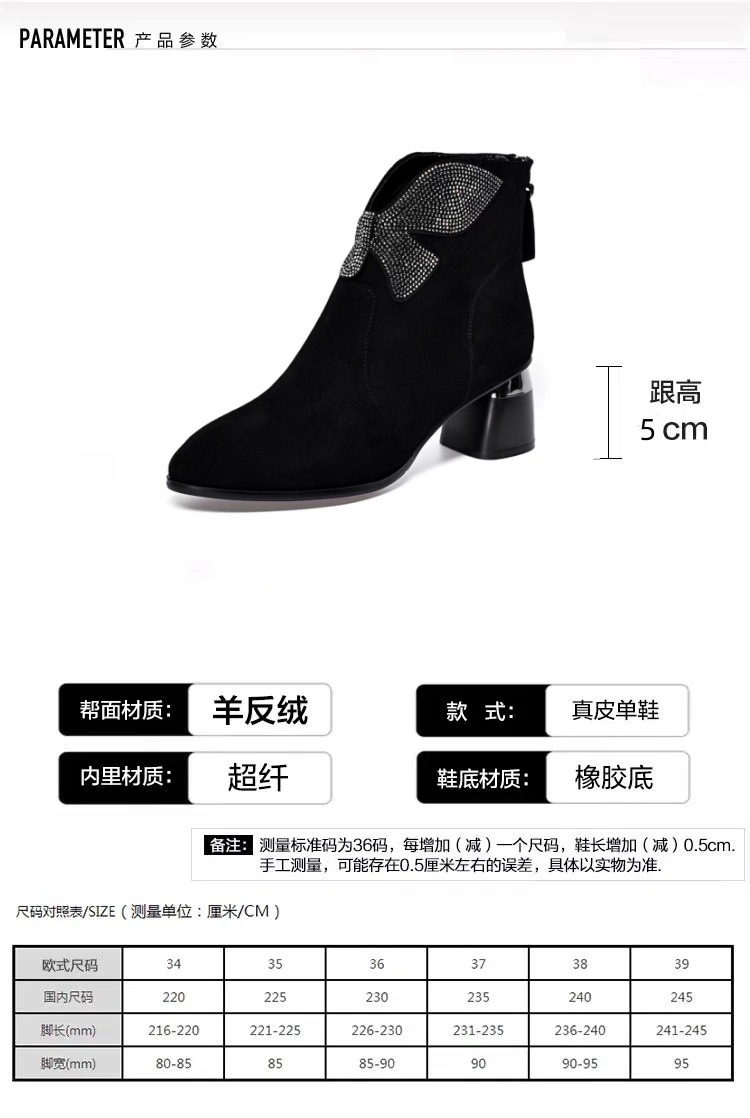정품 가죽 포인팅 두꺼운 힐 발목 부츠 여성 로우 힐 프로스트 가죽 활 가을 및 겨울 2024 올 매치 마틴 부츠 여자 기모스토어 가기