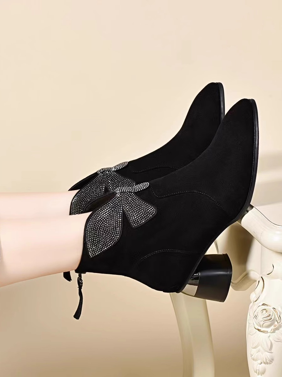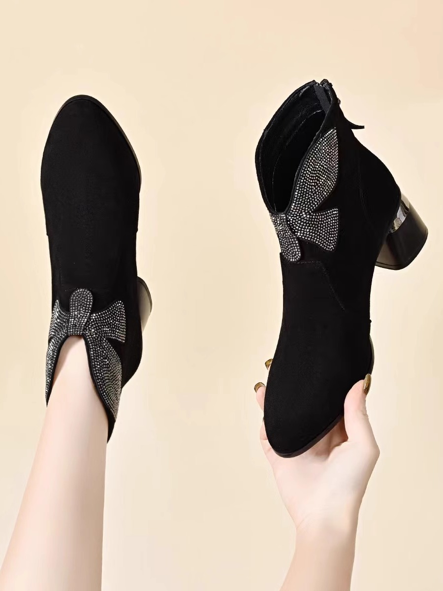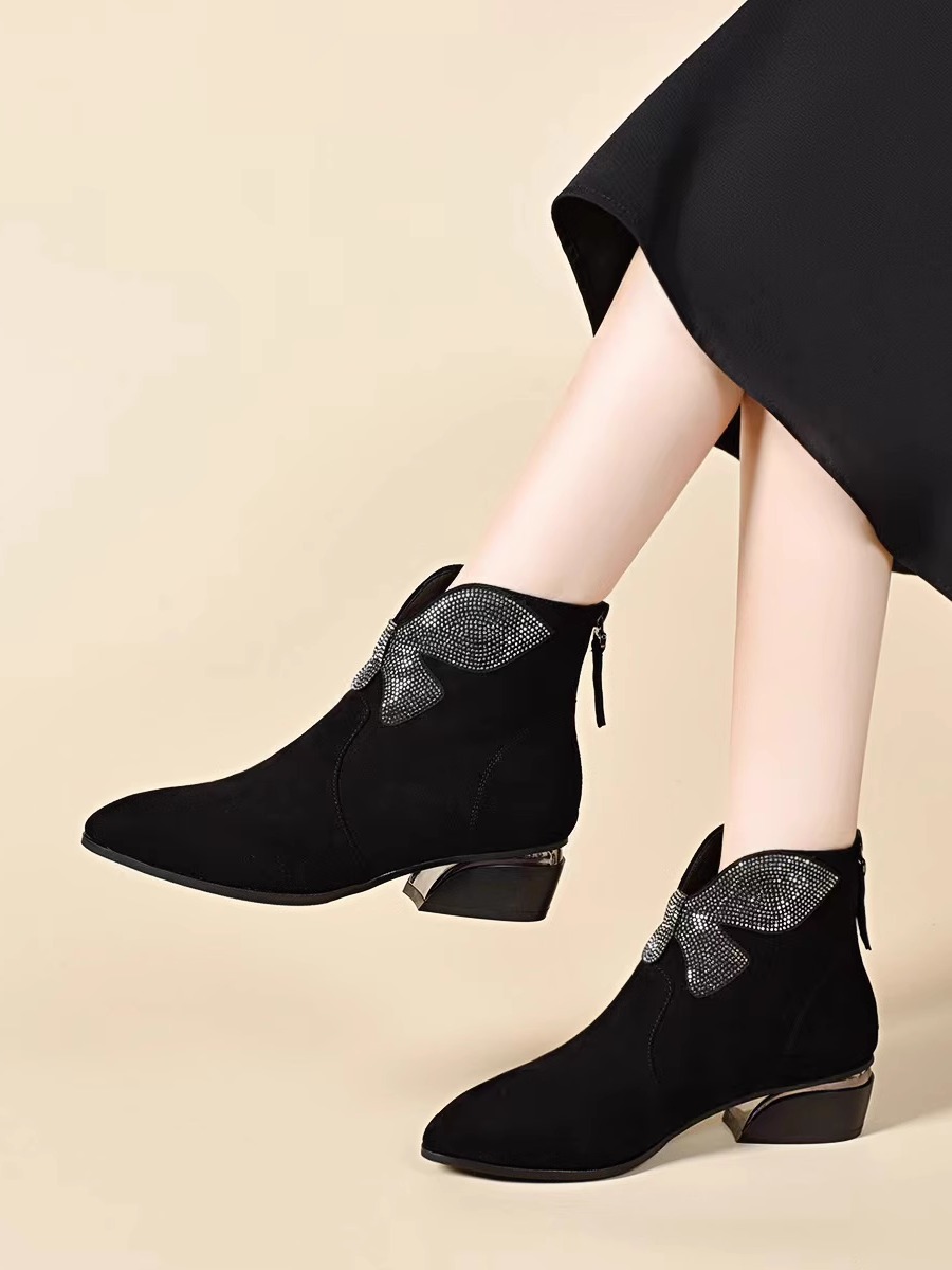 정품 가죽 포인팅 두꺼운 힐 발목 부츠 여성 로우 힐 프로스트 가죽 활 가을 및 겨울 2024 올 매치 마틴 부츠 여자 기모스토어 가기