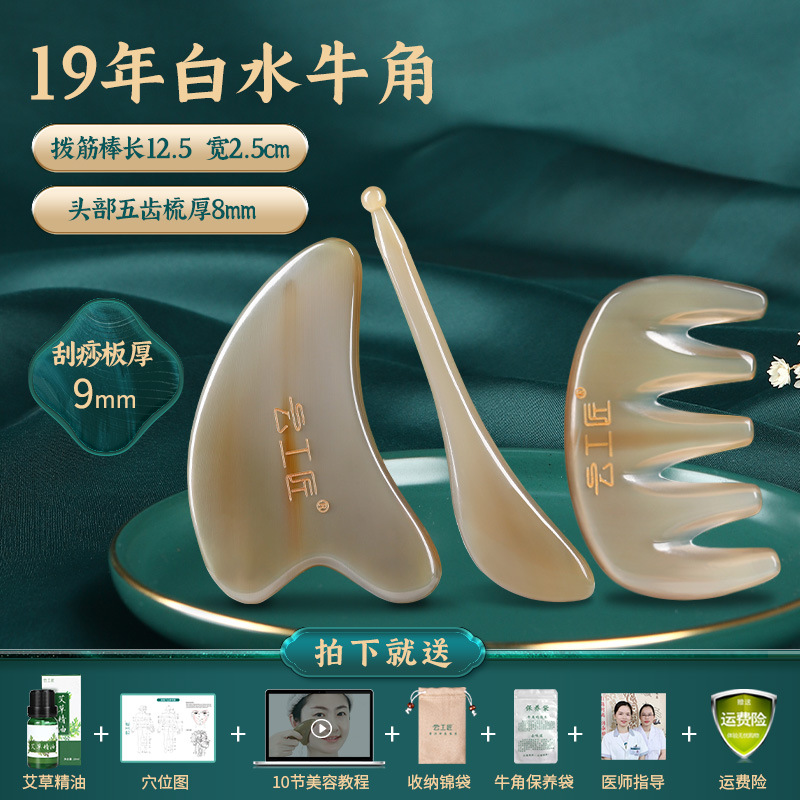 구름 장인 흰색 버팔로 경적 힘줄 얼굴 눈 마사지 스틱으로 막대 얼굴을 잡아 당겨 머리 미용 판을 긁어냅니다.
