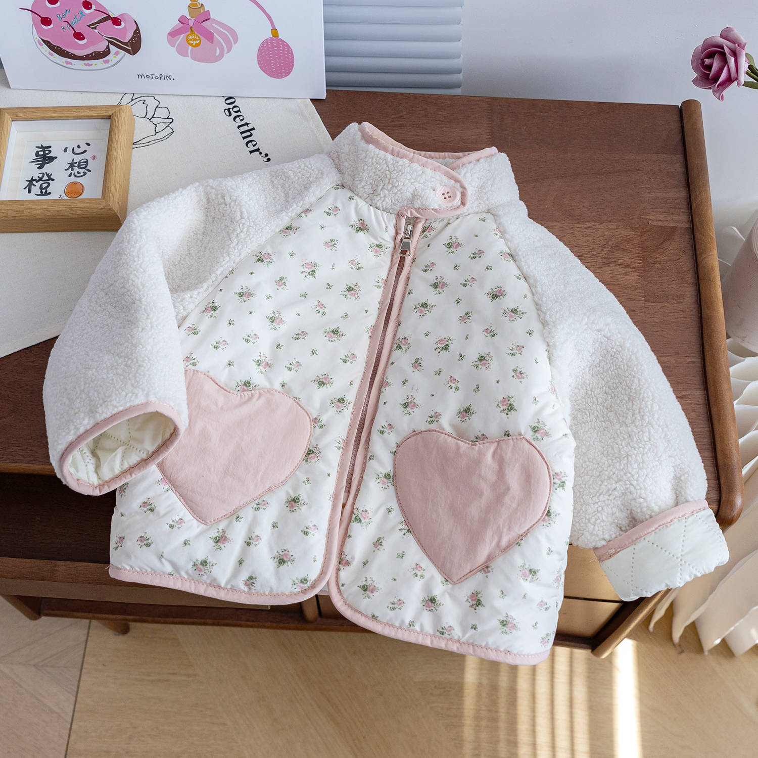 2025 겨울 소녀 벨벳 두꺼운 사랑 포켓 꽃 면화 재킷 아기 소녀 양면 벨벳 따뜻한 면화 재킷