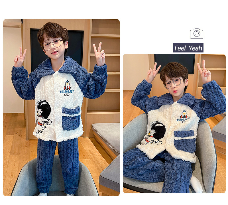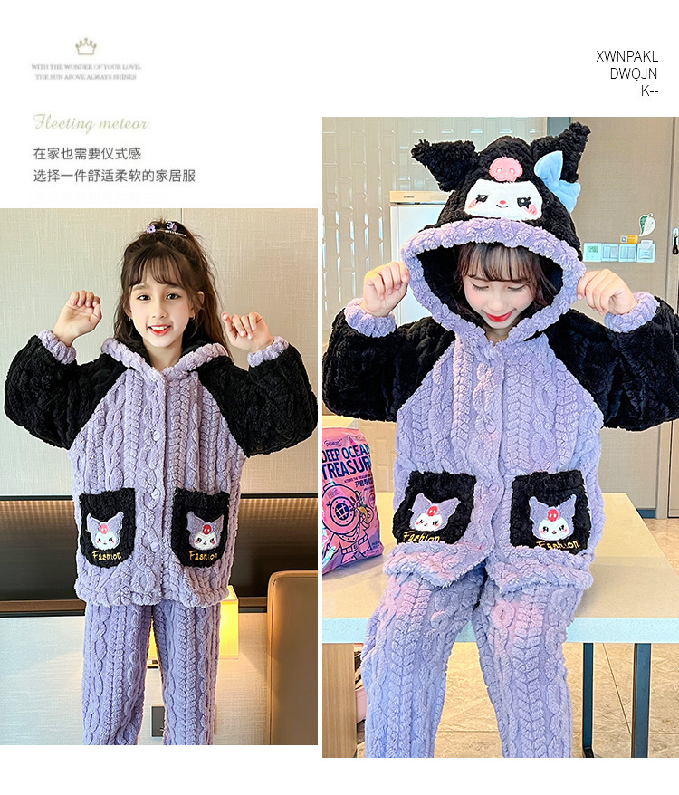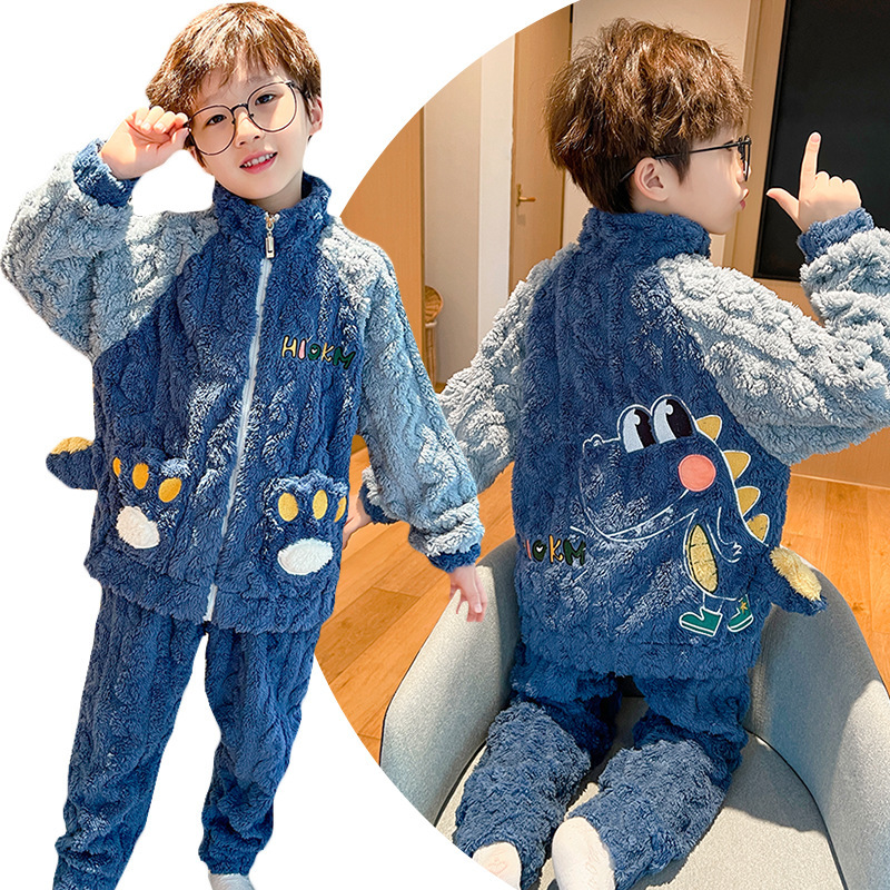 소년의 새로운 가을과 겨울 어린이 잠옷 소녀 자카드 양털 만화 두꺼운 산호 양털 후드 홈 의류 세트스토어 가기