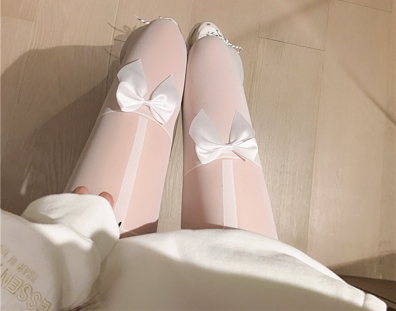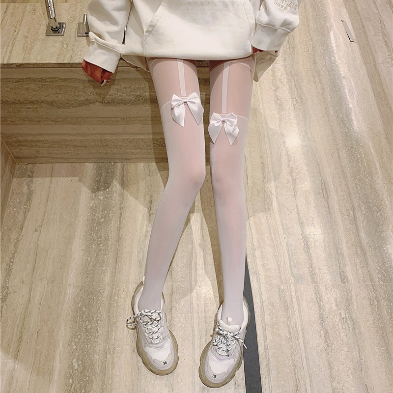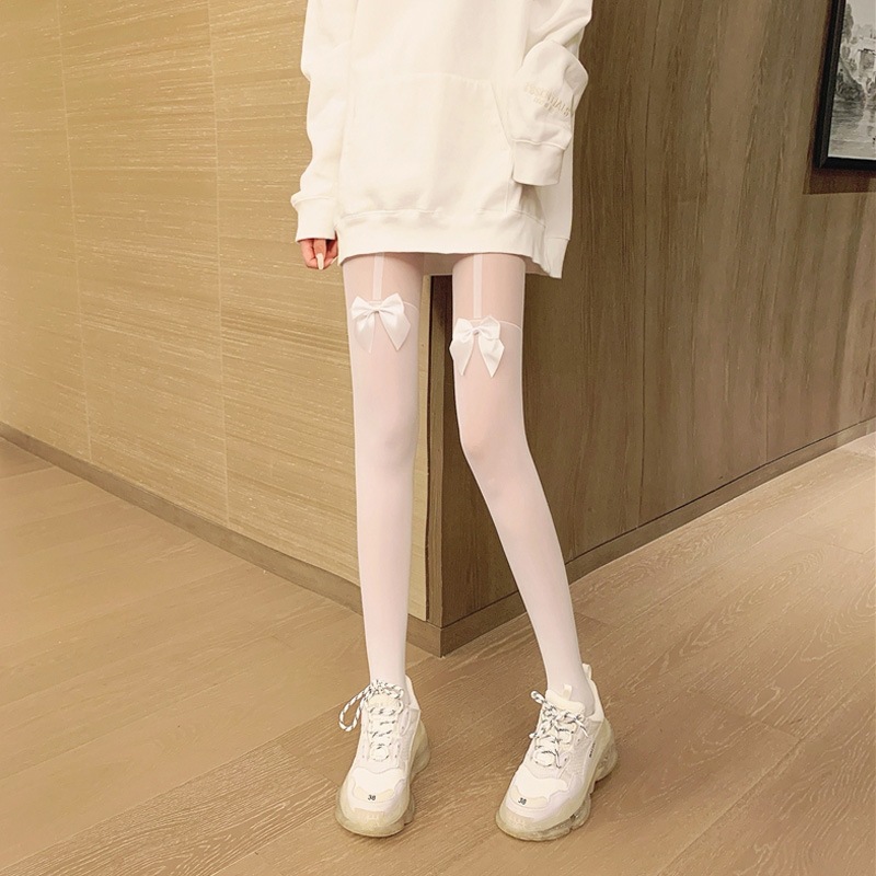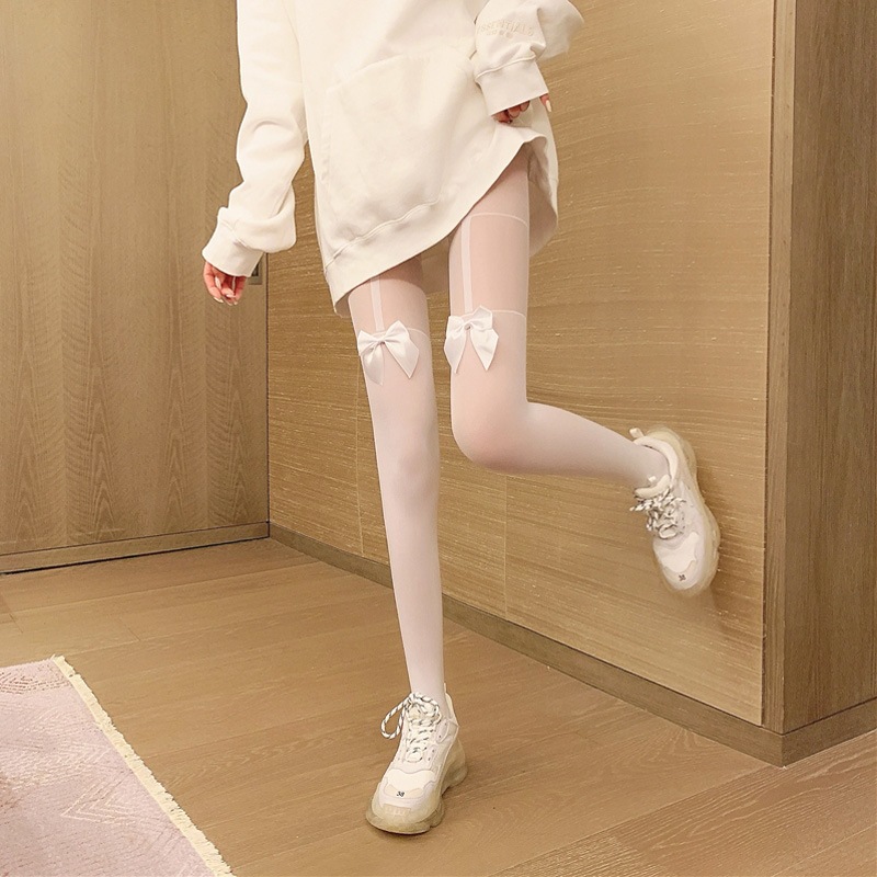 인터넷 인기 섹시한 활 무릎 가짜 높은 바지 스티칭 스트랩 블랙 바지 실크 스타킹 여성을위한 여름 봄 가을 얇은