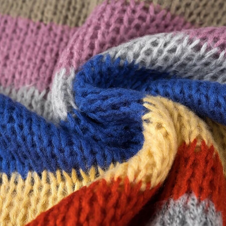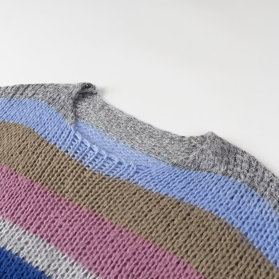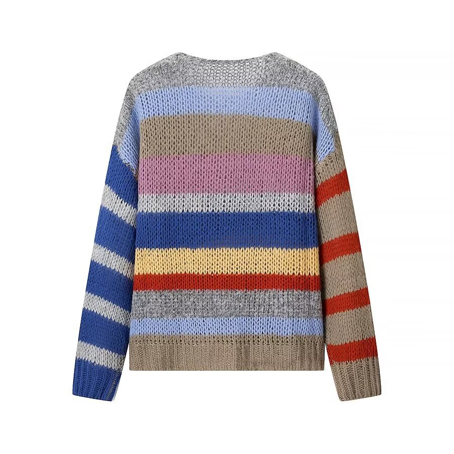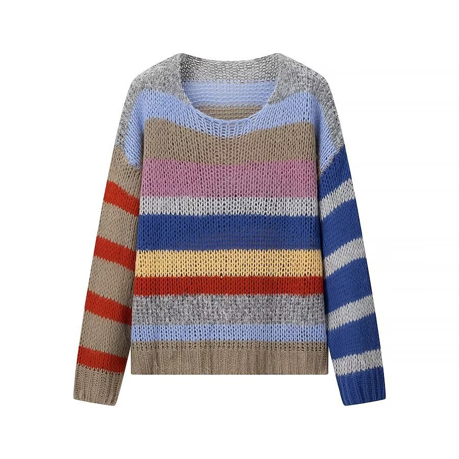 2024 유럽 및 미국 겨울 신상 패션, 나이를 줄여주는 다용도 라운드넥 긴팔 레인보우 스트라이프 니트 스웨터 여성용 2271