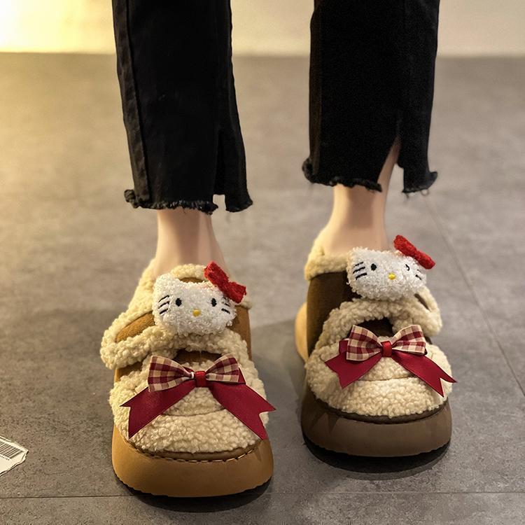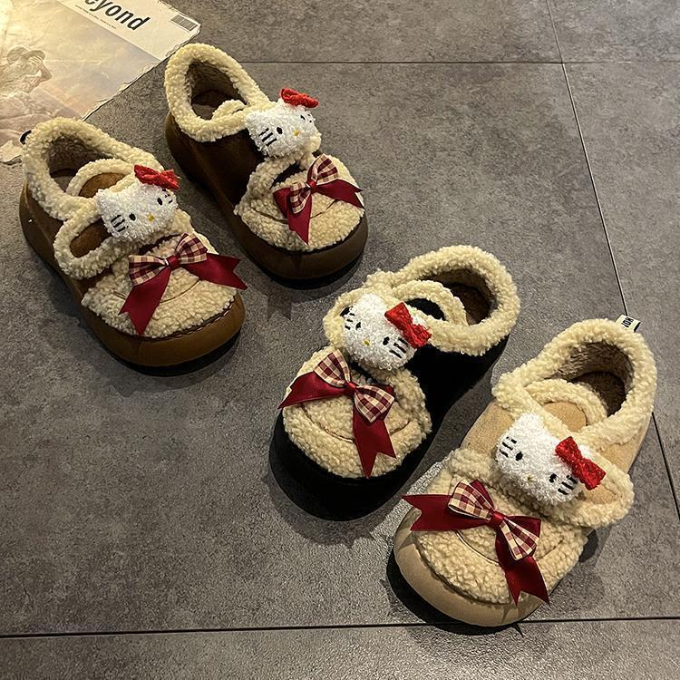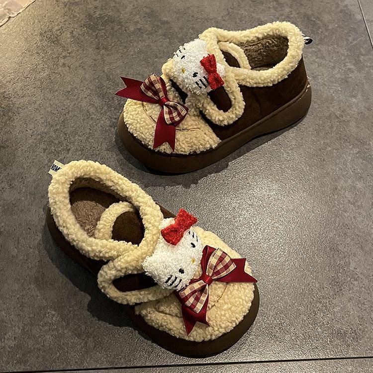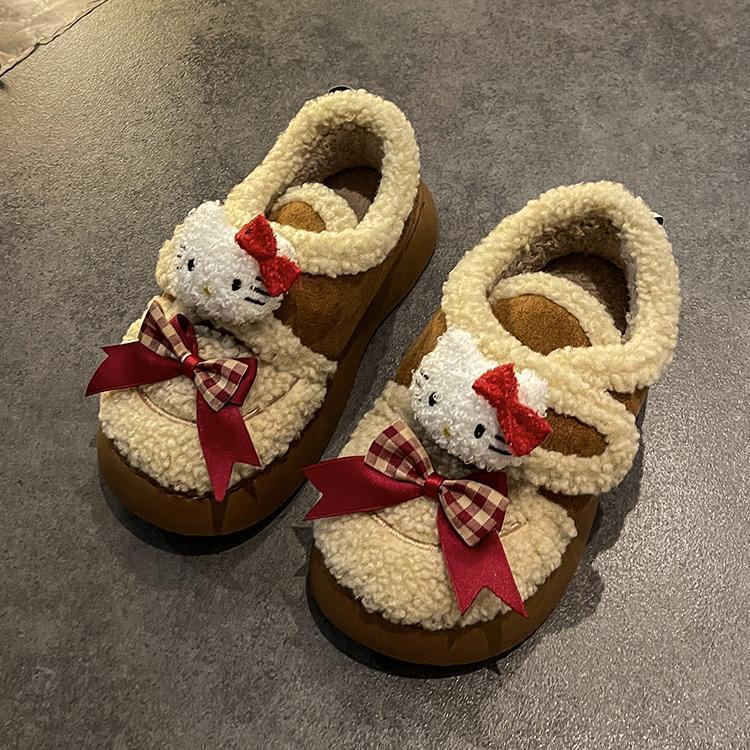 귀여운 벨크로 활 코튼 슬리퍼 여성의 2024 겨울 새로운 의상 두꺼운 밑창 기모 따뜻한 가방 뒤꿈치 코튼 슈즈