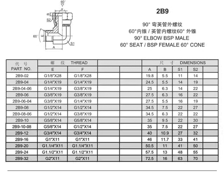 2B/2B9 연합 Yonghua 표준 영국 파이프 G 스트레이트 스레드 60 도 콘 스트레이트 팔꿈치 유압 오일 파이프