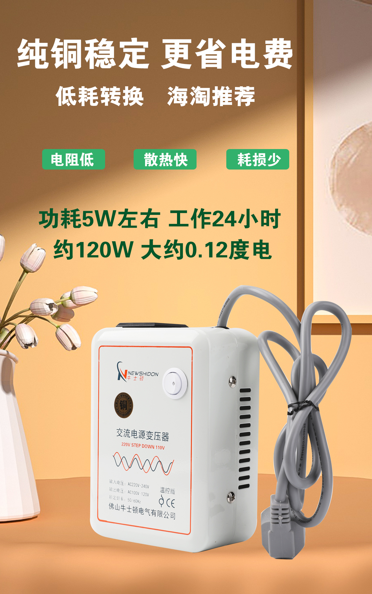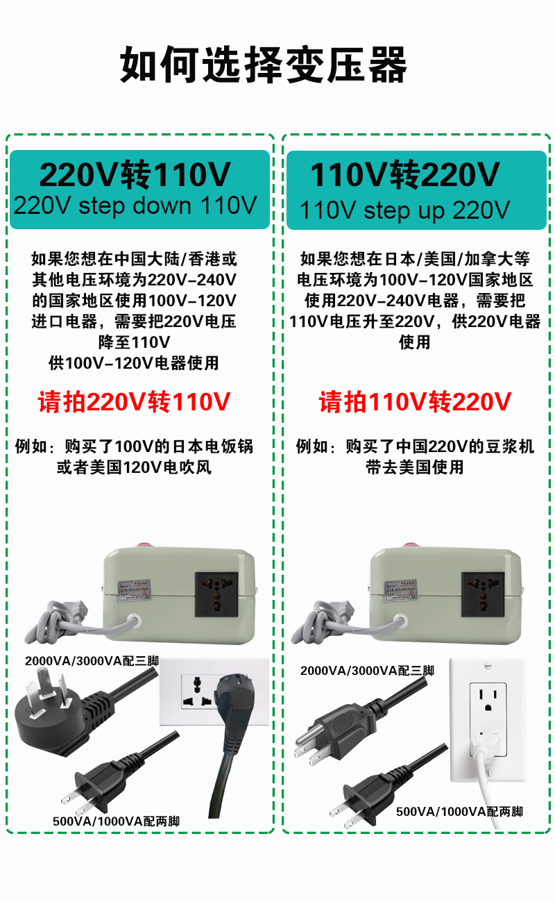 • 온도 조절 버전(110V ~ 220V2400VA)은 1200W 미만의 중국 전기 제품을 해외에서 사용하는 것이 좋습니다.
