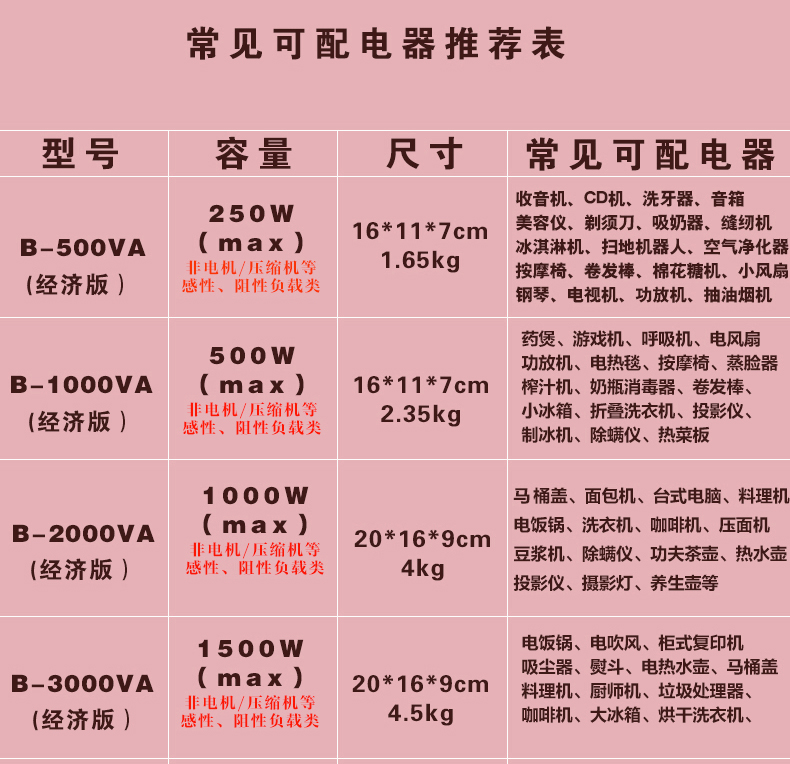 • 경제적인 버전(110V ~ 220V1000VA)은 500W 미만의 중국 전기 제품을 해외에서 사용하는 것이 좋습니다.