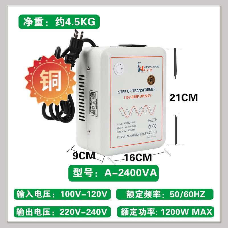 • 순수 구리 버전(110V ~ 220V2400VA)은 1200W 미만의 중국 전기 제품을 해외에서 사용하는 것이 좋습니다.
