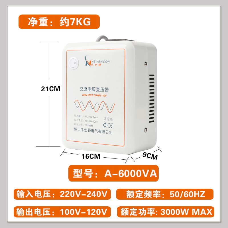 • 온도 조절 버전(220V ~ 110V6000VA)은 중국에서 3000W 미만의 전기 제품을 사용하는 것이 좋습니다.