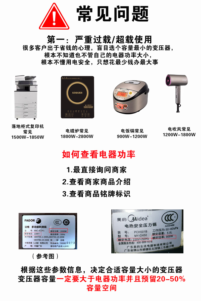 • 온도 조절 버전(220V ~ 110V3200VA)은 중국에서 1600W 미만의 외국 전기 제품을 사용하는 것이 좋습니다.