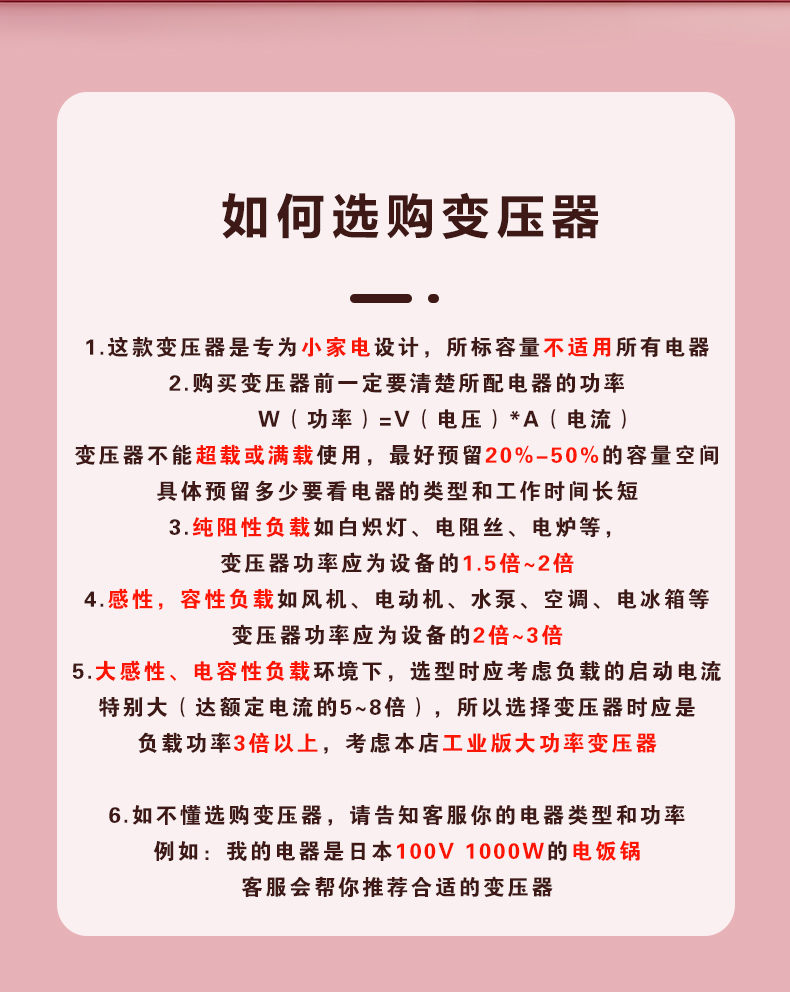 • 순수 구리 버전(220V ~ 110V6000VA)은 중국에서 3000W 미만의 외국 전기 제품을 사용하는 것이 좋습니다.