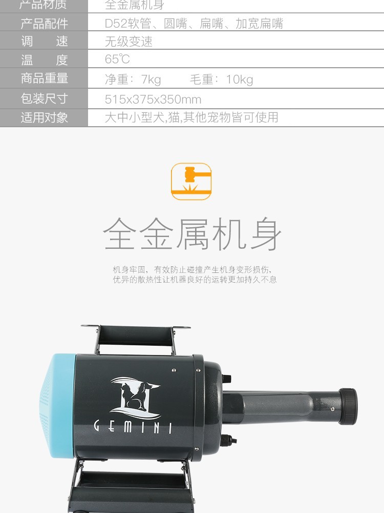 KISSGROOMING的研发团队对国际市场上目前所有的吹水机,进行了多年对比研究,精心设计制造了——TD-900CG GIMINI 双子座——这一吹打力、风速、风量、降噪效果、超长寿命和维护简易度,都是超强的双马达吹水机。