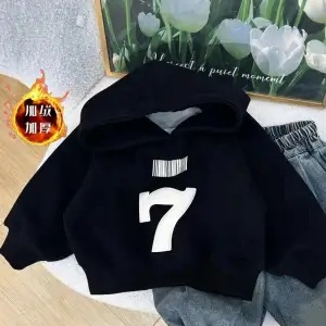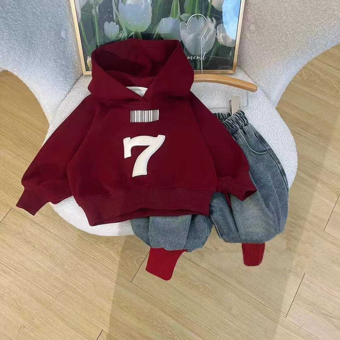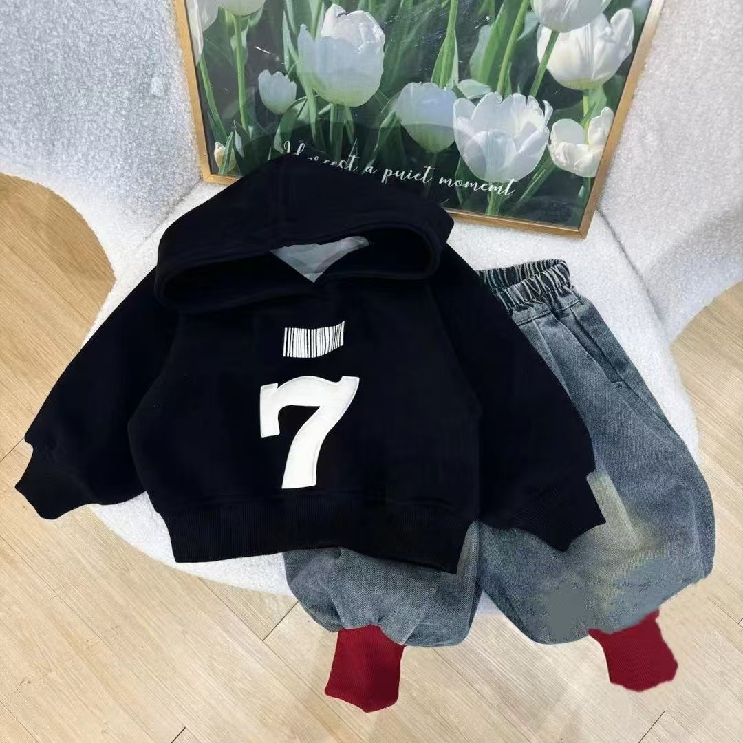 2024 년 새로운 소년 소녀 가을과 겨울 기모 스웨터 세트 한국 프린트 탑 트렌디 한 청바지 투피스 세트